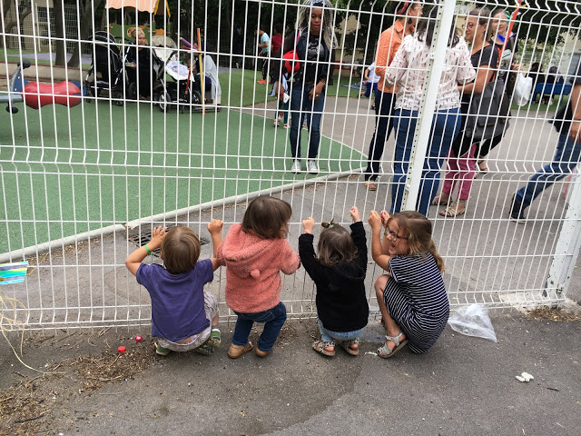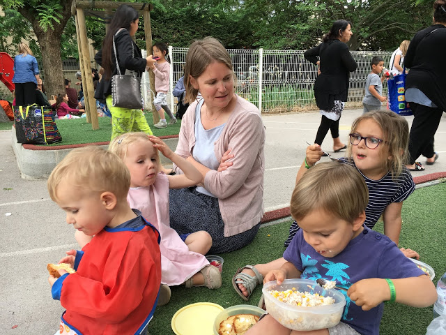 La soirée s’est finie avec un picnic dans la cour de l’école. Il y a eu de l’ambiance pour le retour, 4 dans le cargo, la séparation et le coucher plus difficile. Et demain, école…