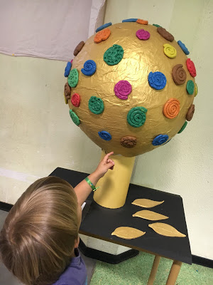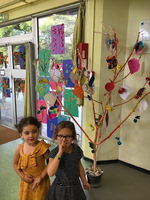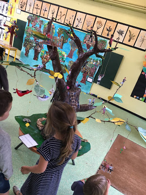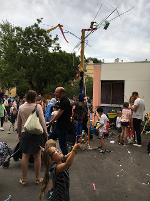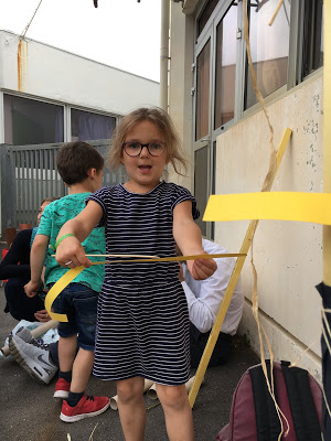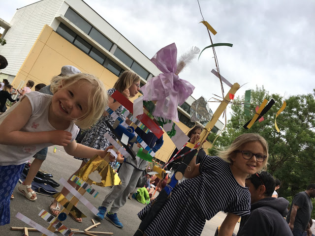 Le thème de la fête de cette année était les arbres, ou plutôt les bizarbres. Comme l’année dernière, nous avons été mis à contribution pour le chantier : chaque enfant, entouré de sa famille a construit un arbre, avec du matériel fourni par l’école et/ou amené par la famille. J’étais seule avec Émile et Lucie, donc notre construction de cette année a une certaine allure !
