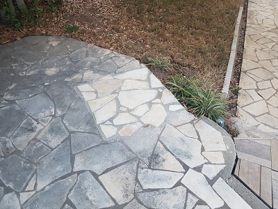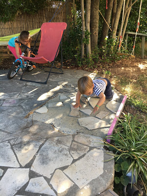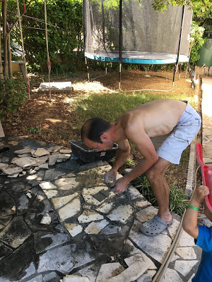 Ce week-end, Thomas a retiré le vieux bas de douche en béton qui était scellé au milieu de la terrasse sous les arbres, pour le remplacer par des dalles de bavière. Heureusement qu’il a eu l’aide d’Émile ! Il a spontanément décidé de placer les dalles sur le carré que Thomas avait préparé 😉