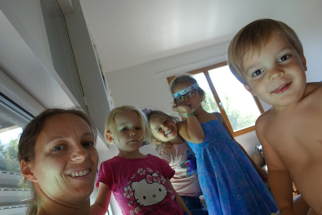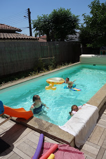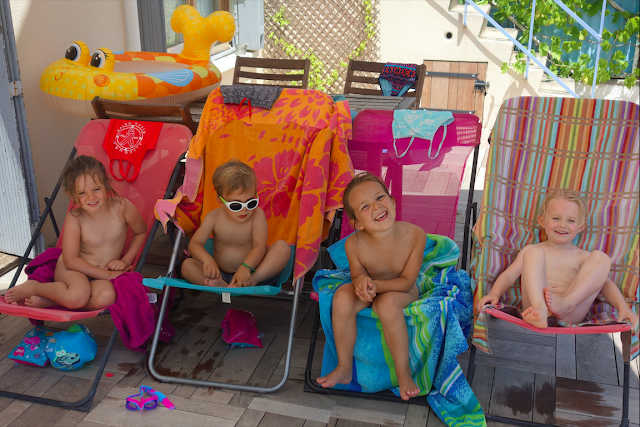 Nous sommes restés au frais toute la journée (= dans la maison avec la clim), sauf le temps d’un petit plouf à peine rafraichissant tellement la chaleur était étouffante ! Les enfants ont à peine tenu le temps de la photo sur les chaises longues à l’ombre après s’être baignés.