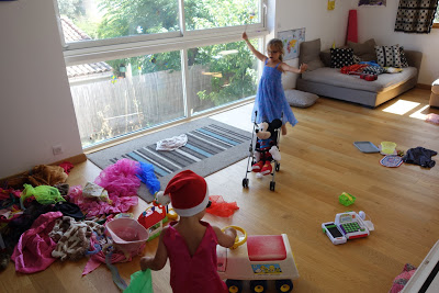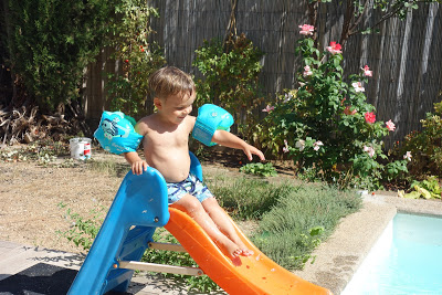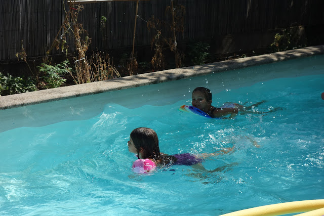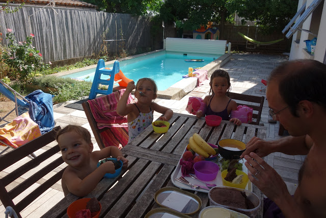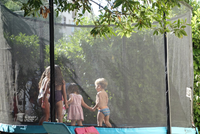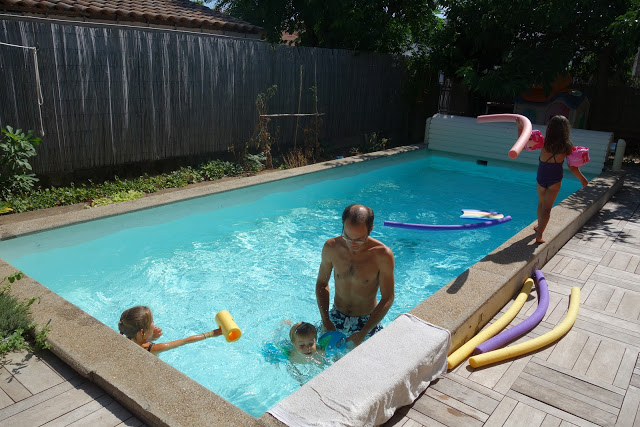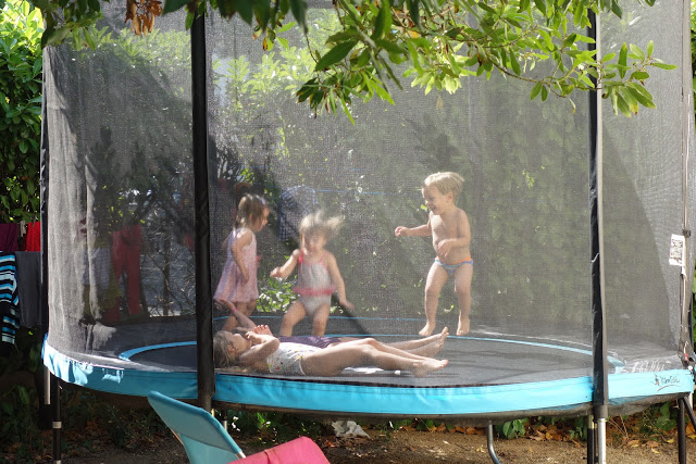 En rentrant des jeux ce matin, les enfants ont croisé Linette, Nina, Romy et leur maman. Nous les avons invitées à déjeuner, et Linette est même restée toute l’après-midi (au programme : déguisements et piscine). Les jumelles sont revenues après leur sieste pour une petite séance de piscine-trampoline. Une belle journée inattendue !