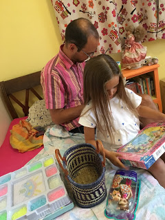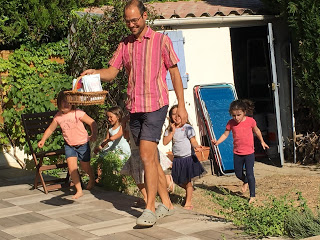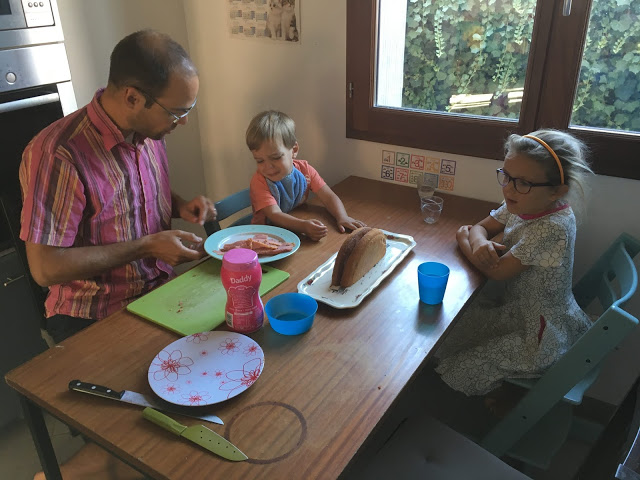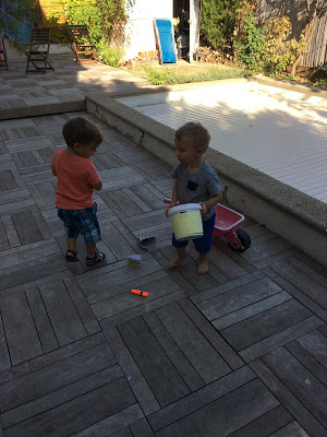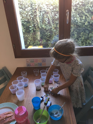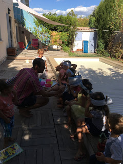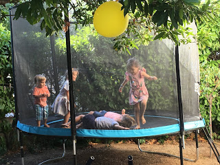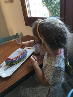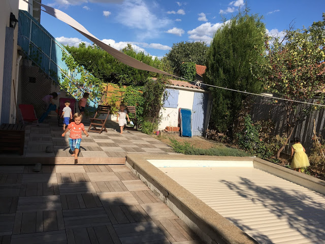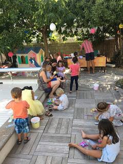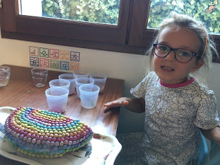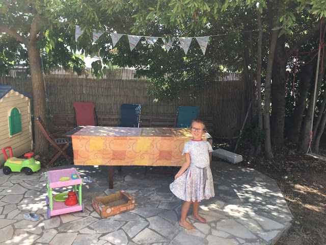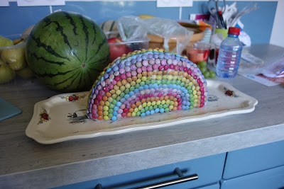 Le samedi matin, nous avons préparé son gâteau arc-en-ciel et installé le jardin. On a de la chance, à cette saison, les enfants pourront rester dehors 😉
