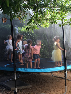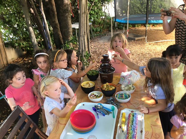 Puis une fois les copines arrivées, nous avons fait la chasse au trésor (avec dégustation, mime,…) , mangé le gâteau et la fontaine de chocolat, et sauté sur le trampoline 😉