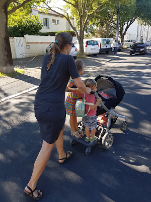 Lundi soir, Grand-papa, Grand-maman, Odile et moi sommes allés chercher Émile et Lucie à la crèche/école. Odile était dans sa poussette, très sage. Elle n’a juste pas trop apprécié quand la poussette était à l’arrêt.