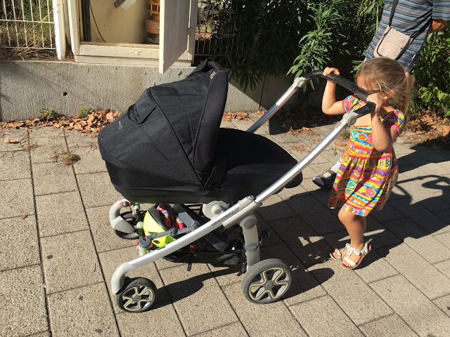 Émile par contre n’a pas beaucoup coopéré. Il n’a pas voulu essayer la planche de la poussette (il n’a accepté que dans les 100 derniers mètres, quand Lucie est montée dessus), et voulait absolument que je le porte. Heureusement que Grand-papa était là pour le faire, je ne m’en serai pas sortie seule !