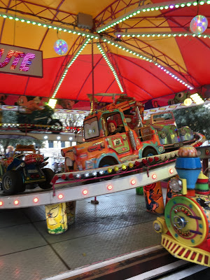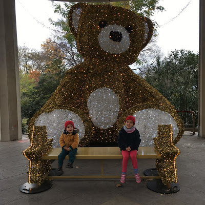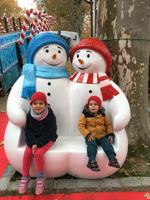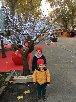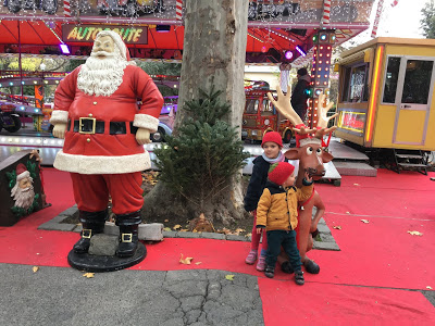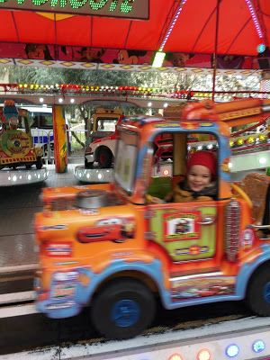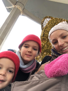 Le matin, nous sommes allés au marché de Noël en vélo cargo. Nous n’y avions pas encore été cette année. Les enfants ont adoré. On a regardé toutes les vitrines, manèges, étals. Émile a choisi un tour de manège dans un camion de dépannage, et Lucie a choisi un bretzel.
