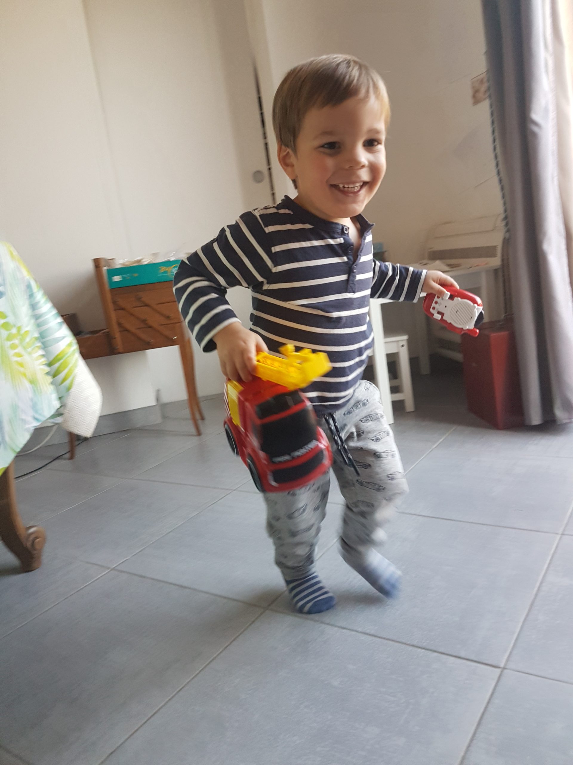 Émile a reçu un magnifique camion de pompier télécommandé pour son anniversaire… merci les tatas !!