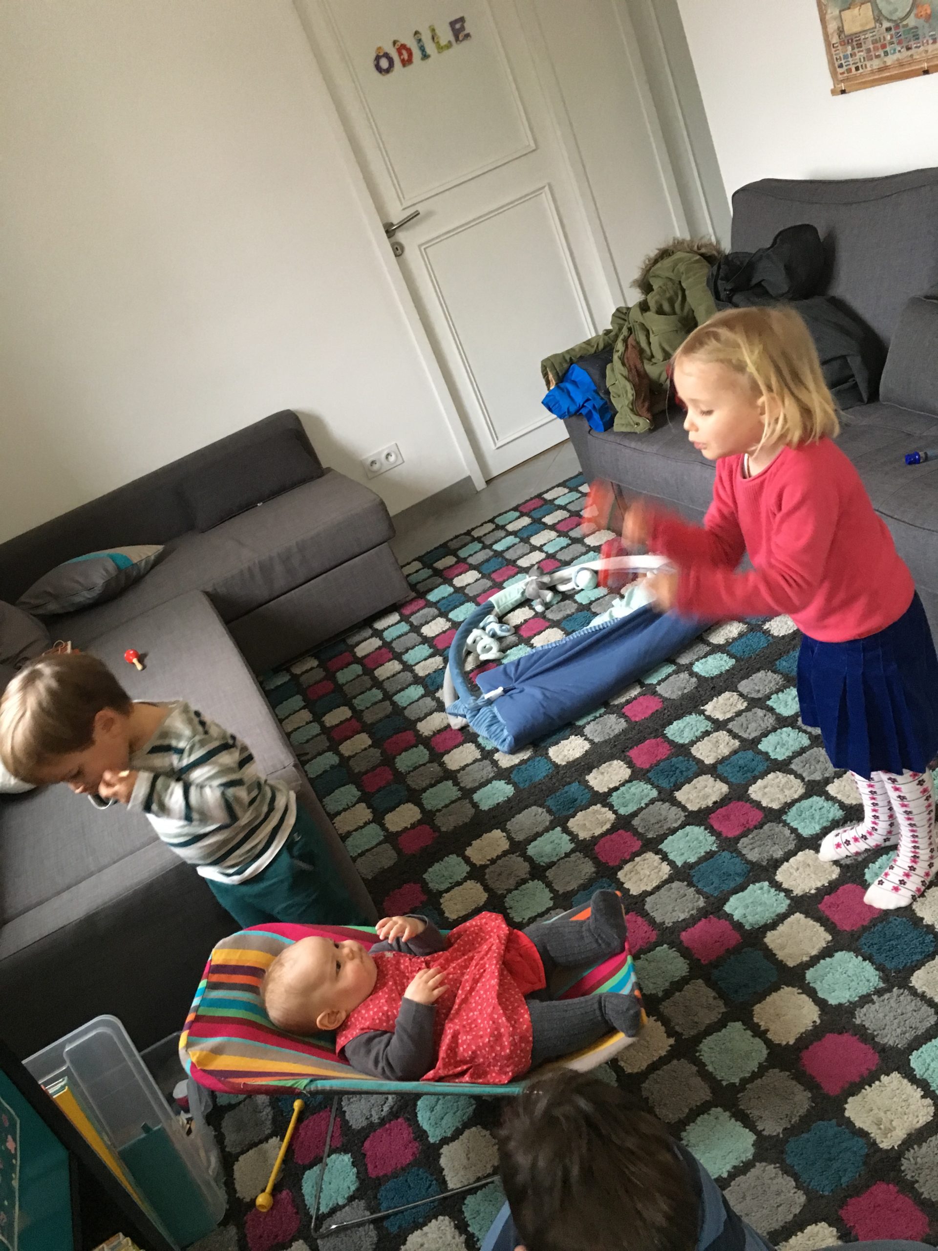 Aujourd’hui, pour le goûter, nous avons invité les copains d’Émile à venir fêter son anniversaire. Il y a dans le quartier 5 enfants de son âge qui rentreront à l’école en septembre avec lui, alors ses invités étaient tout trouvés ! Nina et Romy, les petites soeurs de Linette (qui sont à la crèche avec lui); Arthur, le petit frère de Jeanne; Maxime, le petit frère de Justine, et Lena la petite soeur de Yoann. Bien sûr, les grands, tous de l’âge de Lucie, étaient aussi de la partie, et même que les parents. Au total 12 enfants, et 8 adultes. Dommage que le temps ait été maussade, la semaine dernière il avait fait si beau…