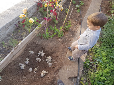 Émile a planté des pomme de terre qui avaient germées dans le placard.