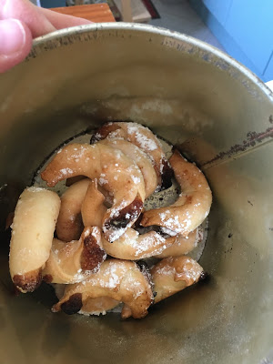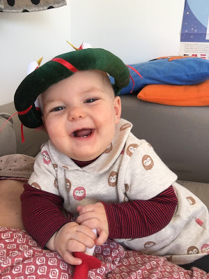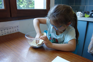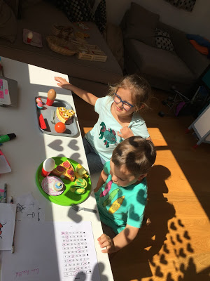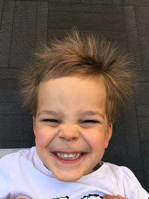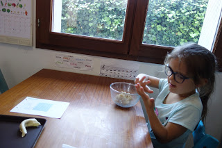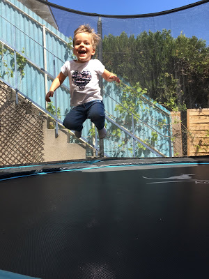À son réveil de la sieste, Émile a joué sur le trampoline (ses cheveux sont un poil électriques !) et Lucie a cuisiné des cornes de gazelles avec Thomas. Miam !