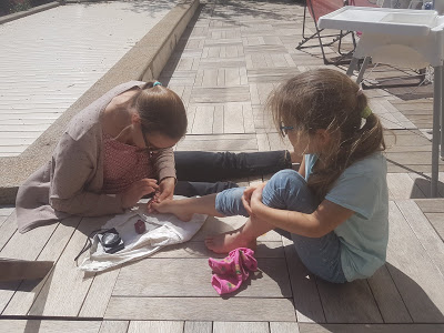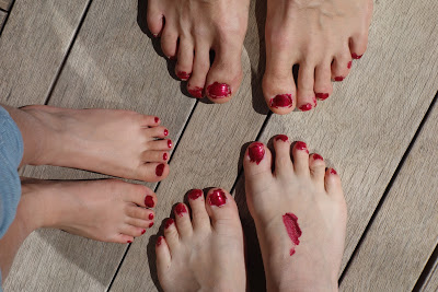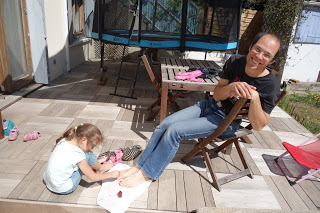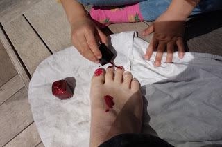 Après le temps calme, Lucie a eu le droit de nous mettre du vernis à ongle sur les pieds, à Thomas et moi. Et moi j’en ai mis sur les siens.