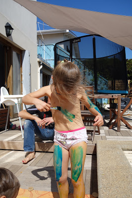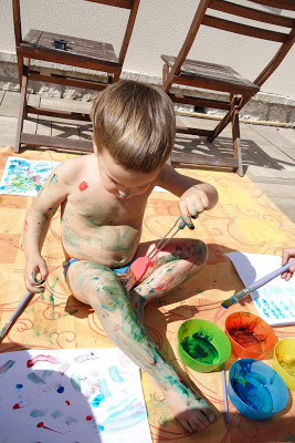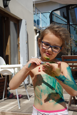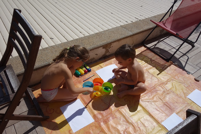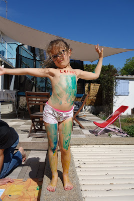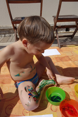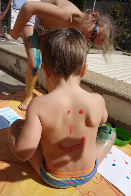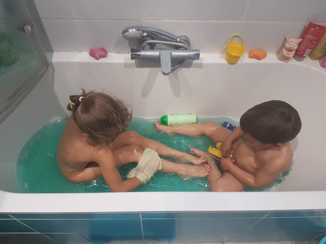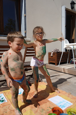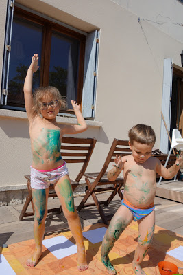 Après cela, nous avons pris notre courage à deux mains, et leur avons proposé de faire de la peinture à doigts. Ils se sont beaucoup amusés ! Lucie s’est peinte en bleu et jaune, comme la lune la nuit. Quand la peinture a commencé à sécher, cela tirait un peu la peau et il a alors fallu très vite aller au bain. Heureusement, cela part très facilement. Voyez aussi l’eau du bain !
