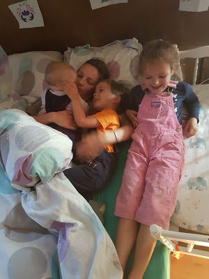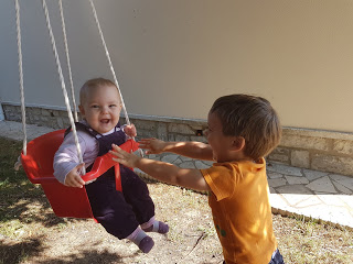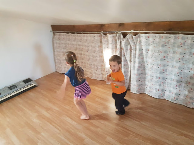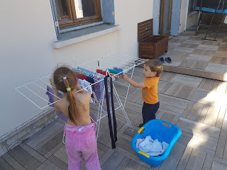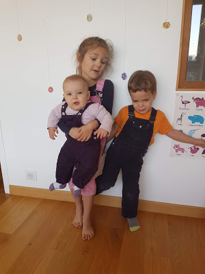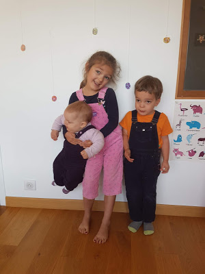 Ce matin, Thomas a mis des salopettes aux 3 enfants ! Celle d’Émile n’a pas duré longtemps, elle était un peu petite, mais les deux filles ont gardé les leurs toute la journée 🙂