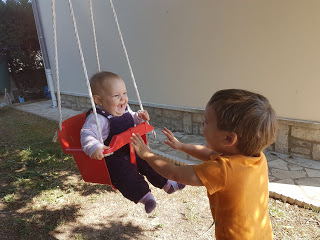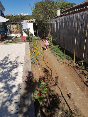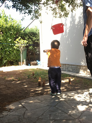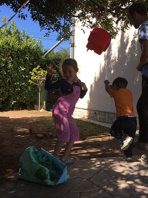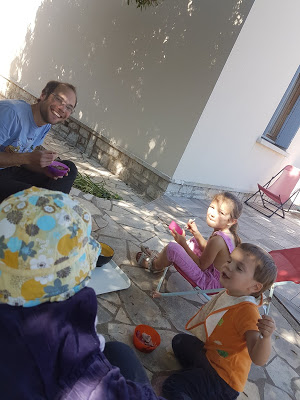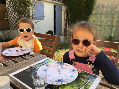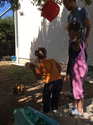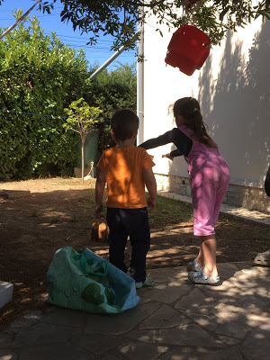 Nous avons ensuite joué à cache-cache petits ronds, la version jardin du cache-cache playmobil, où nous cachons des petits ronds de mousse dans le jardin pour que les autres les trouvent. Lucie est très forte pour trouver des cachettes originales ! Et Émile a de bonnes idées aussi.