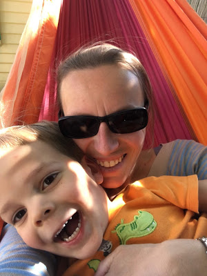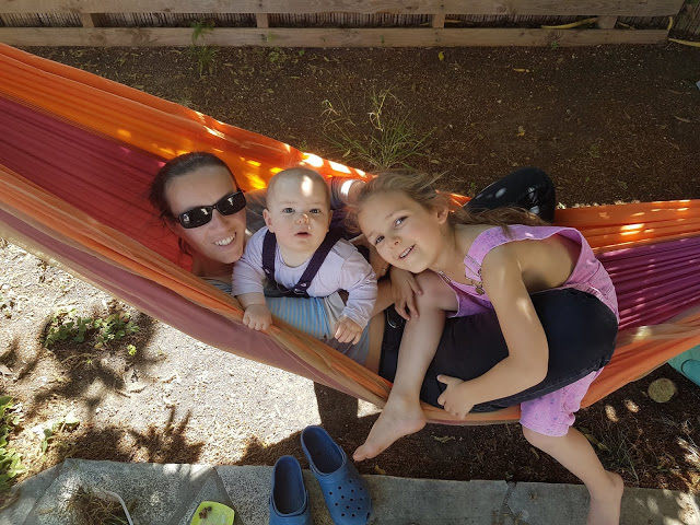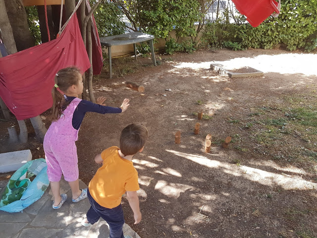 Après le déjeuner et le temps calme (Émile ne fait plus de sieste depuis une bonne semaine… on dirait qu’il a rattrapé le sommeil de retard qu’il avait, et maintenant, une bonne nuit lui suffit), Thomas a sorti le molkky. Les enfants ont bien joué, j’ai pu m’asseoir plusieurs minutes dans le hamac 😉