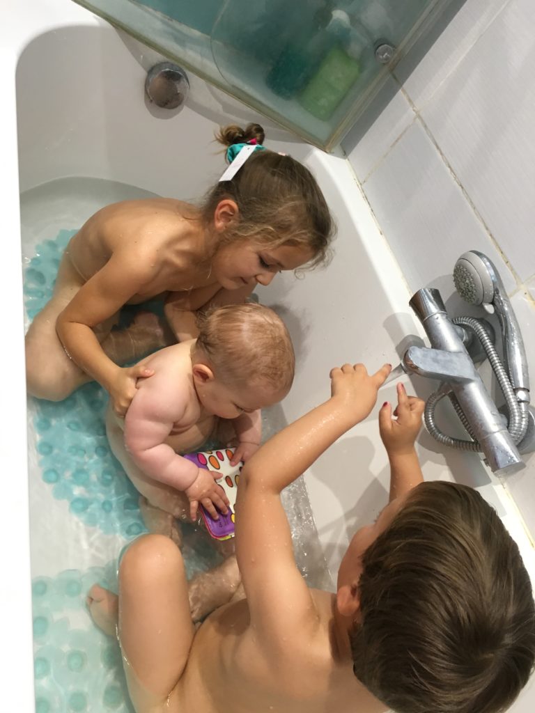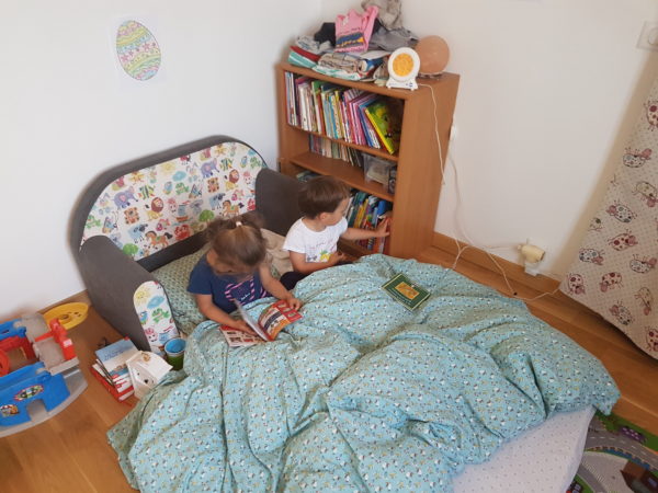 Ce matin, les enfants se sont réveillés d’humeur caline 😉 Nous les avons trouvés tous les deux dans le même lit, en train de lire des livres. Puis ils ont gentiment joué ensemble, puzzles, memory, même un peu de devoirs.