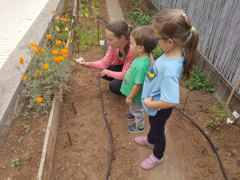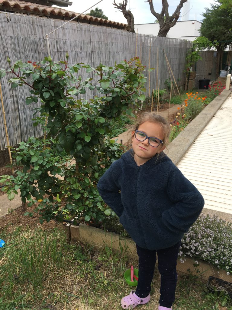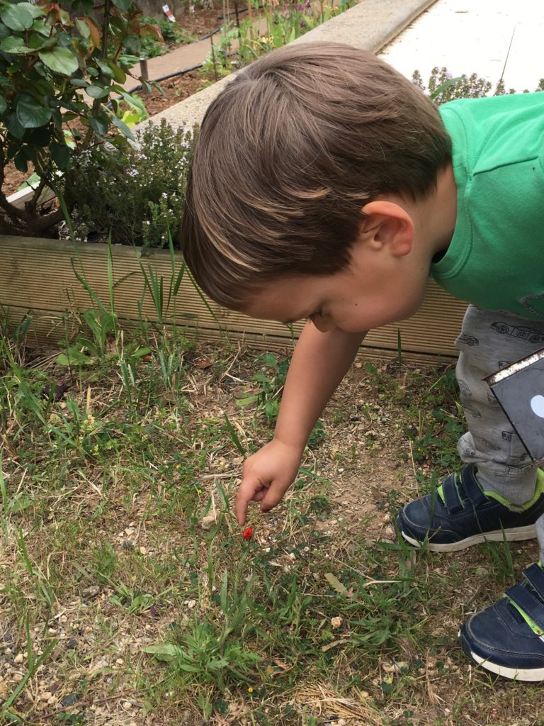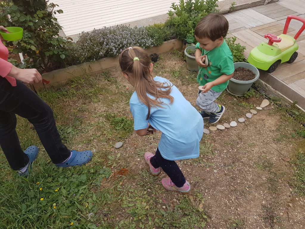 Nous avons repéré un bébé coquelicot. Nous l’avons alors protégé, lui et ses frères, avec une petite ronde de cailloux pour former un petit jardin des coquelicots.