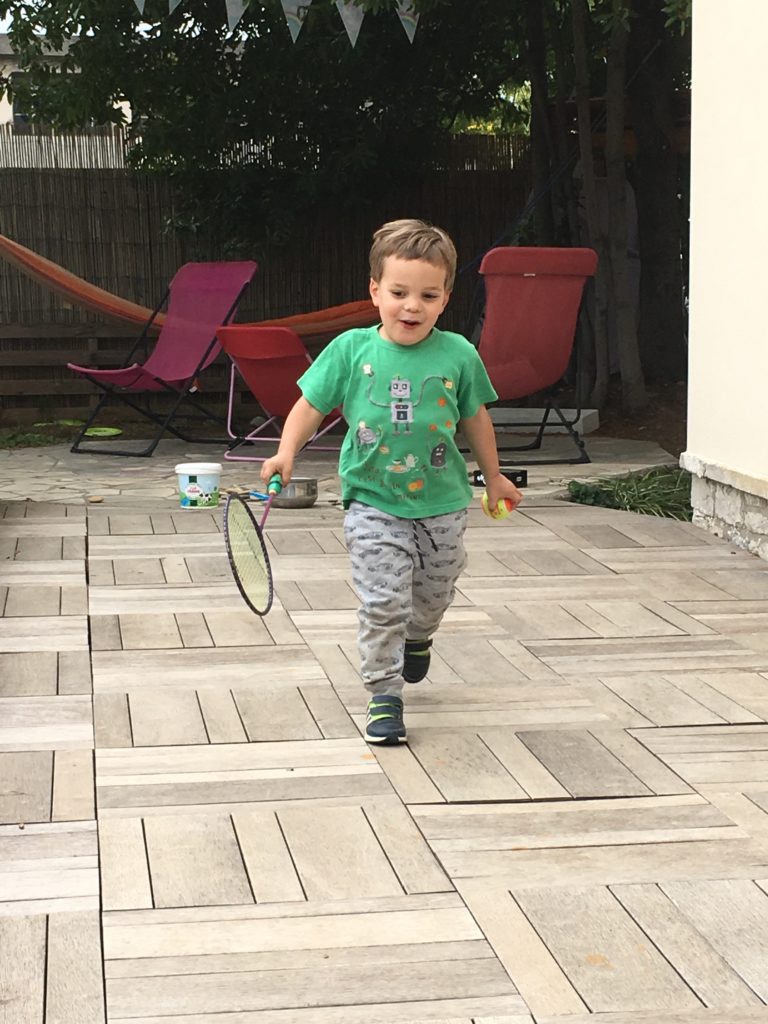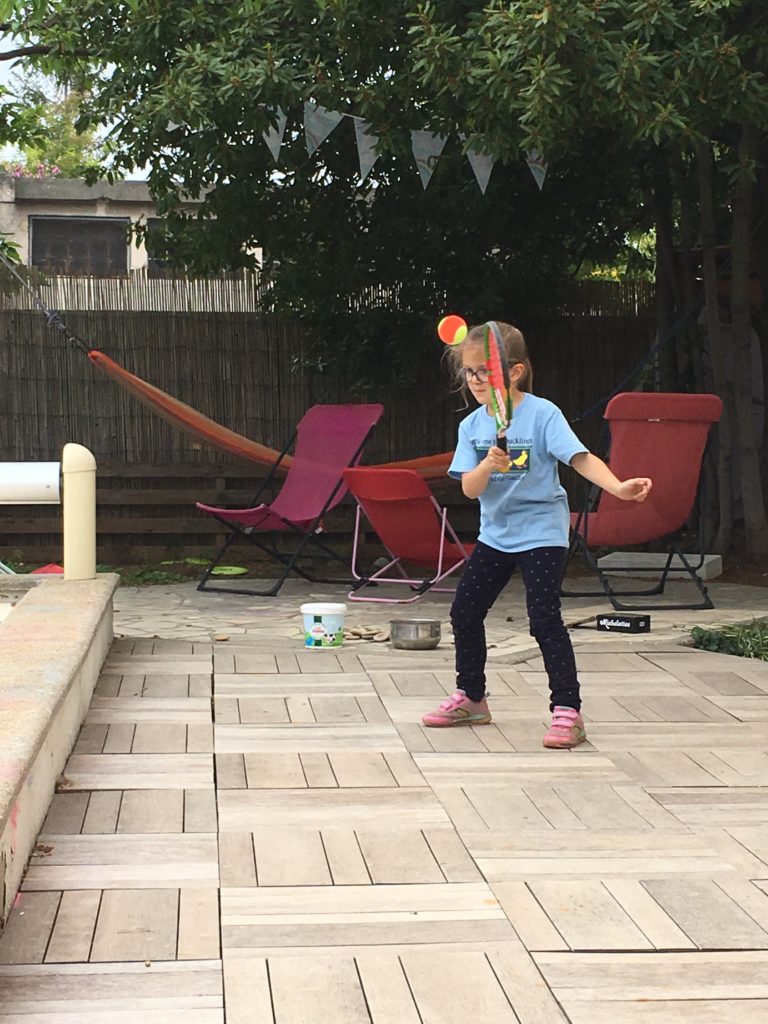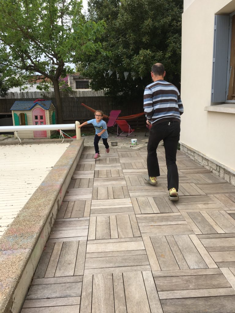 Puis une course en relai pour déplacer des galets jusque dans le sceau de son équipe. Et c’est l’équipe des filles qui a gagné ! Mais Émile a bien compris les règles, et s’est bien plié au jeu !