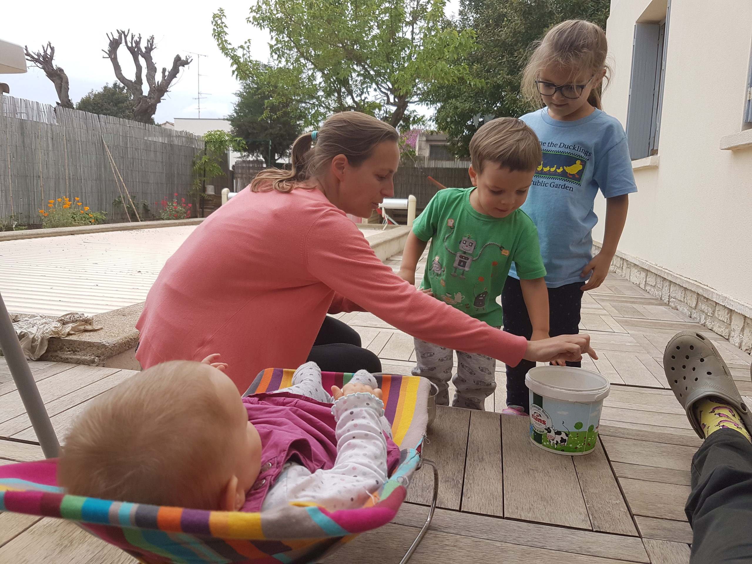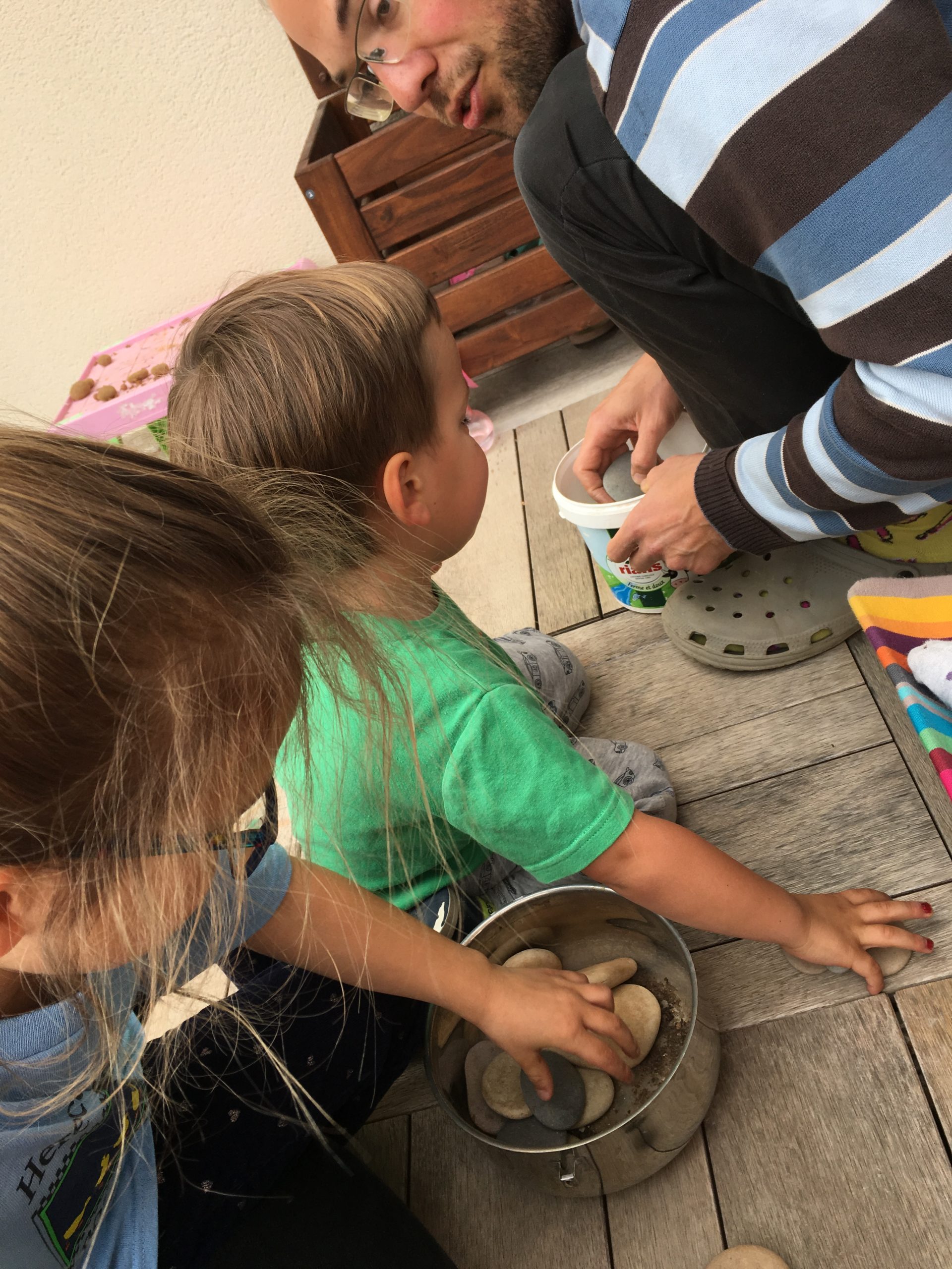 Puis une course en relai pour déplacer des galets jusque dans le sceau de son équipe. Et c’est l’équipe des filles qui a gagné ! Mais Émile a bien compris les règles, et s’est bien plié au jeu !