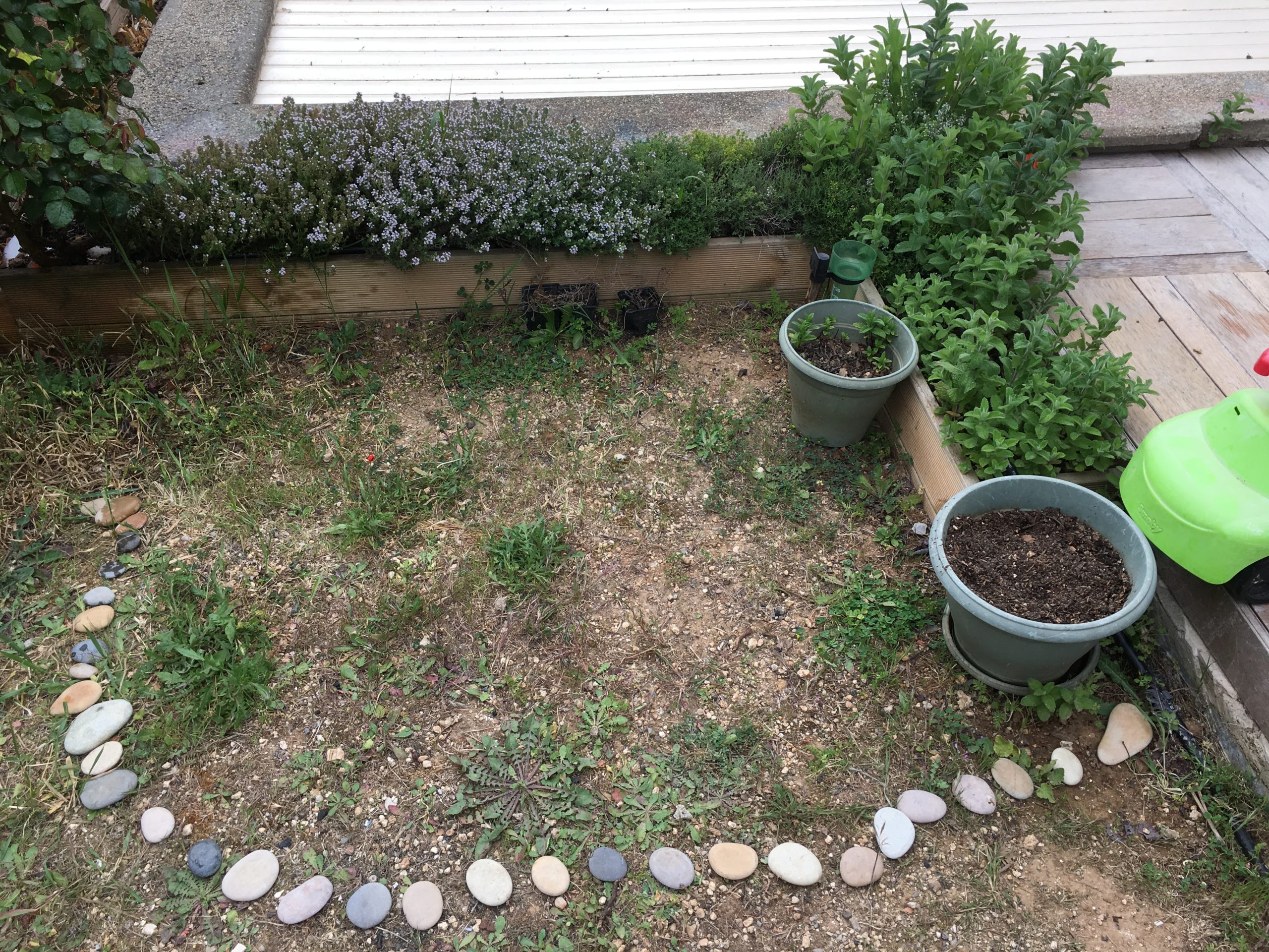 Nous avons repéré un bébé coquelicot. Nous l’avons alors protégé, lui et ses frères, avec une petite ronde de cailloux pour former un petit jardin des coquelicots.