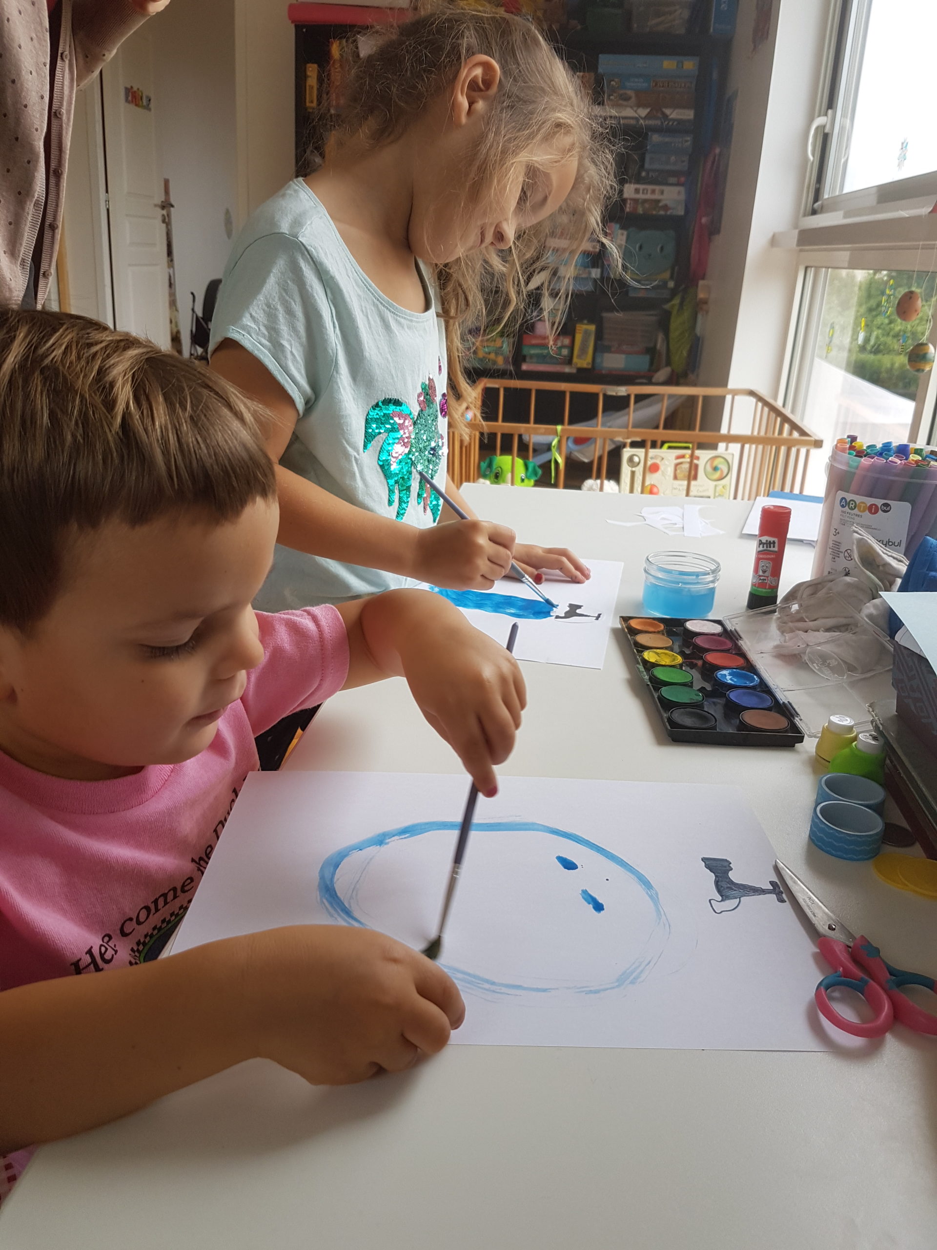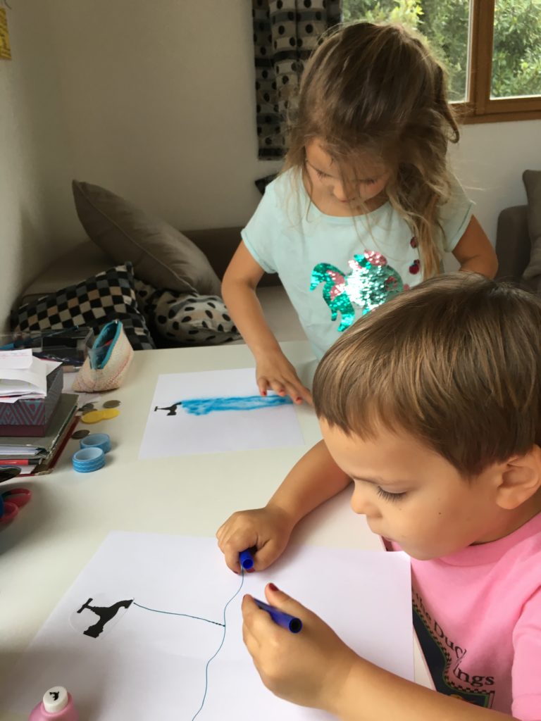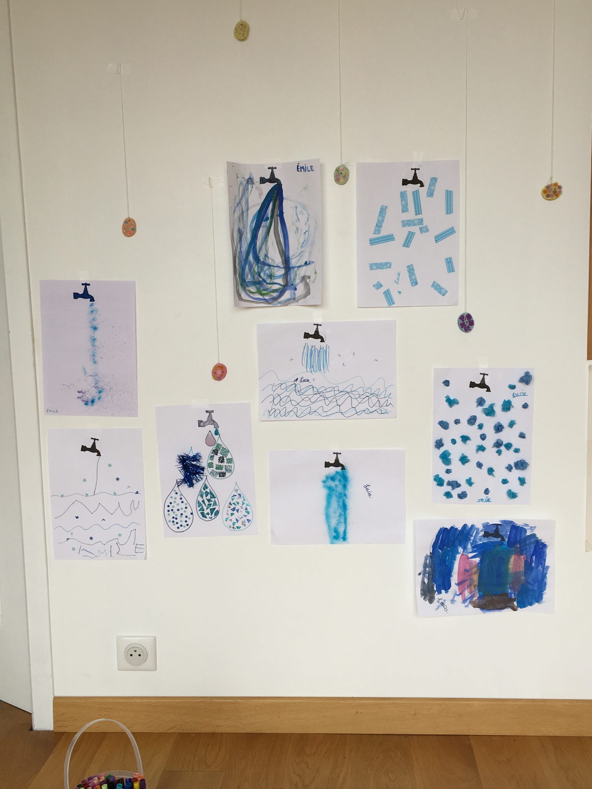 Aujourd’hui, nous avons réalisé tous ensemble un travail proposé par l’école : nous avons dessiné de l’eau sous toutes ses formes sous les robinets : feutres, peinture, feutres à souffler, collages…