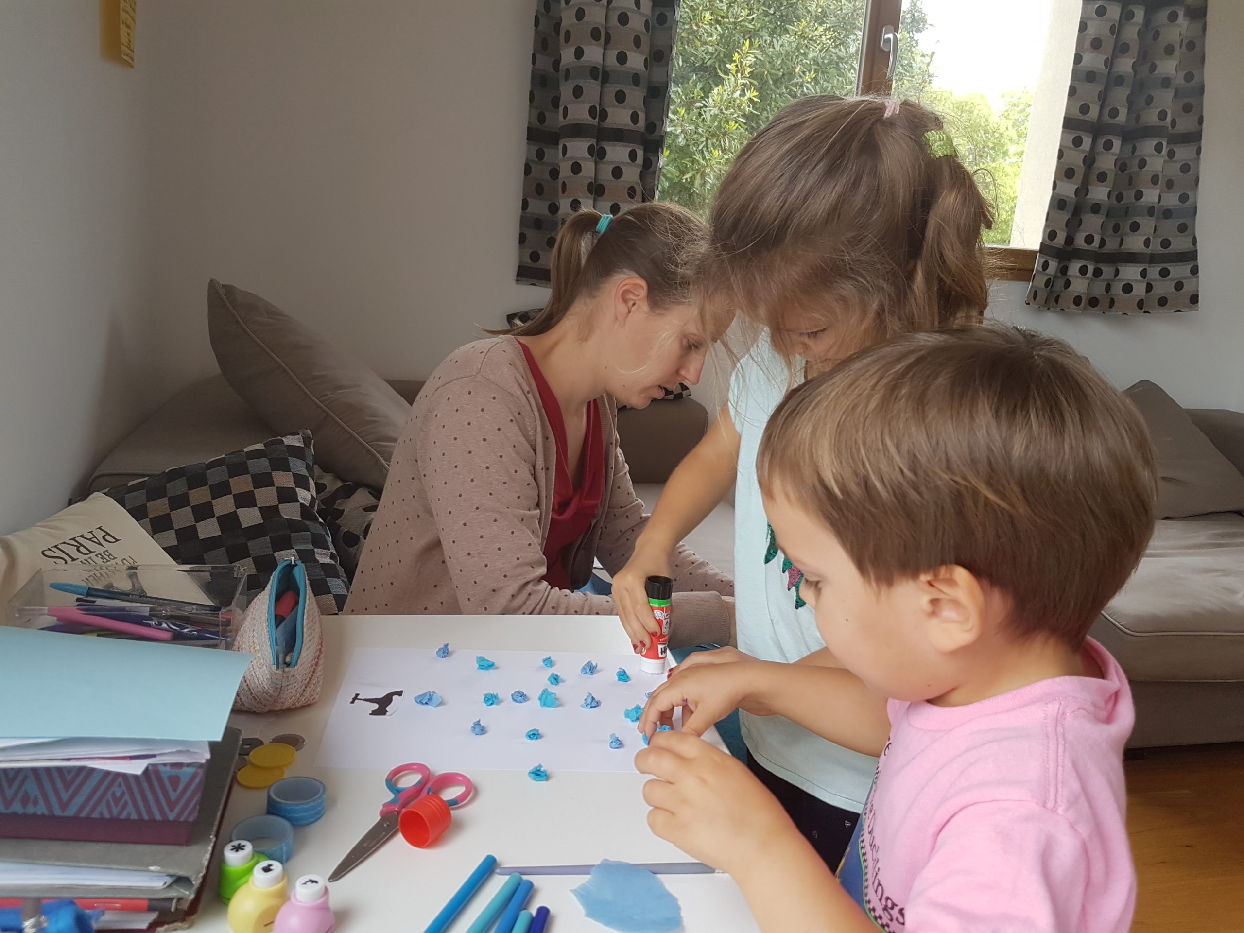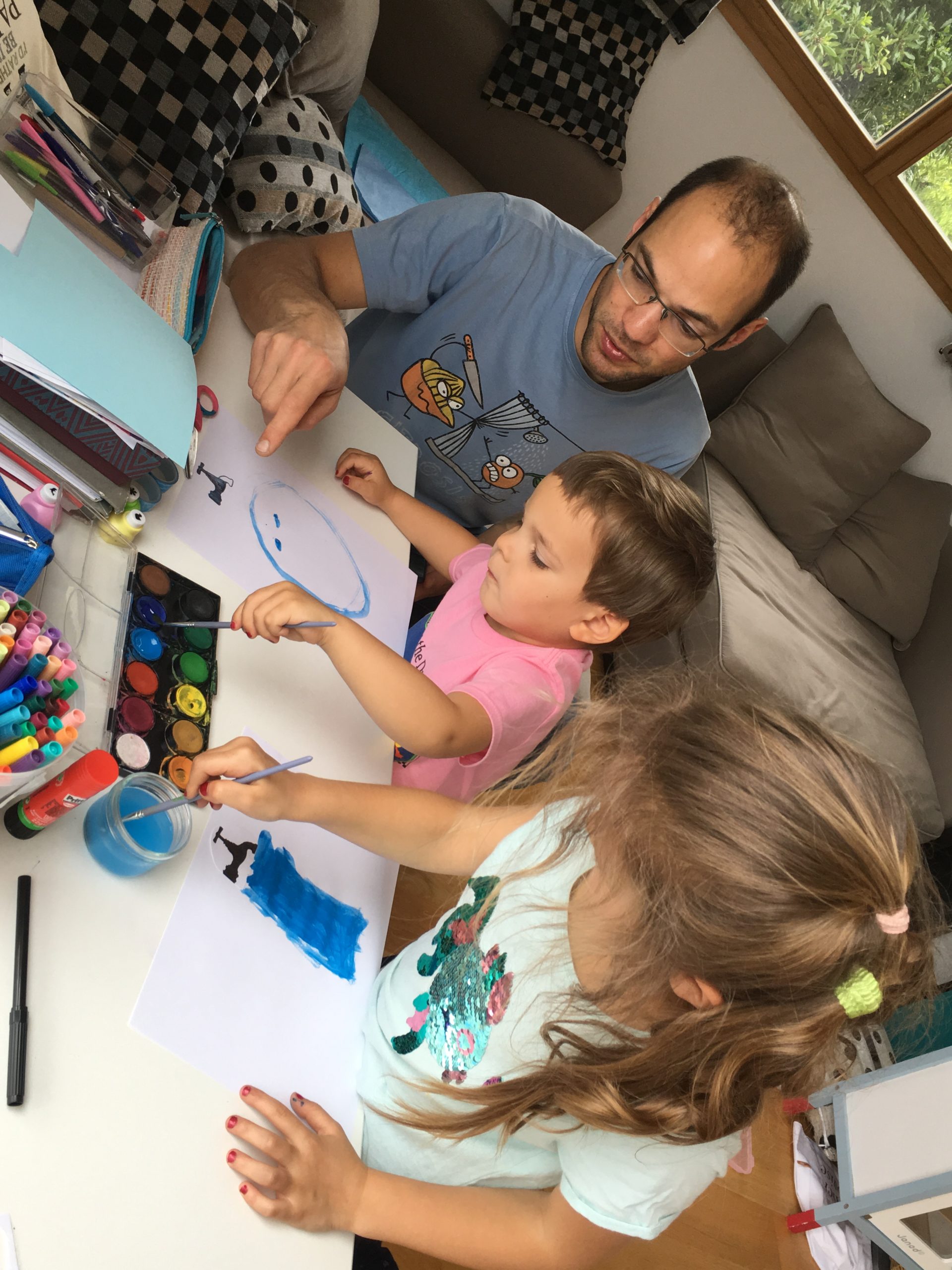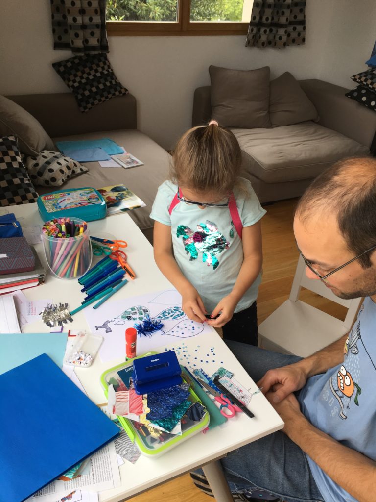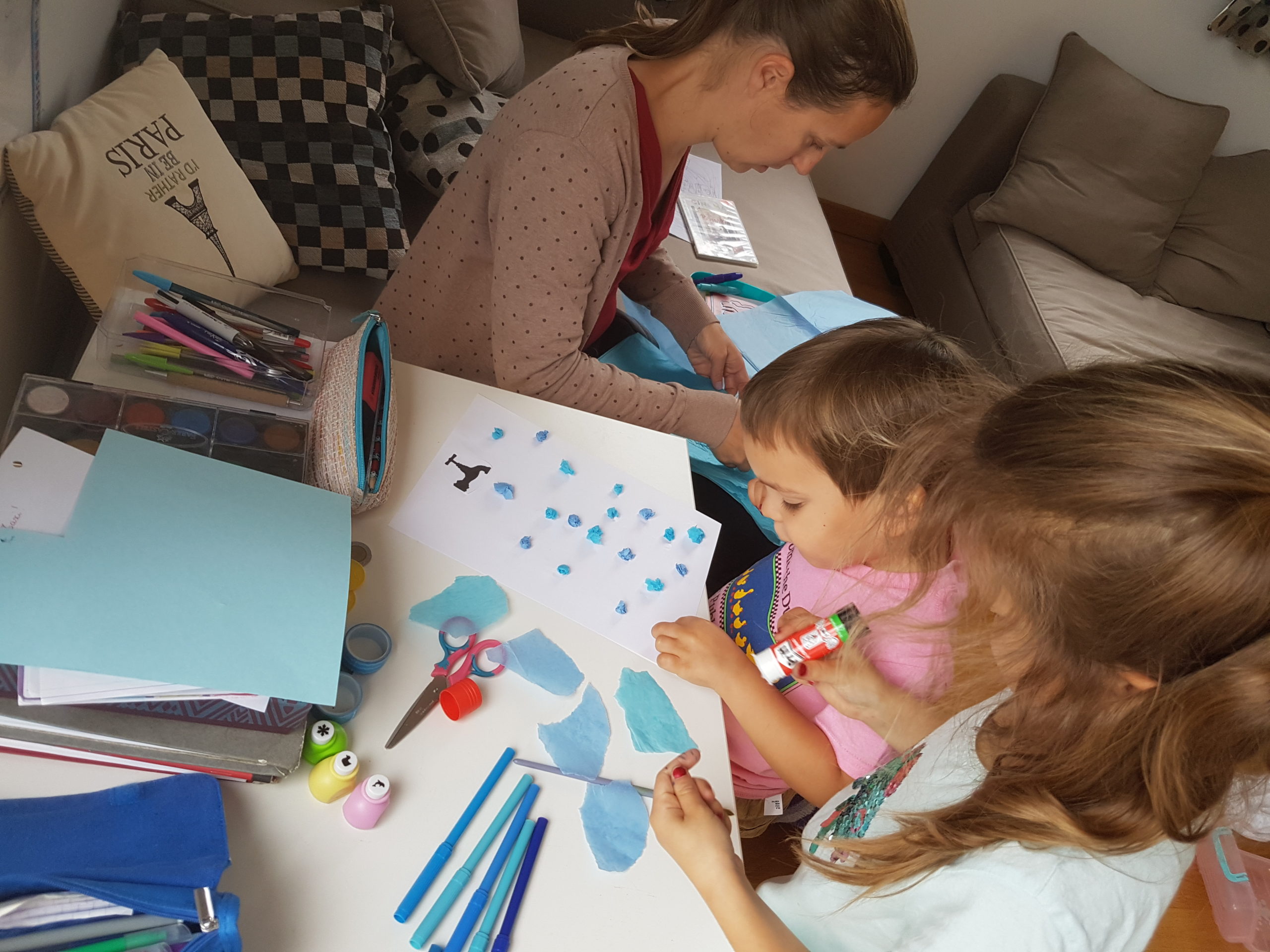 Aujourd’hui, nous avons réalisé tous ensemble un travail proposé par l’école : nous avons dessiné de l’eau sous toutes ses formes sous les robinets : feutres, peinture, feutres à souffler, collages…