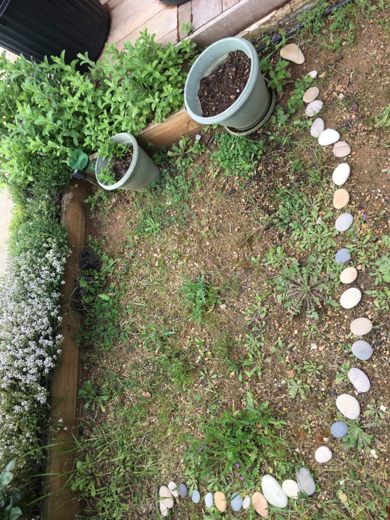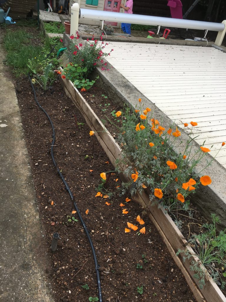 Et puis, la pluie s’est enfin arrêtée ! Nous avons reperé plusieurs pieds de coquelicots, que nous avons donc protégé par un petit chemin de galets. Nous espérons avoir bientôt les premières fleurs !
