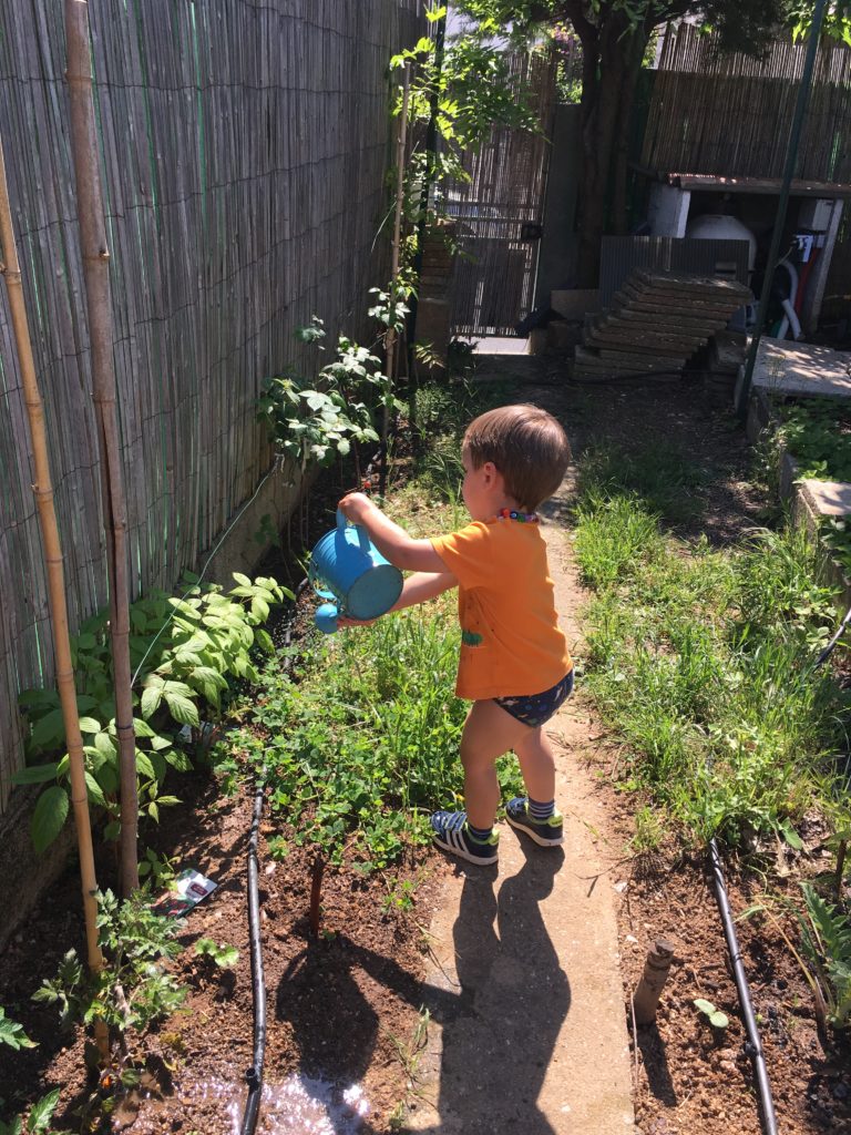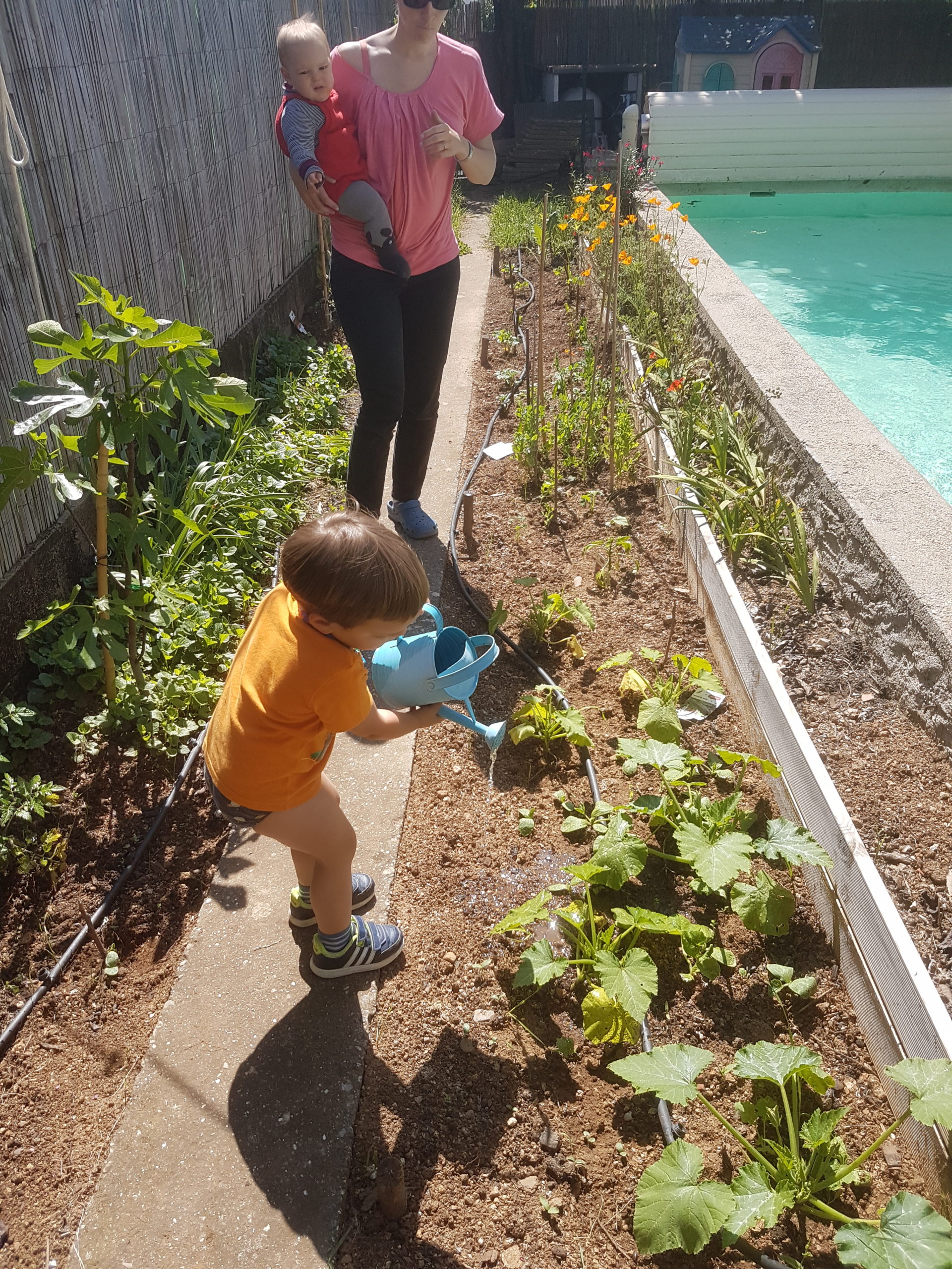 Et après le temps calme (et le bain de Grand-Maman), jeux, arrosage… Et le beau coquelicot qui a fleuri !