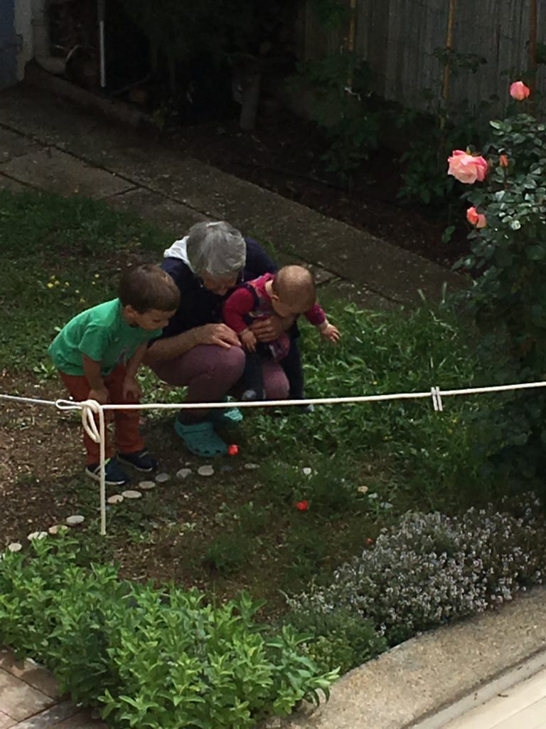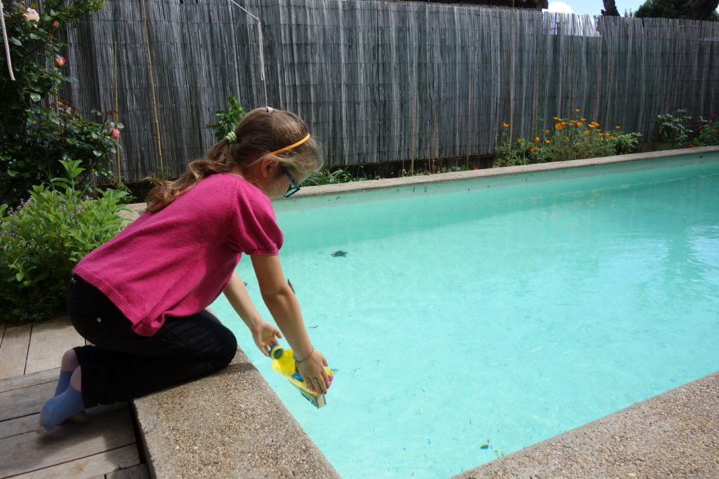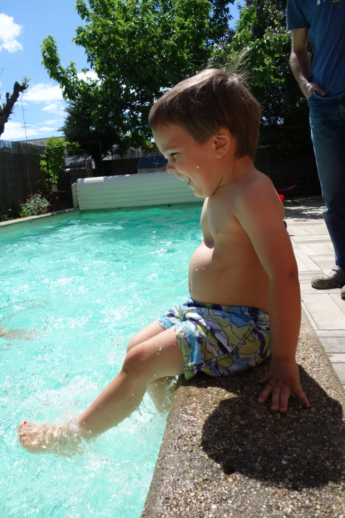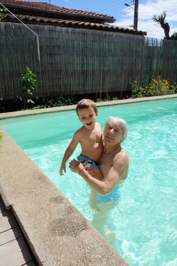 Après le temps calme, Émile a eu envie de rejoindre Grand-Maman dans la piscine. Premier bain de l’année pour lui 🙂