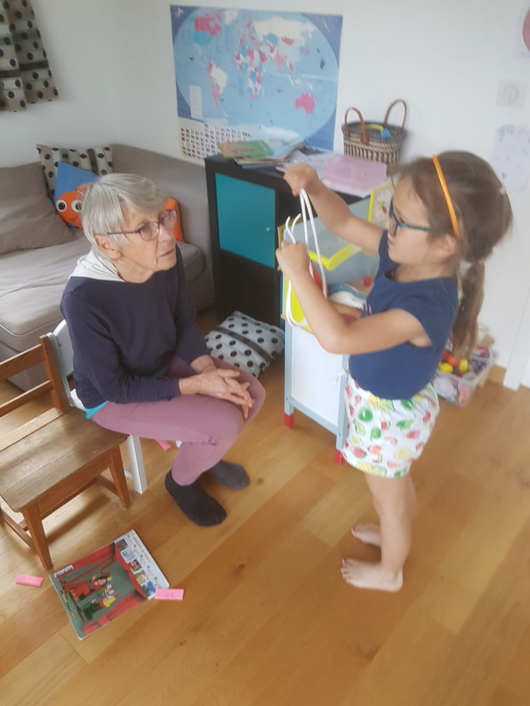 Lucie s’entraîne à faire un tour de magie à Grand-Maman. Pas encore tout à fait au point 😉