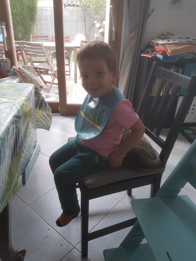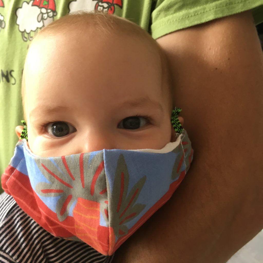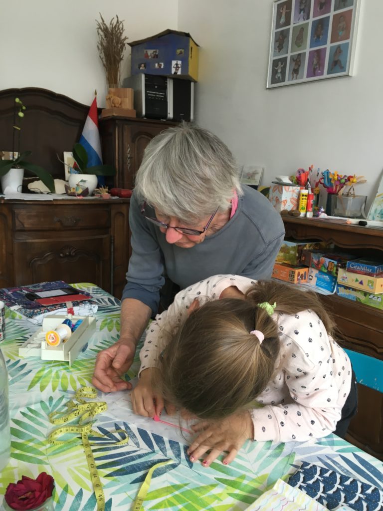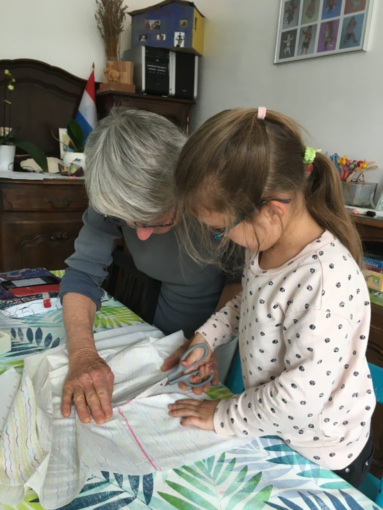 Lucie a ensuite commencé son projet de fabriquer quelques masques : un pour sa maîtresse, un pour son petit frère et deux pour elle. Elle a choisi les tissus, et commencé la première étape de couture. Cela a aussi été l’occasion d’essayer ceux que Grand-Maman a déjà fait pour les enfants. Ils leur vont très bien !