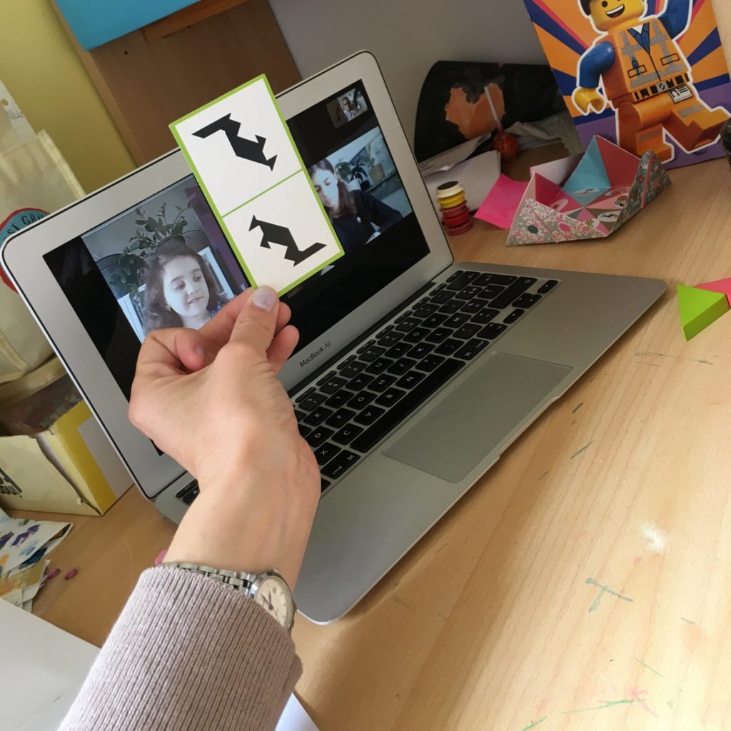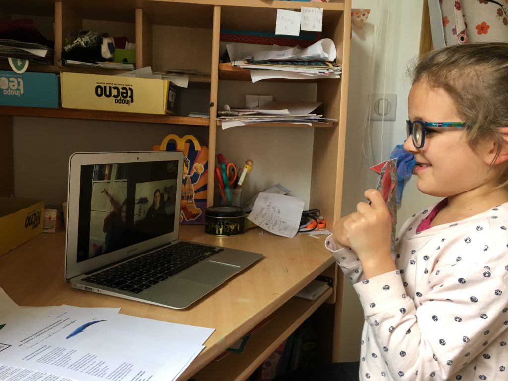 Après le temps calme, Lucie a skypé avec sa maîtresse et sa copine Maëlie. Le thème d’aujourd’hui était le tangram. Maîtresse Zoé a lu aux filles le livre Chatangram, puis les filles ont montré leurs réalisations, et en ont fait d’autres. C’est toujours un chouette moment, qui nous incite aussi davantage à garder le rythme des devoirs envoyés par l’école.