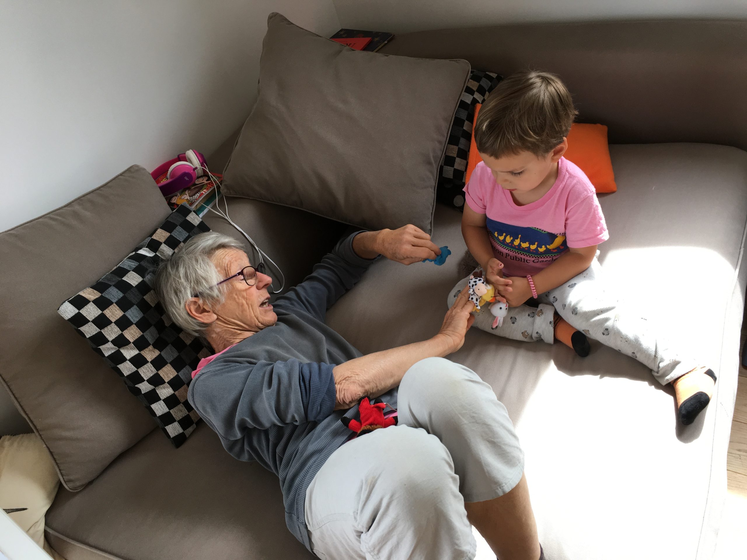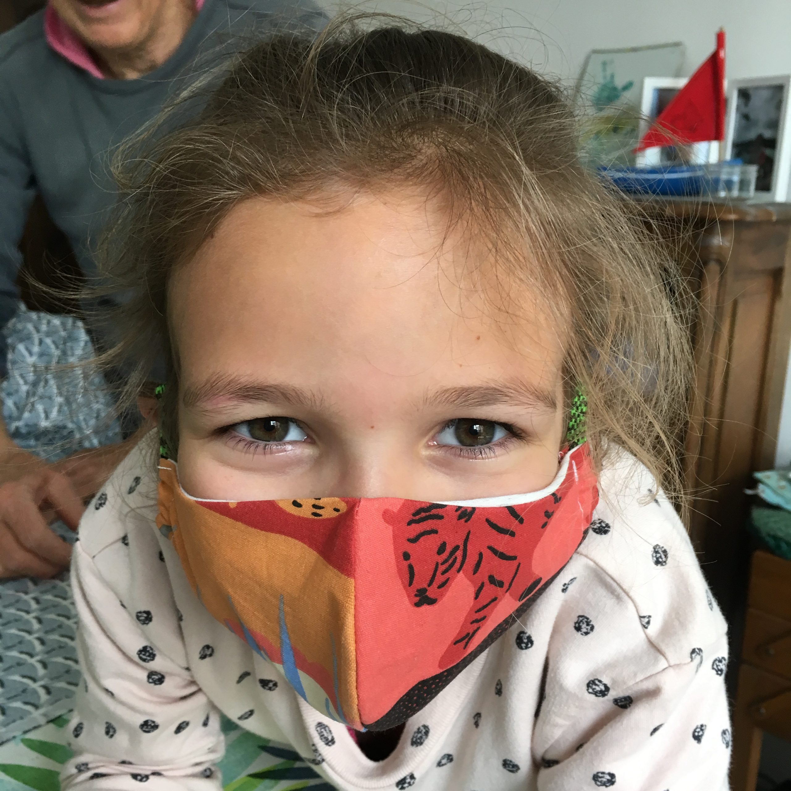 Lucie a ensuite commencé son projet de fabriquer quelques masques : un pour sa maîtresse, un pour son petit frère et deux pour elle. Elle a choisi les tissus, et commencé la première étape de couture. Cela a aussi été l’occasion d’essayer ceux que Grand-Maman a déjà fait pour les enfants. Ils leur vont très bien !