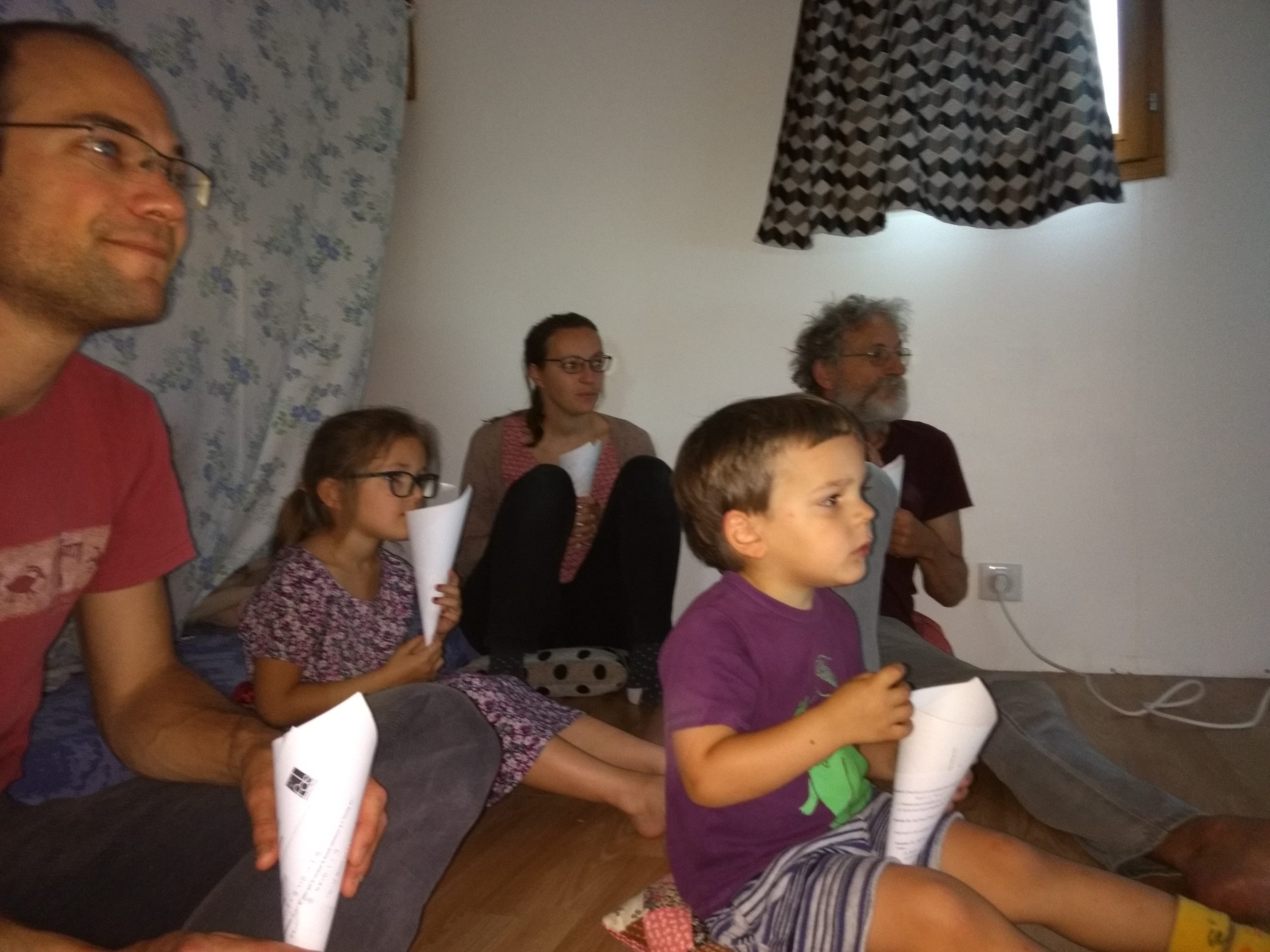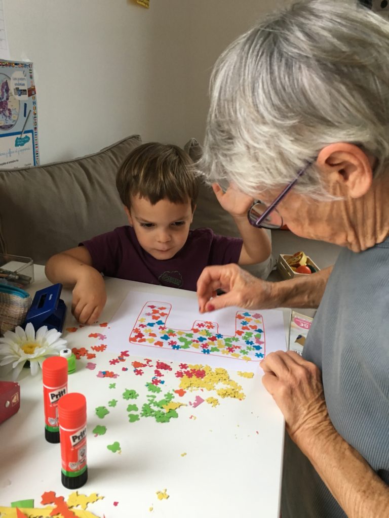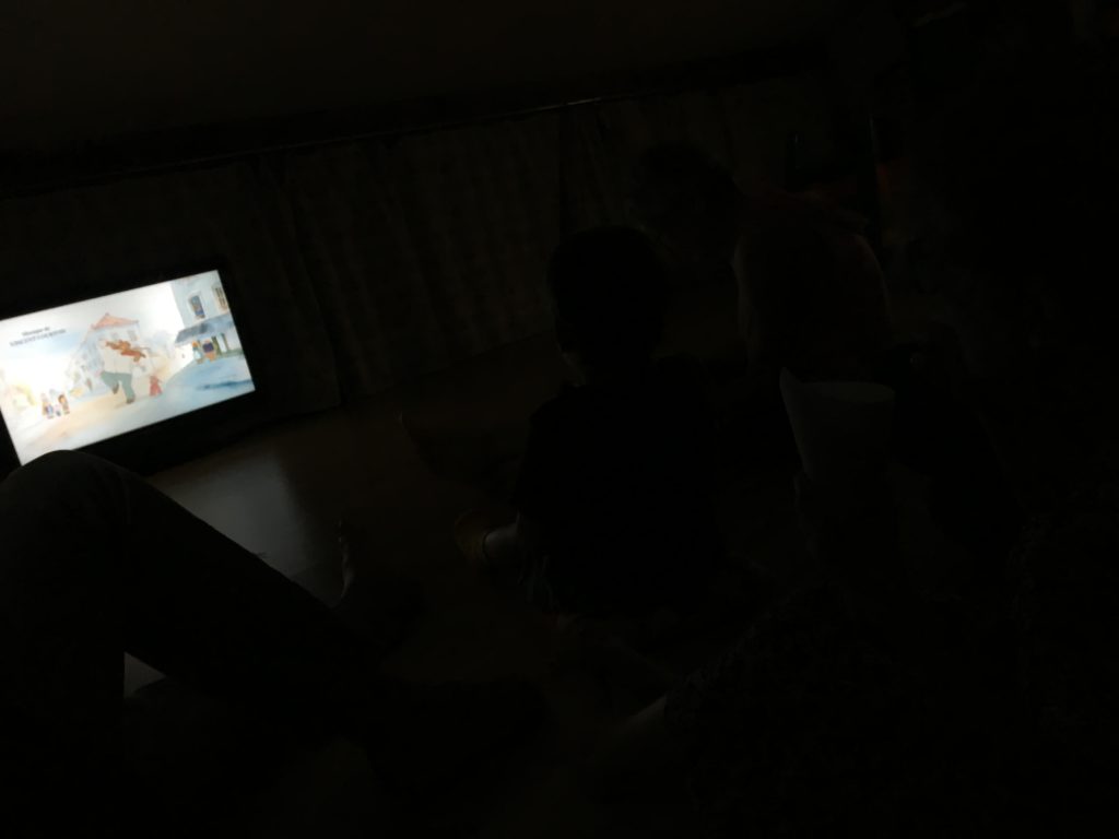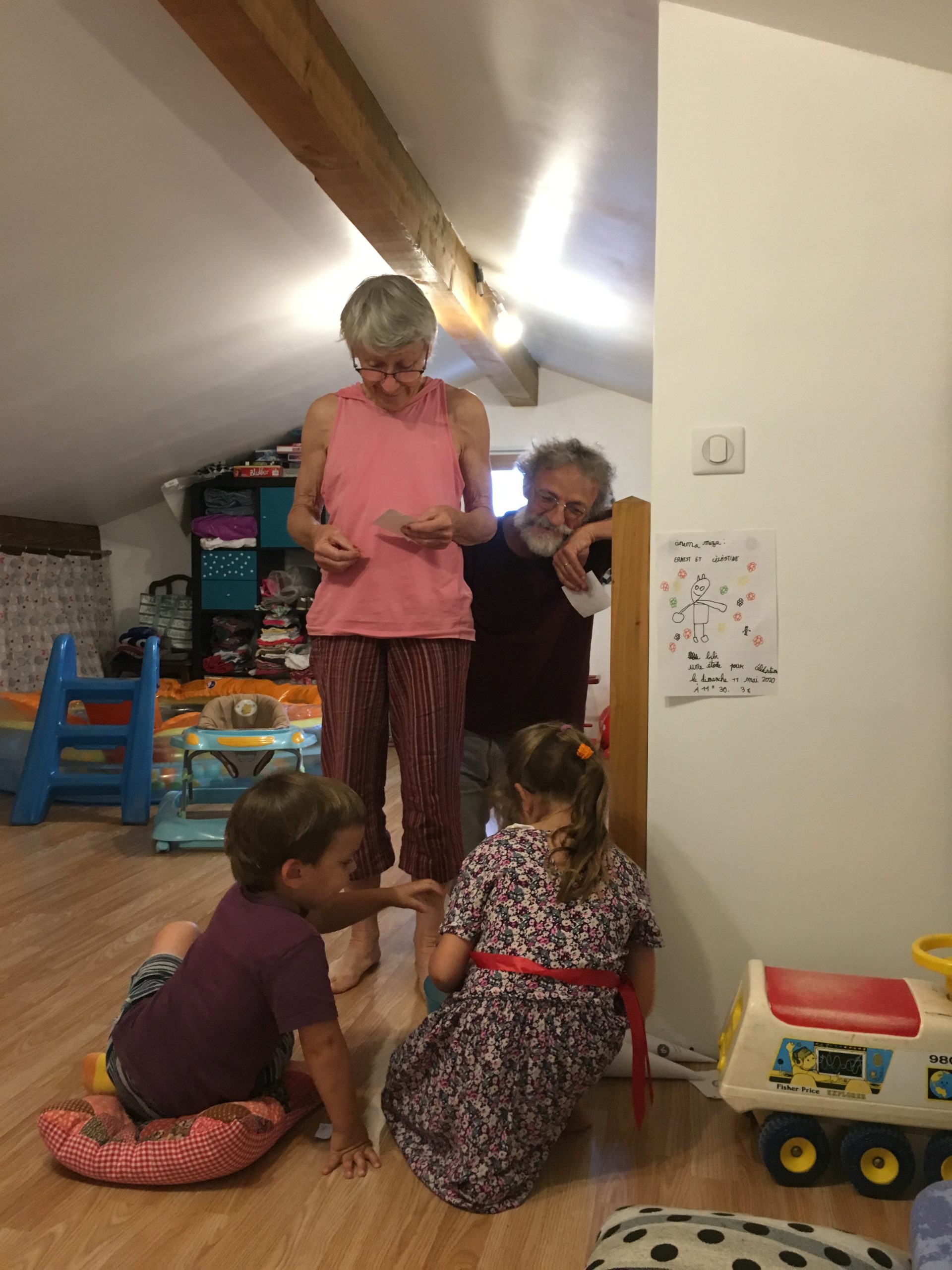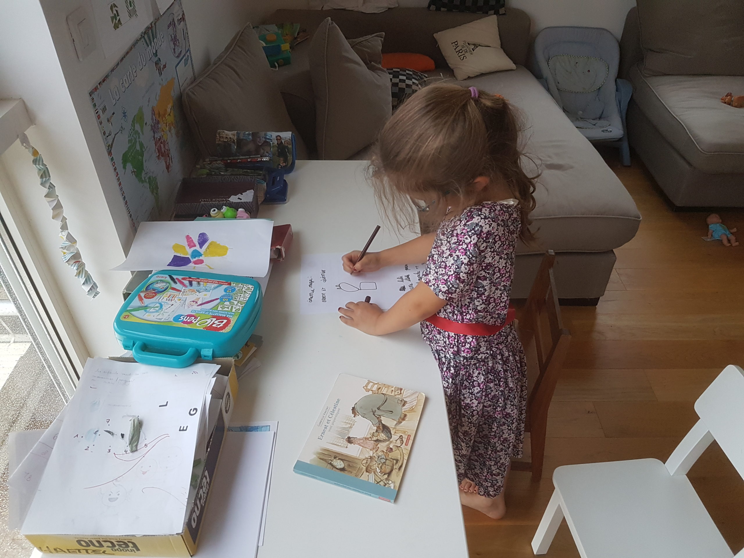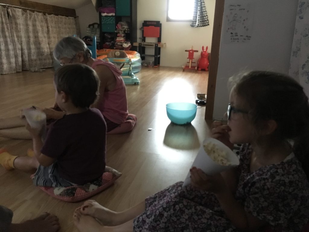 Alors dès qu’Odile a été à la sieste, nous avons lancé notre grand projet cinéma ! Nous avons préparé la salle – Cinémezza -, les popcorns, et Lucie a préparé l’affiche du film – Ernest et Célestine : Bibi et Une étoile pour Celestine.