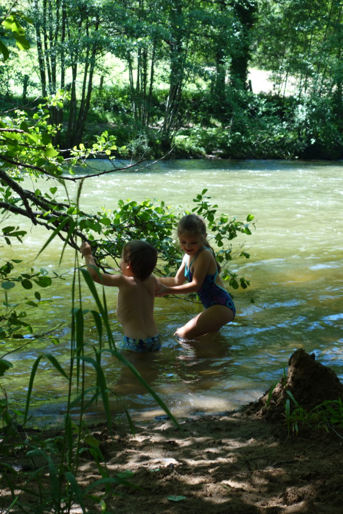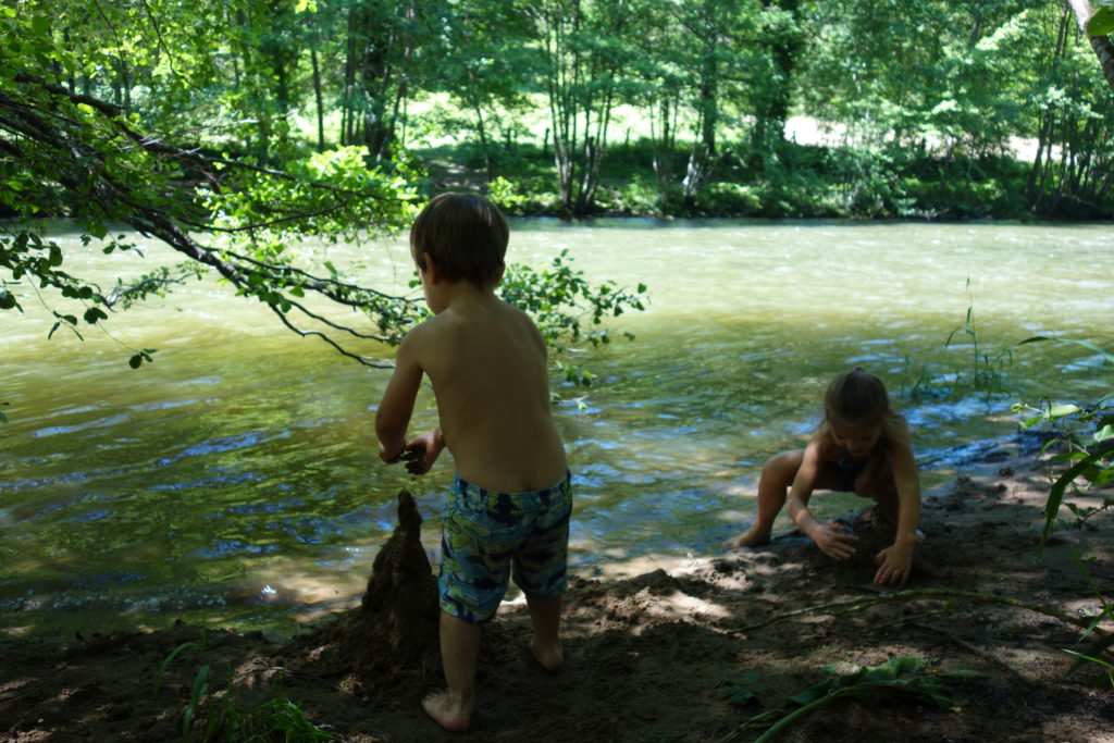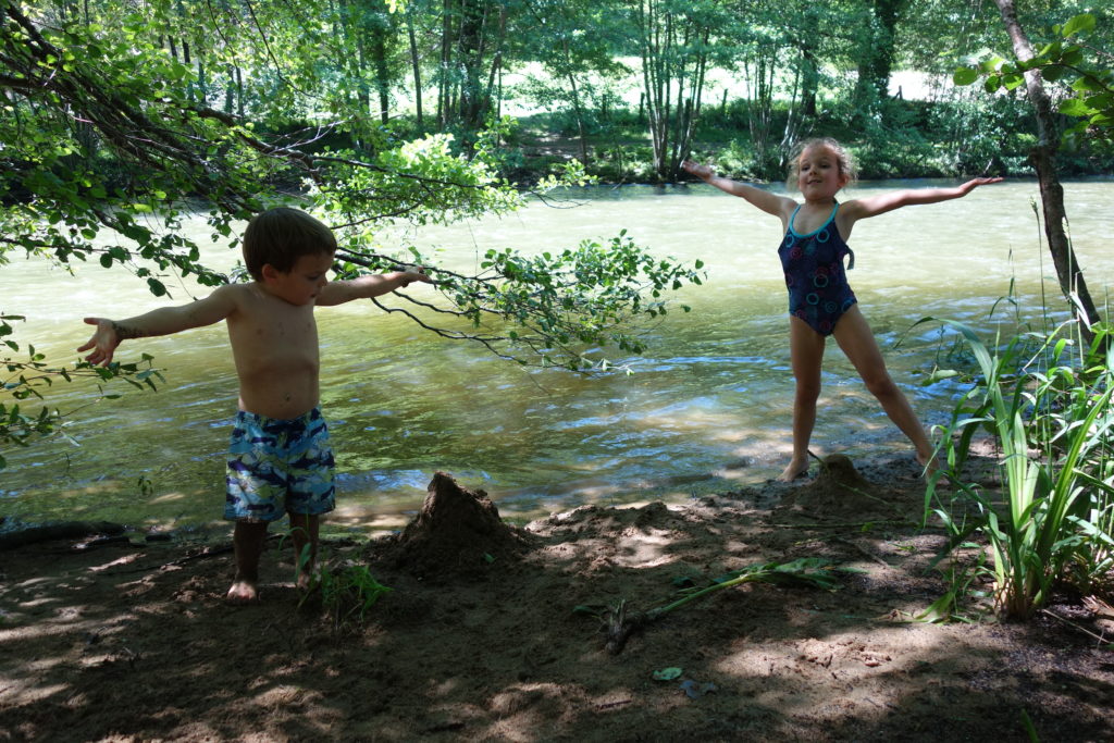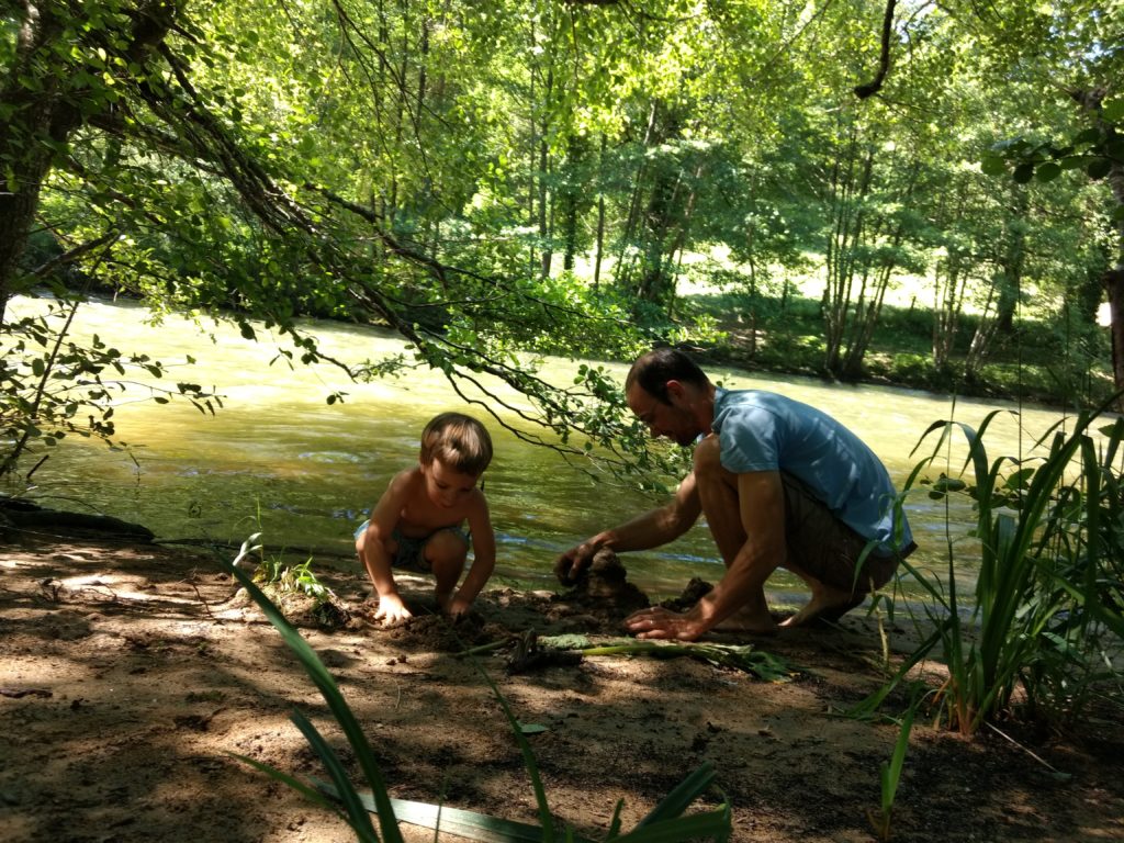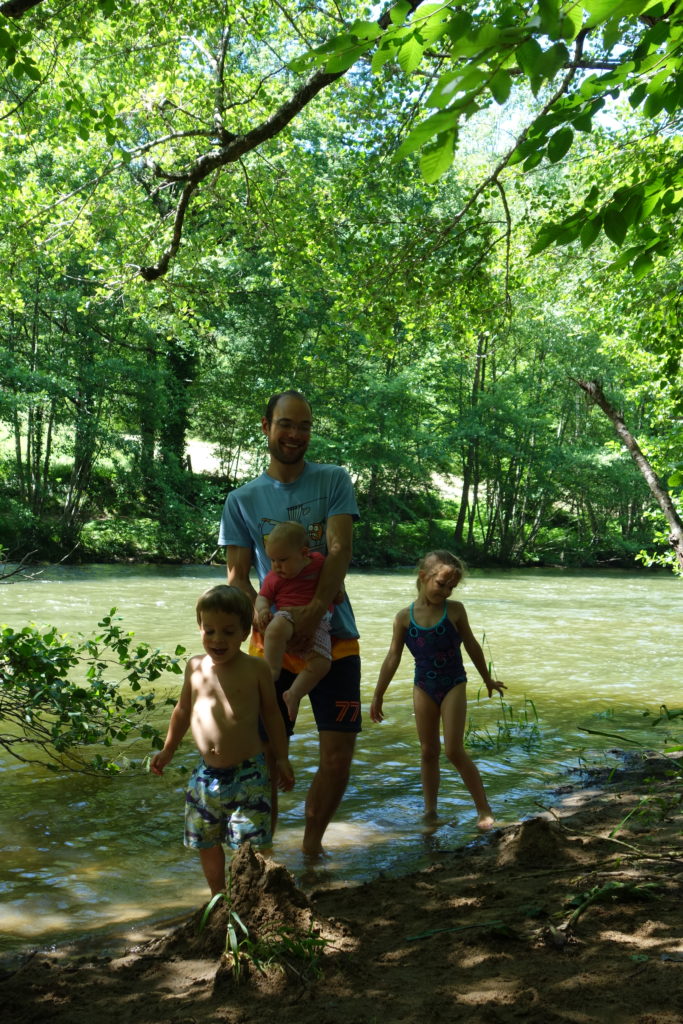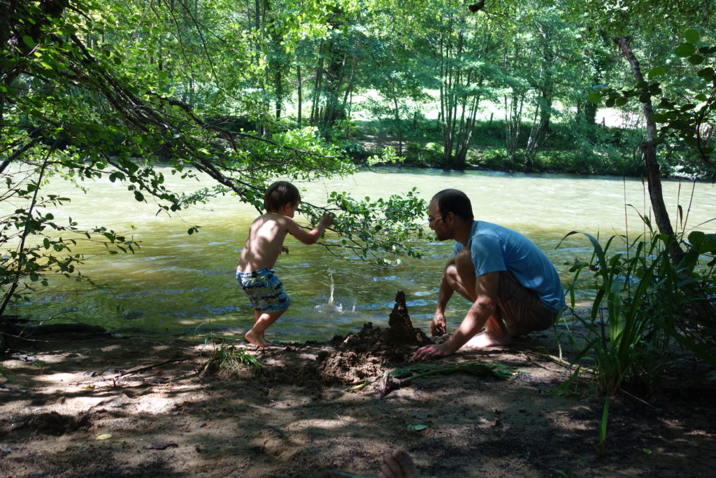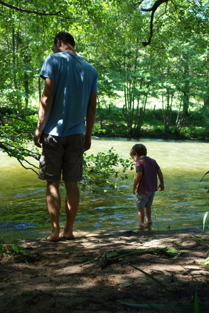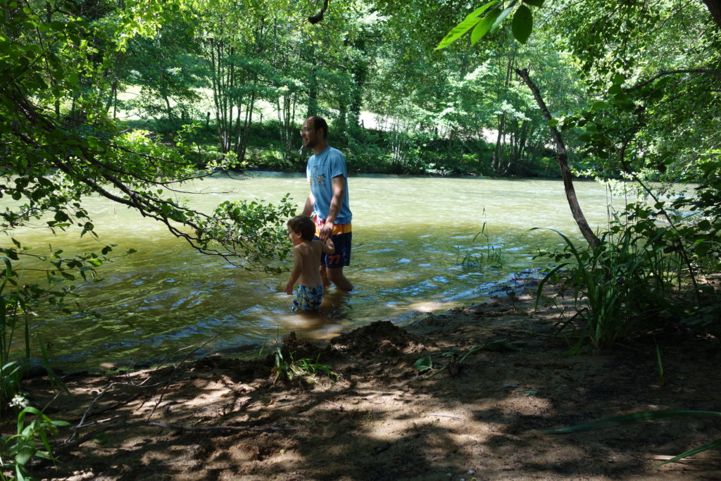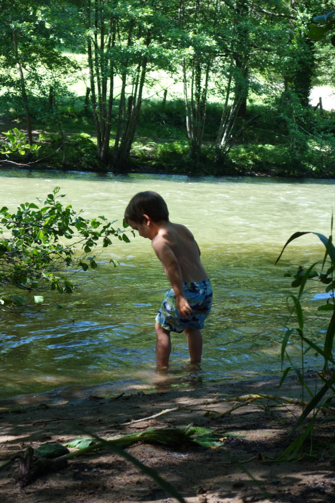 Aujourd’hui, nous sommes retournés voir le Viaur. Il a bien grossi depuis les sources que nous avions vues la semaine dernière 😉 Nous avons trouvé un petit coin très sympa, une mini-plage avec une sorte de sable (du ‘berk’ pour les intimes) qui a fait le bonheur d’Émile !