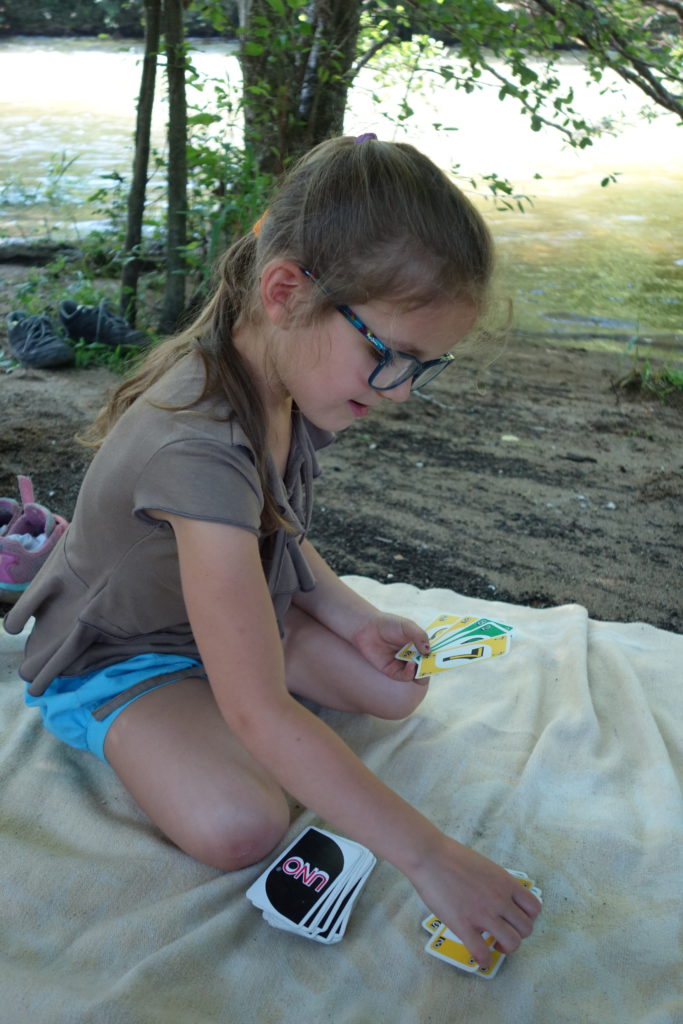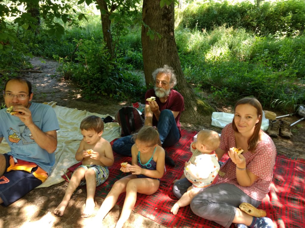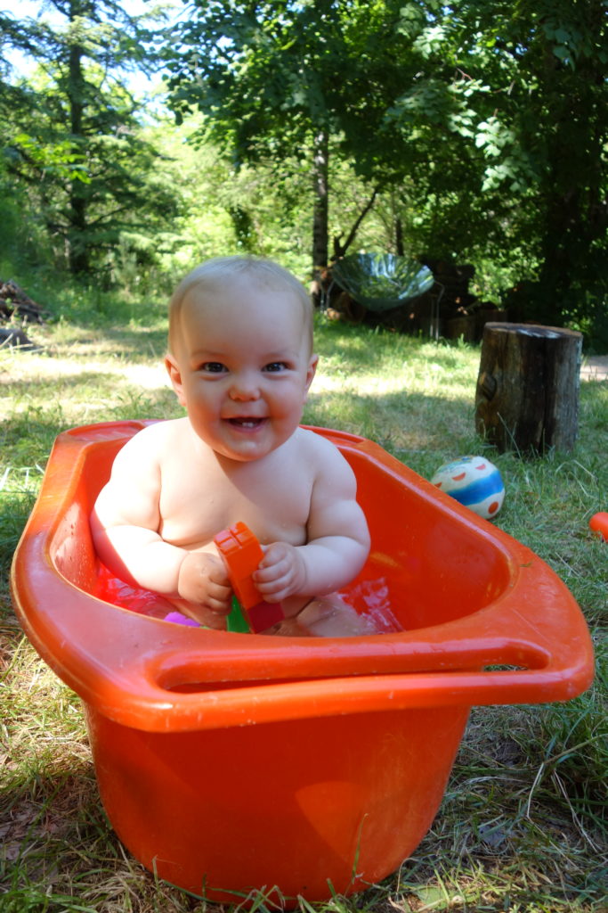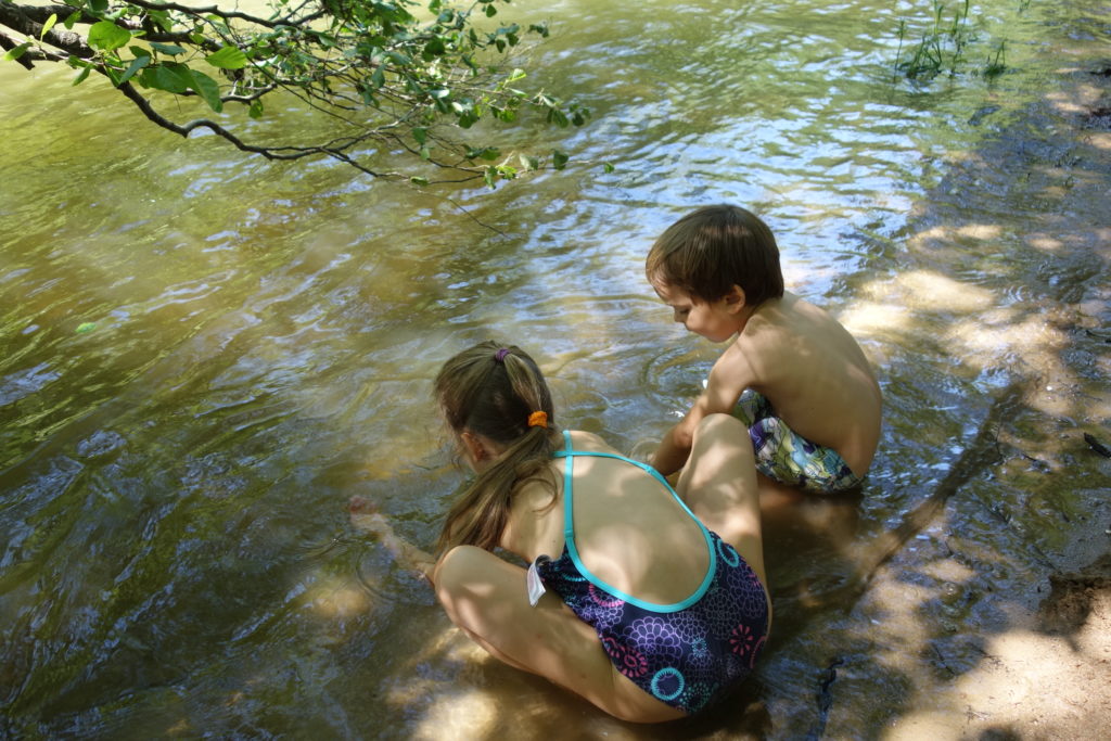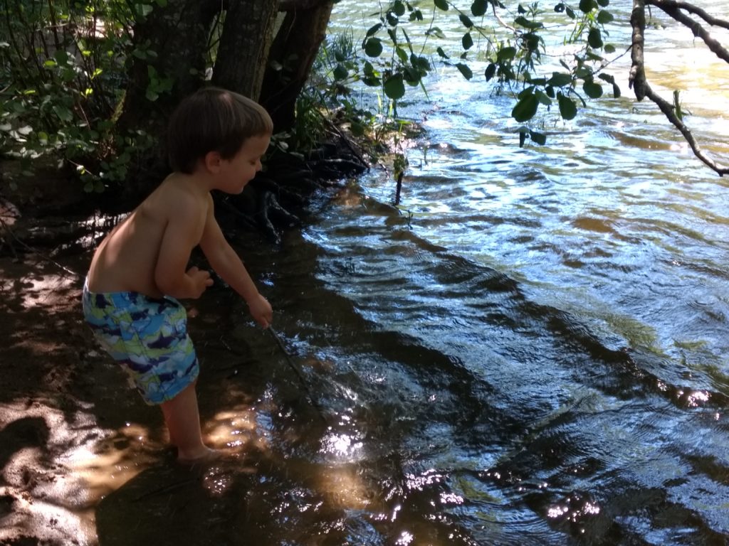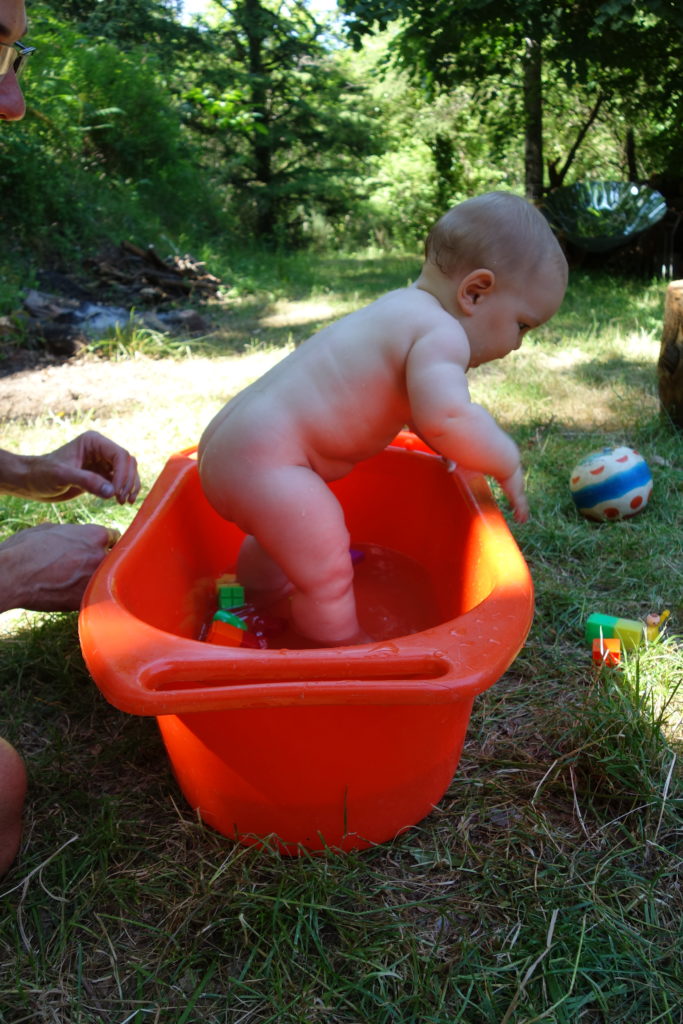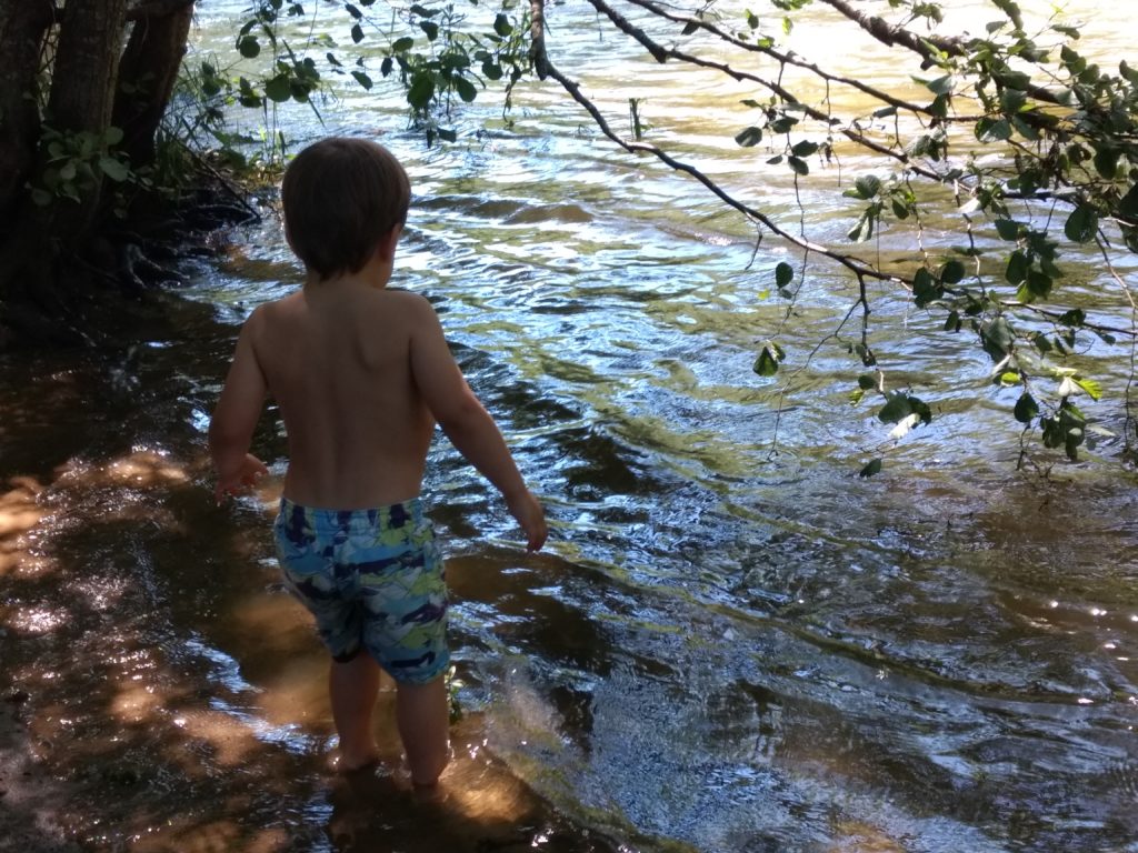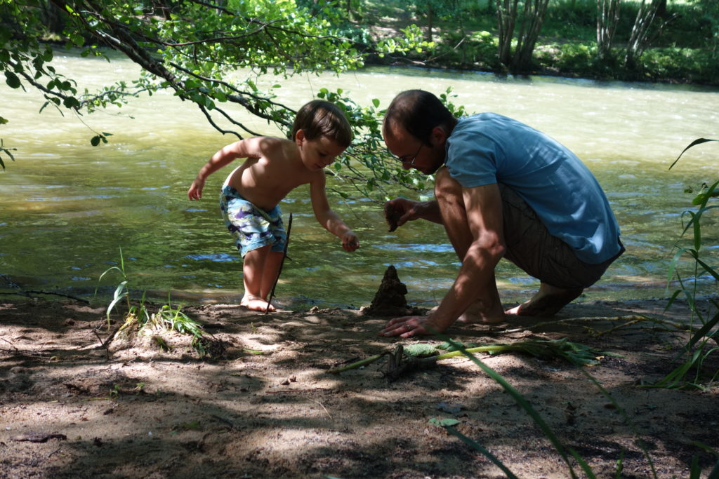 Aujourd’hui, nous sommes retournés voir le Viaur. Il a bien grossi depuis les sources que nous avions vues la semaine dernière 😉 Nous avons trouvé un petit coin très sympa, une mini-plage avec une sorte de sable (du ‘berk’ pour les intimes) qui a fait le bonheur d’Émile !