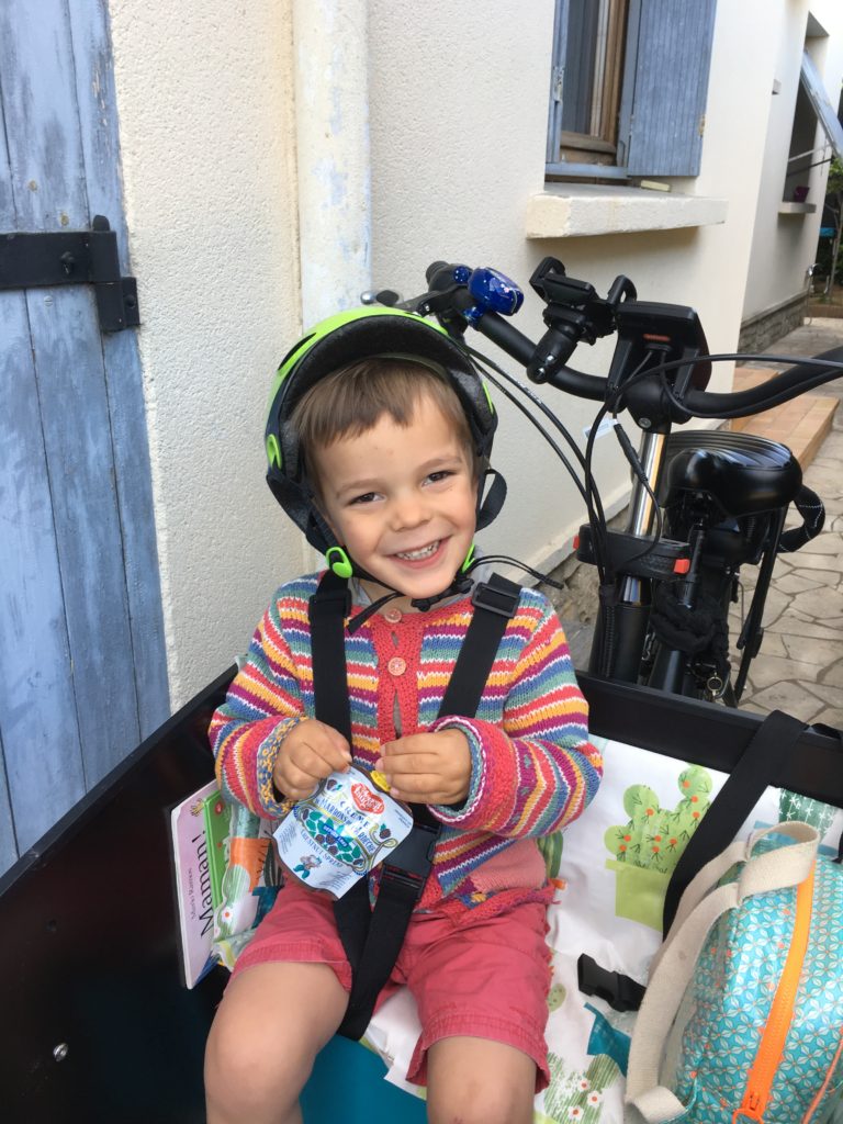 Les règles à la crèche sont moins strictes, puisque les enfants peuvent interagir entre eux, et partagent les jeux. Les parents ne peuvent rentrer dans aucun bâtiment, ni à l’école ni à la crèche. Émile a passé une très bonne journée, bien débutée avec une gourde de crème de marron !