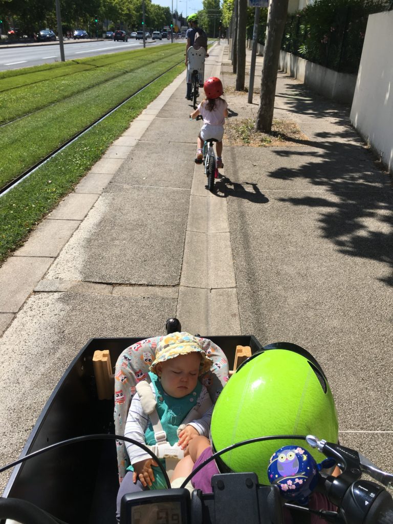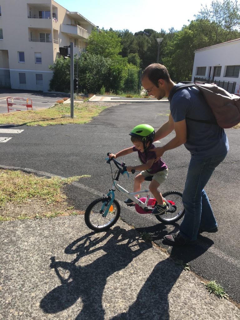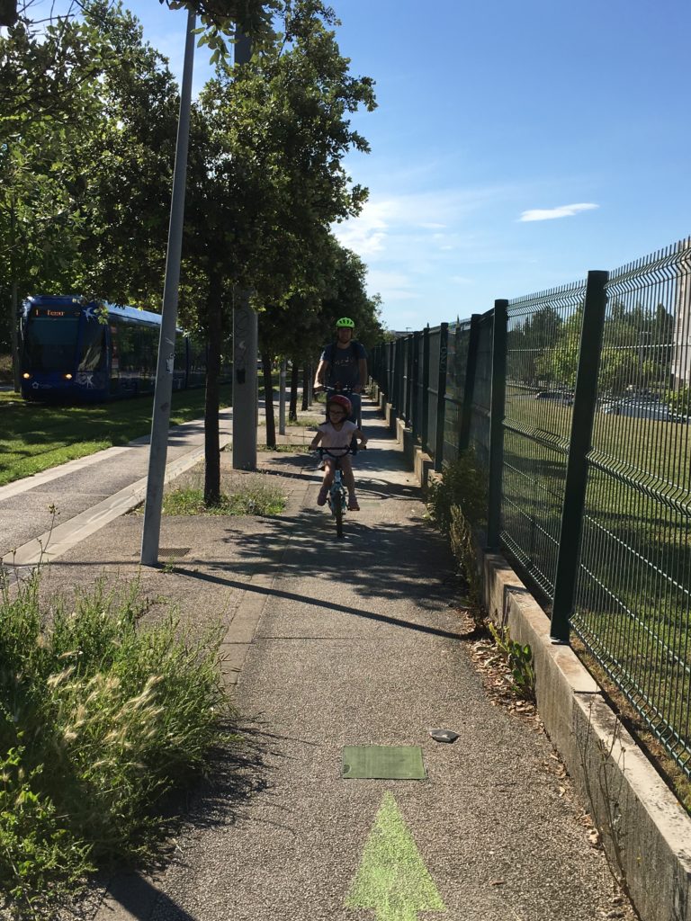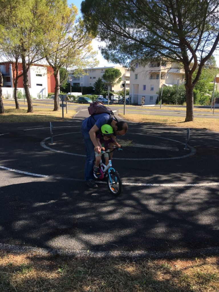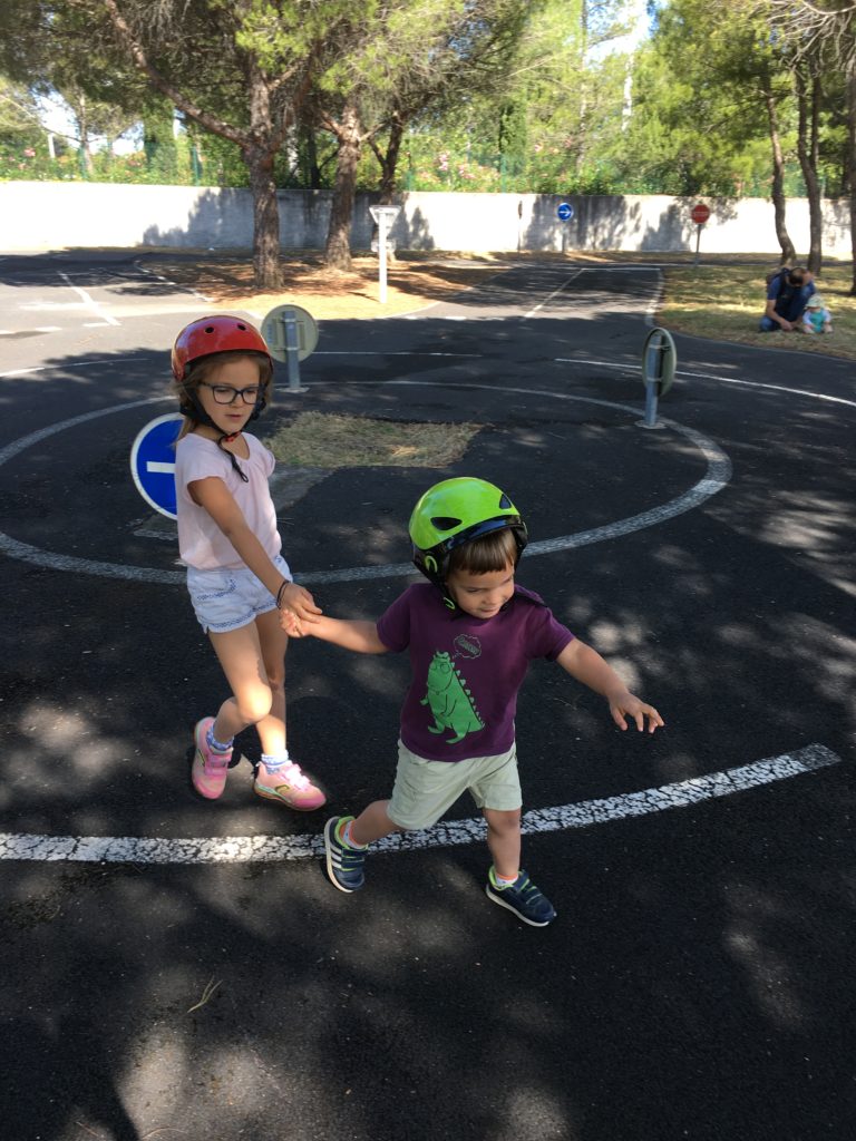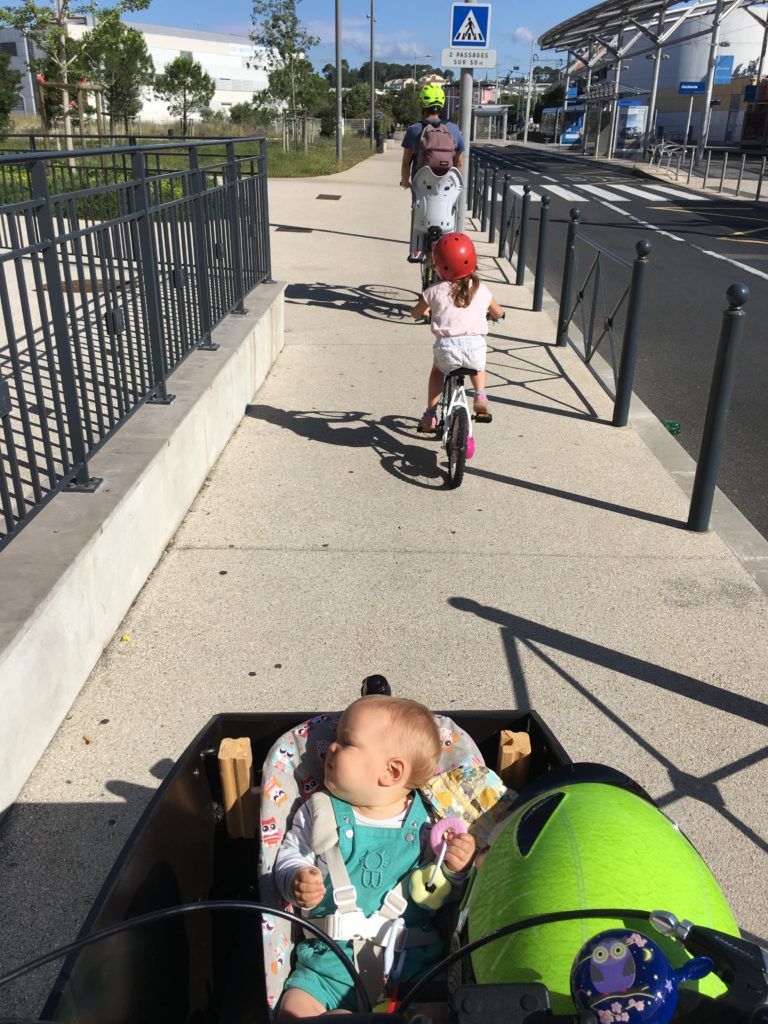 Mercredi matin, nous sommes allés faire un tour en vélo, avec Lucie sur son vélo, et Émile et Odile dans le cargo. Nous sommes allés au circuit de vélo du Mas des Moulins, qui était bien ouvert !