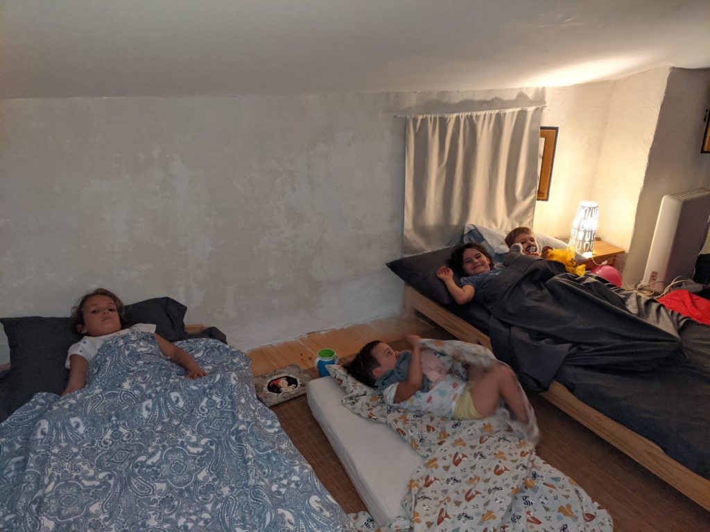 Les 4 “grands” ont dormi ensemble. Justine et Maxime ont même commencé la nuit dans la même lit (Lucie était très jalouse, et voulait elle aussi avoir son petit frère dans son lit), mais ils n’ont pas tenu longtemps 😉