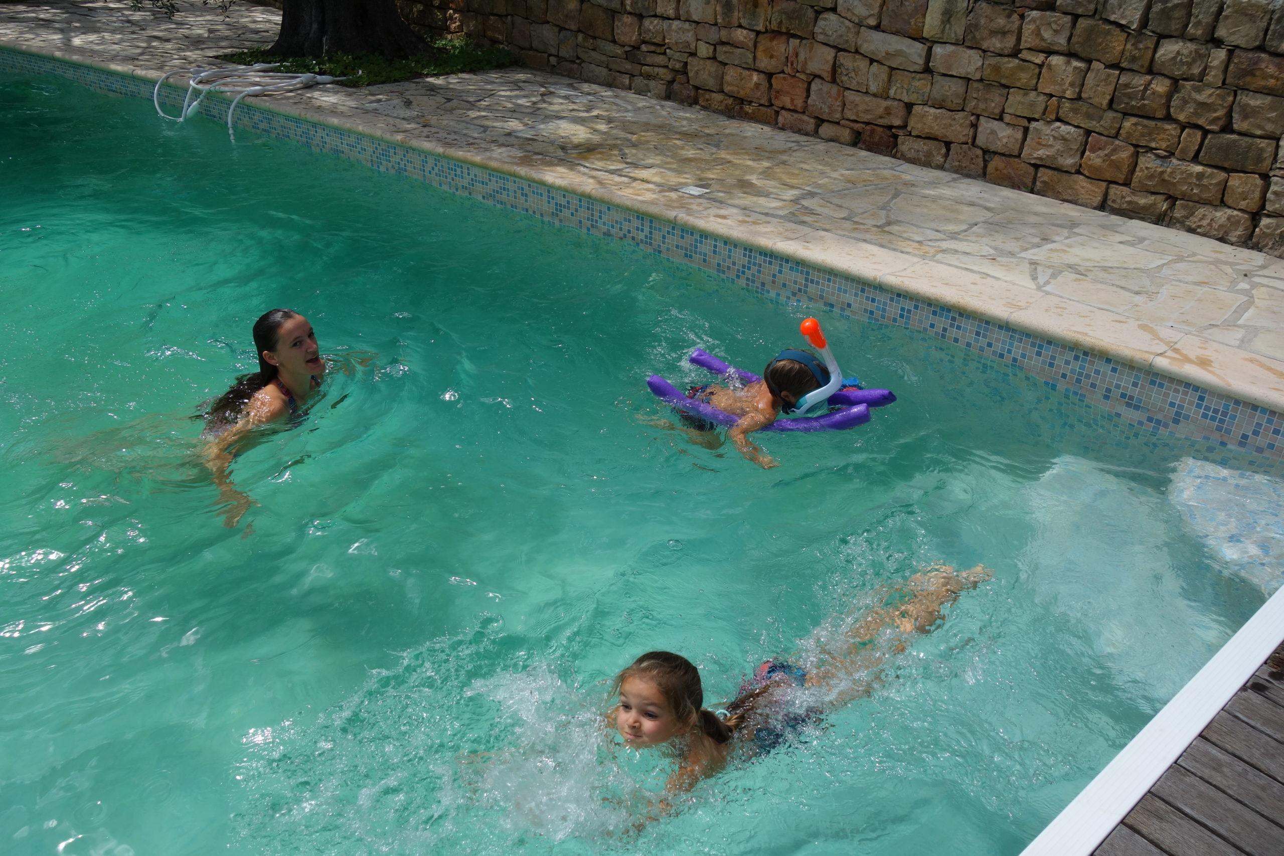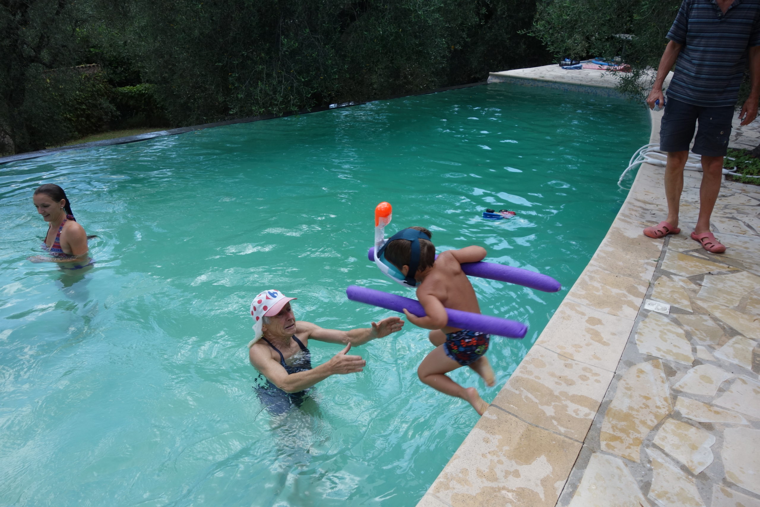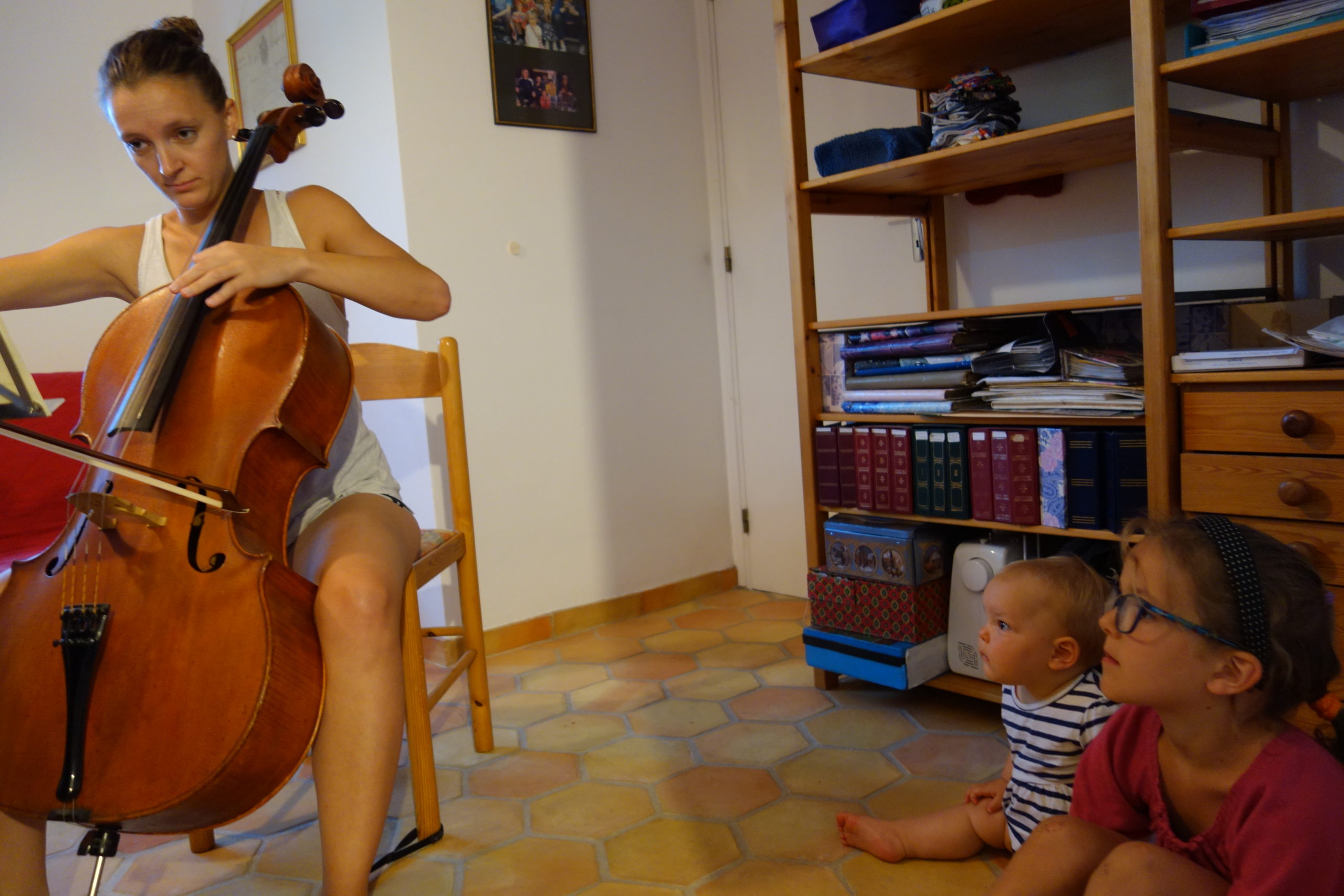 Jeanne a ensuite passé l’après midi avec nous au bord de la piscine. Les filles ont beaucoup aimé l’écouter jouer du violoncelle avec Grand-papa.