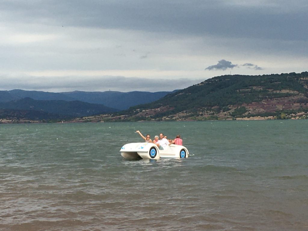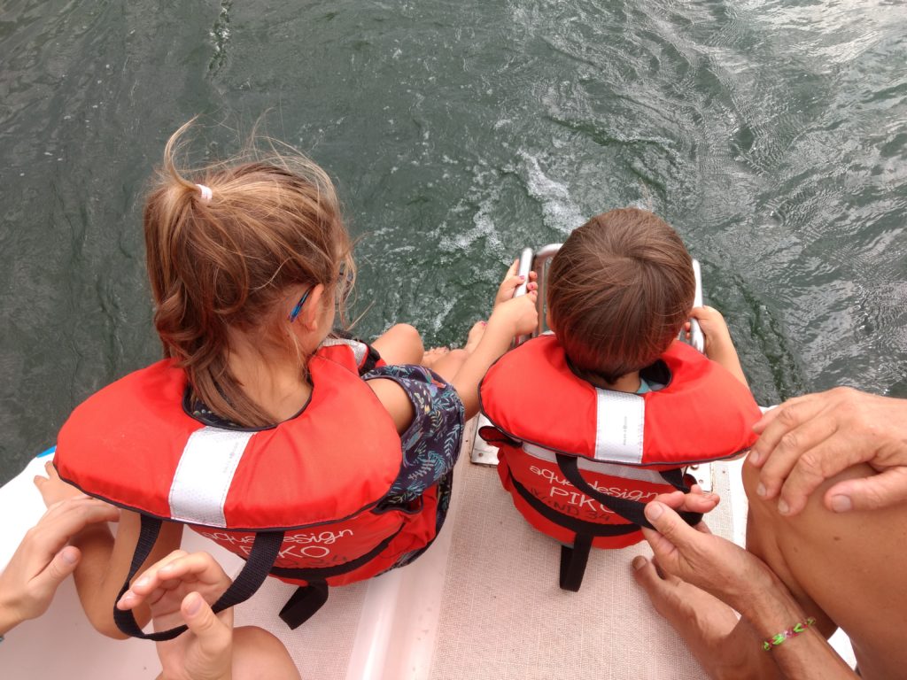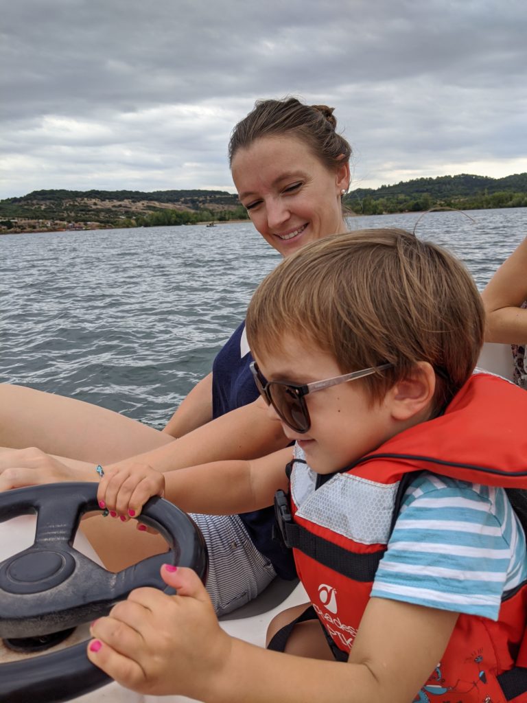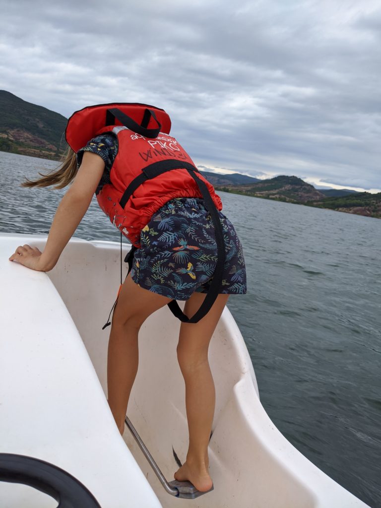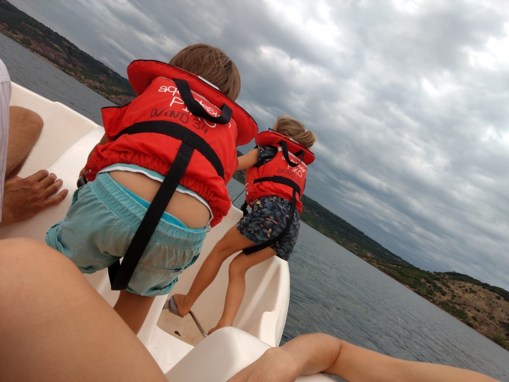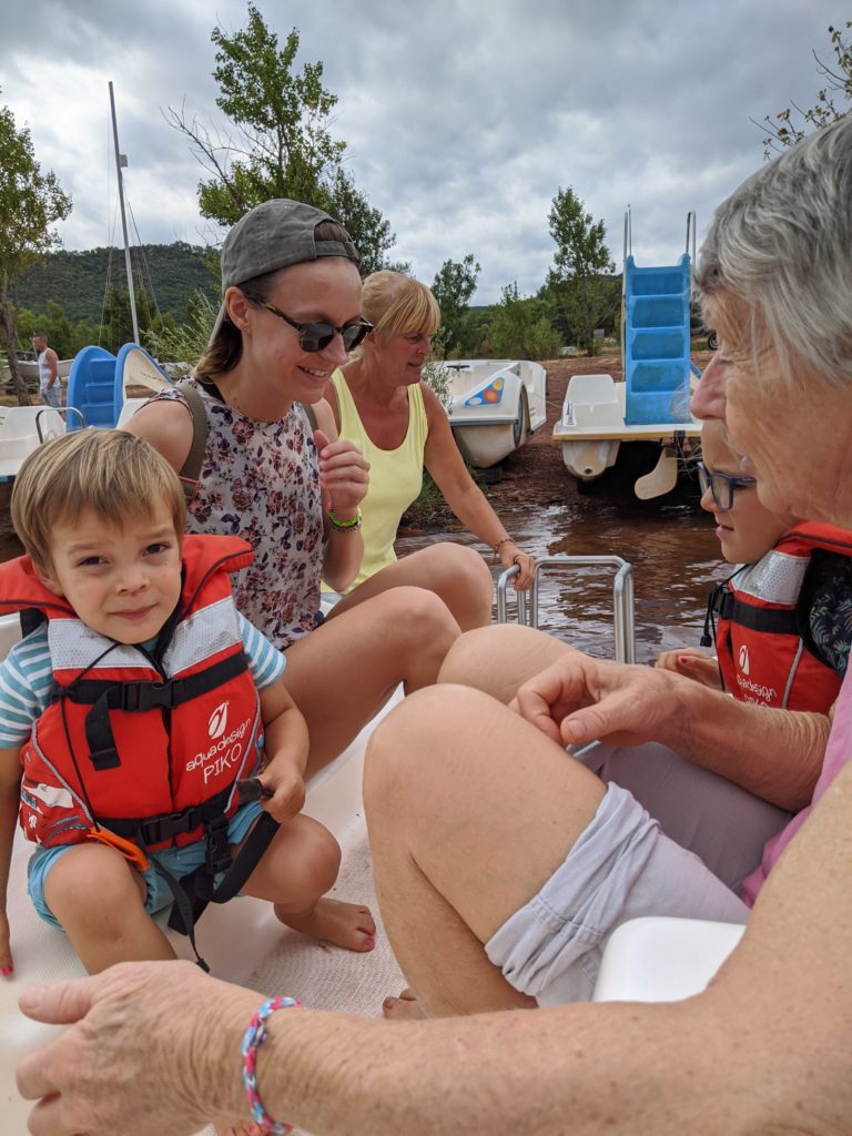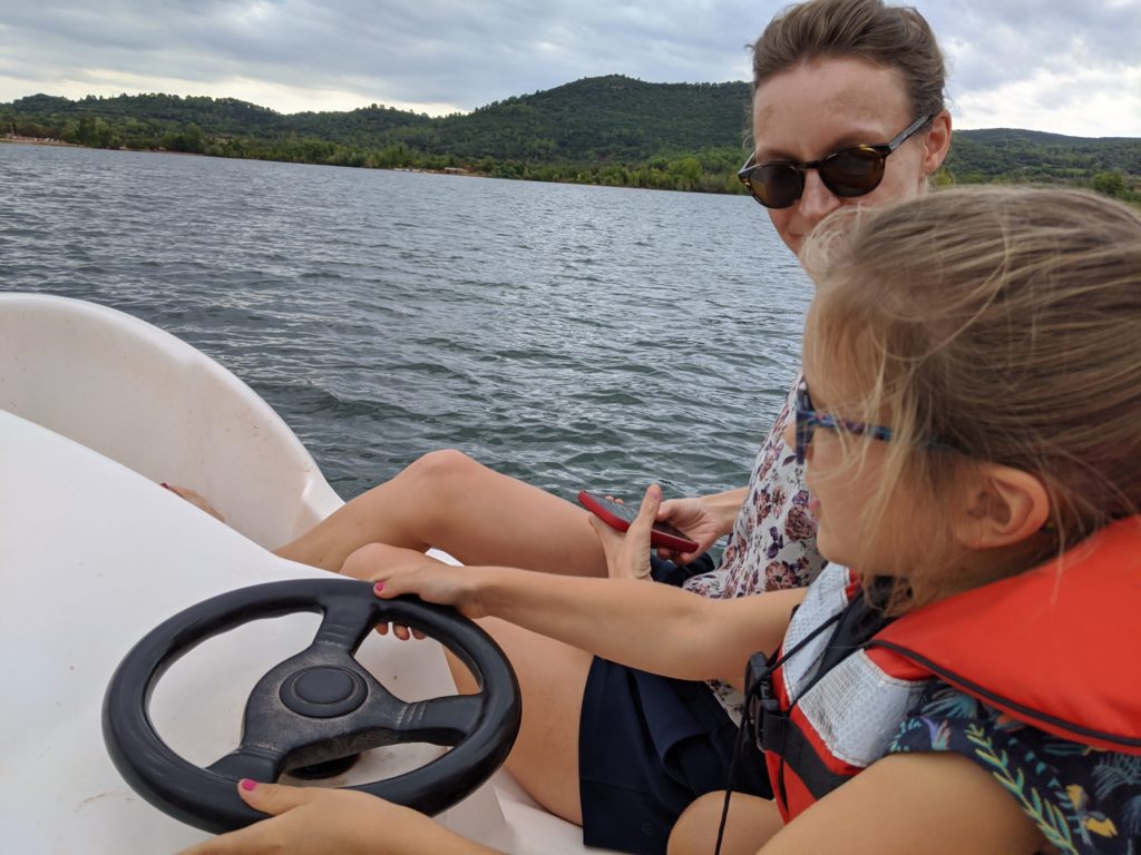 Au lac du Salagou, nous avons réussi à louer un pédalo 6 places (officiellement), dans lequel nous avons pu faire un beau tour. Lucie et Émile ont adoré !