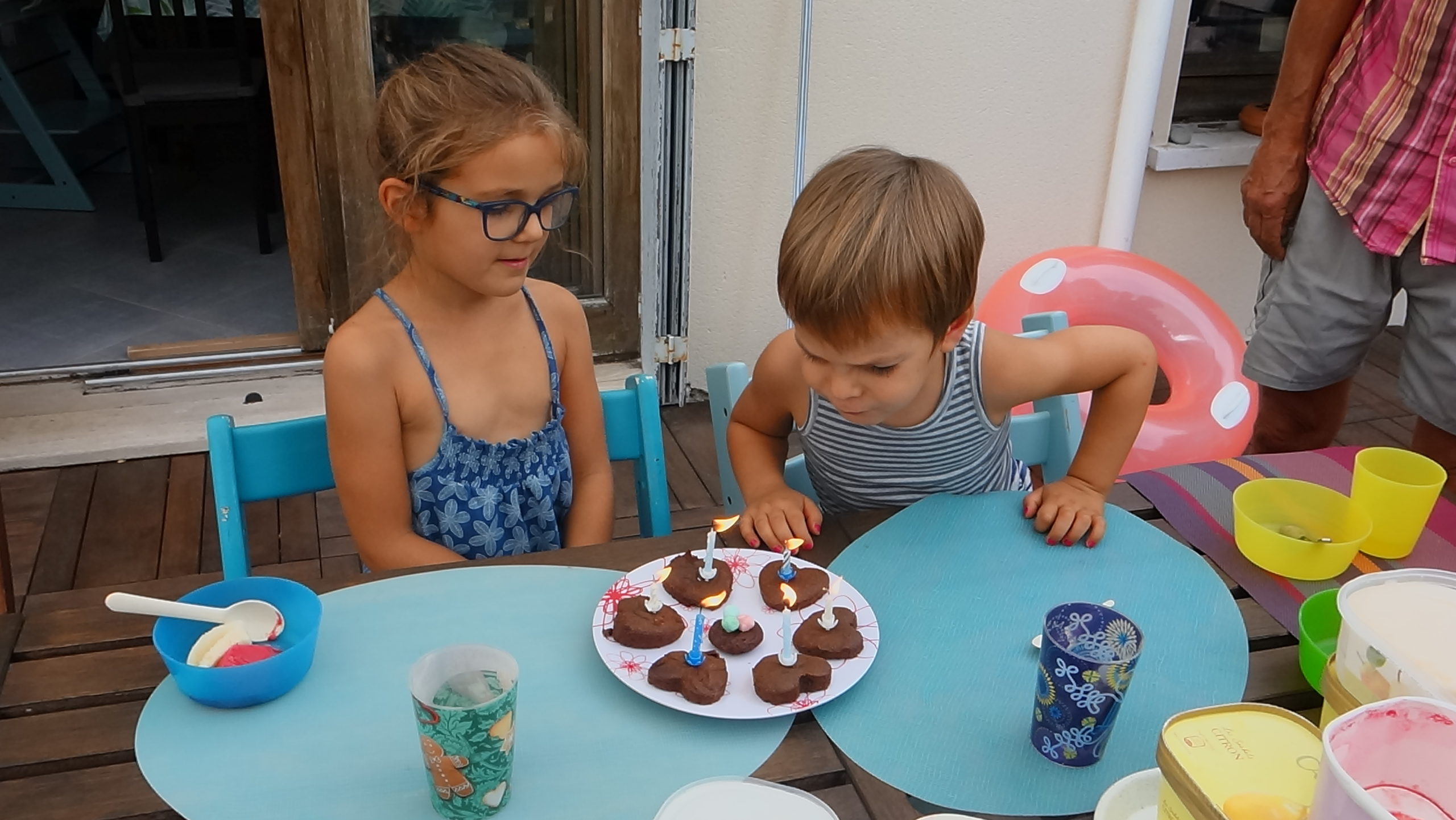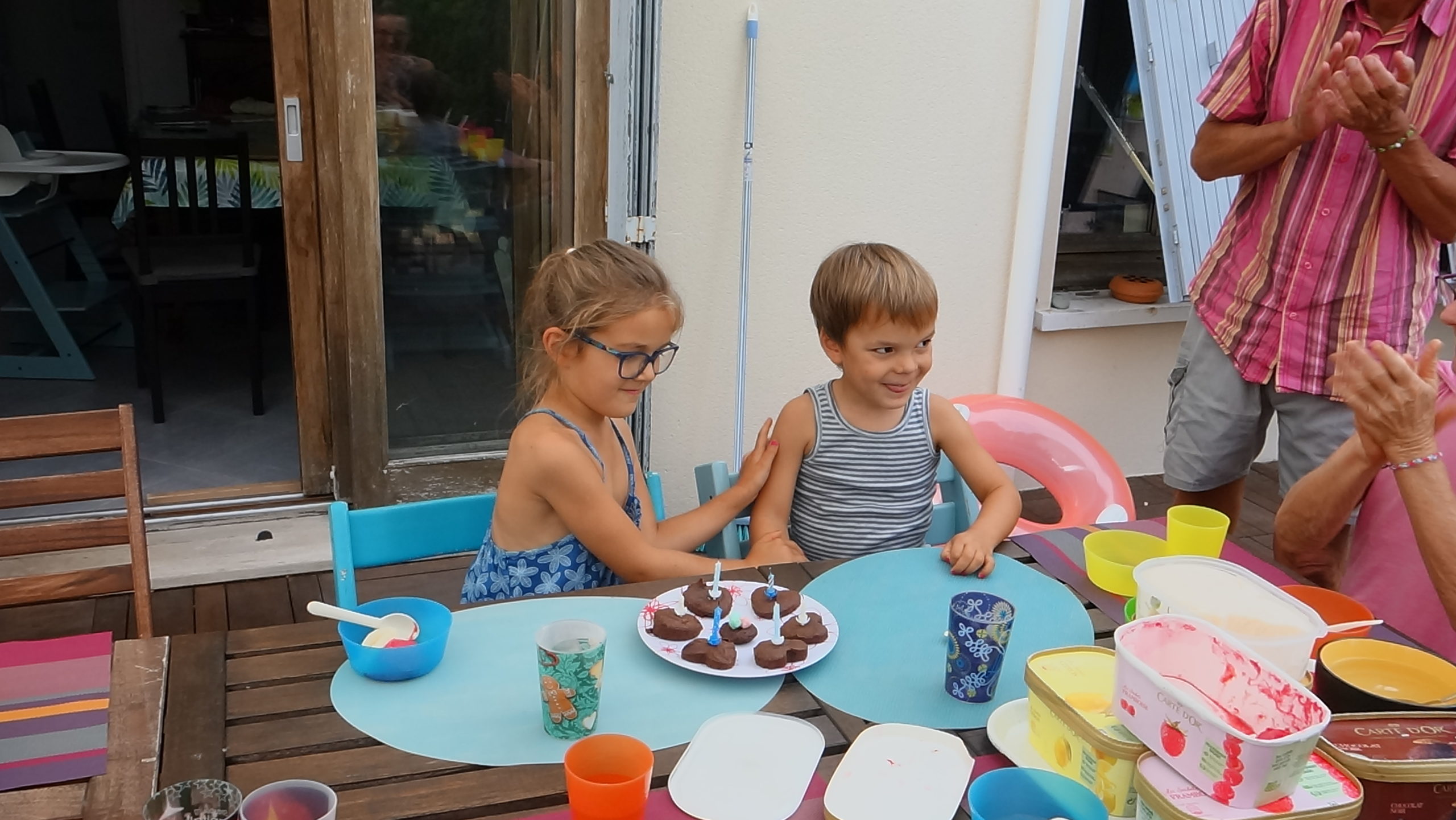 Pour le goûter, Émile a soufflé les 6 bougies de Lucie sur ses muffins d’anniversaire et Lucie a ouvert ses cadeaux.