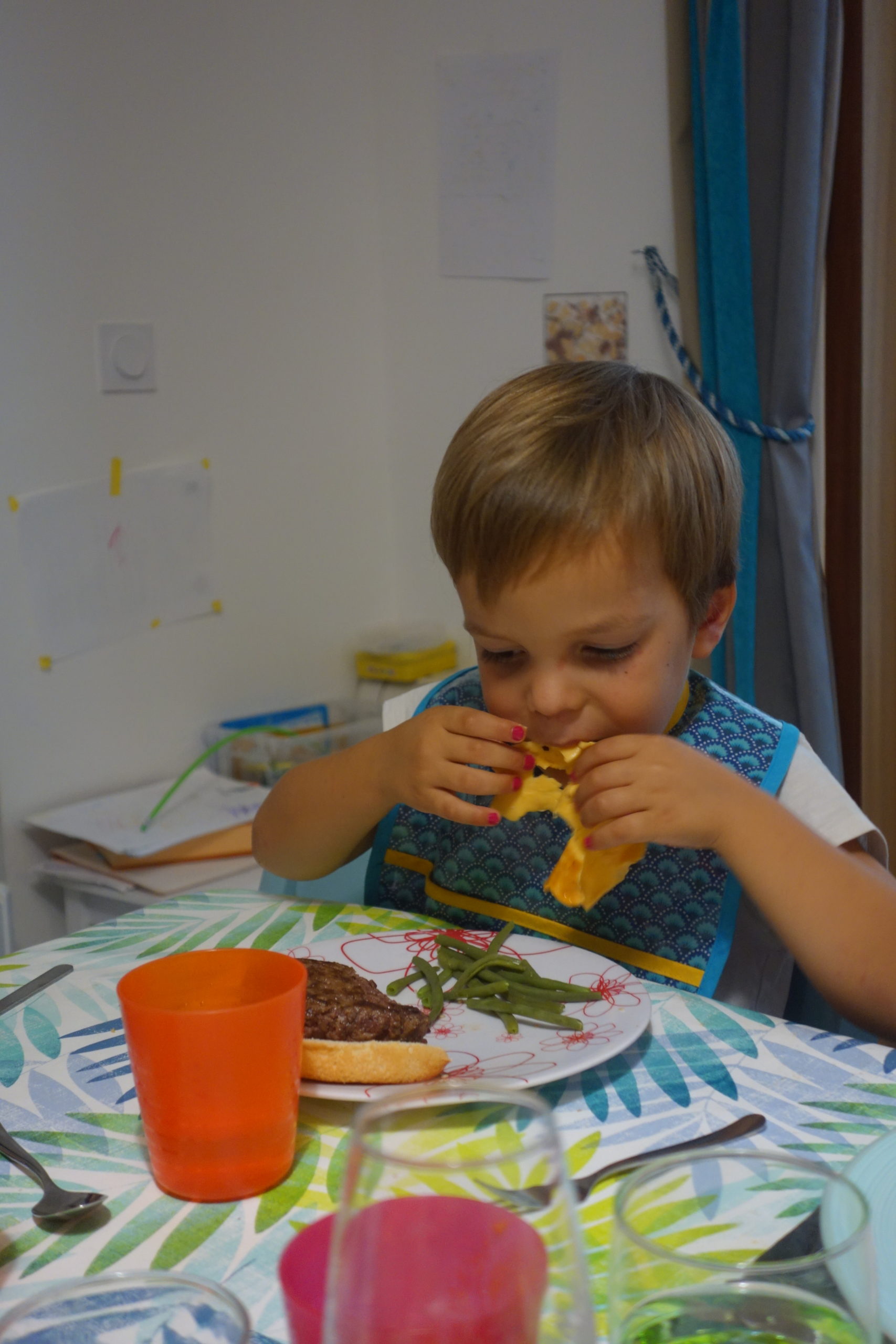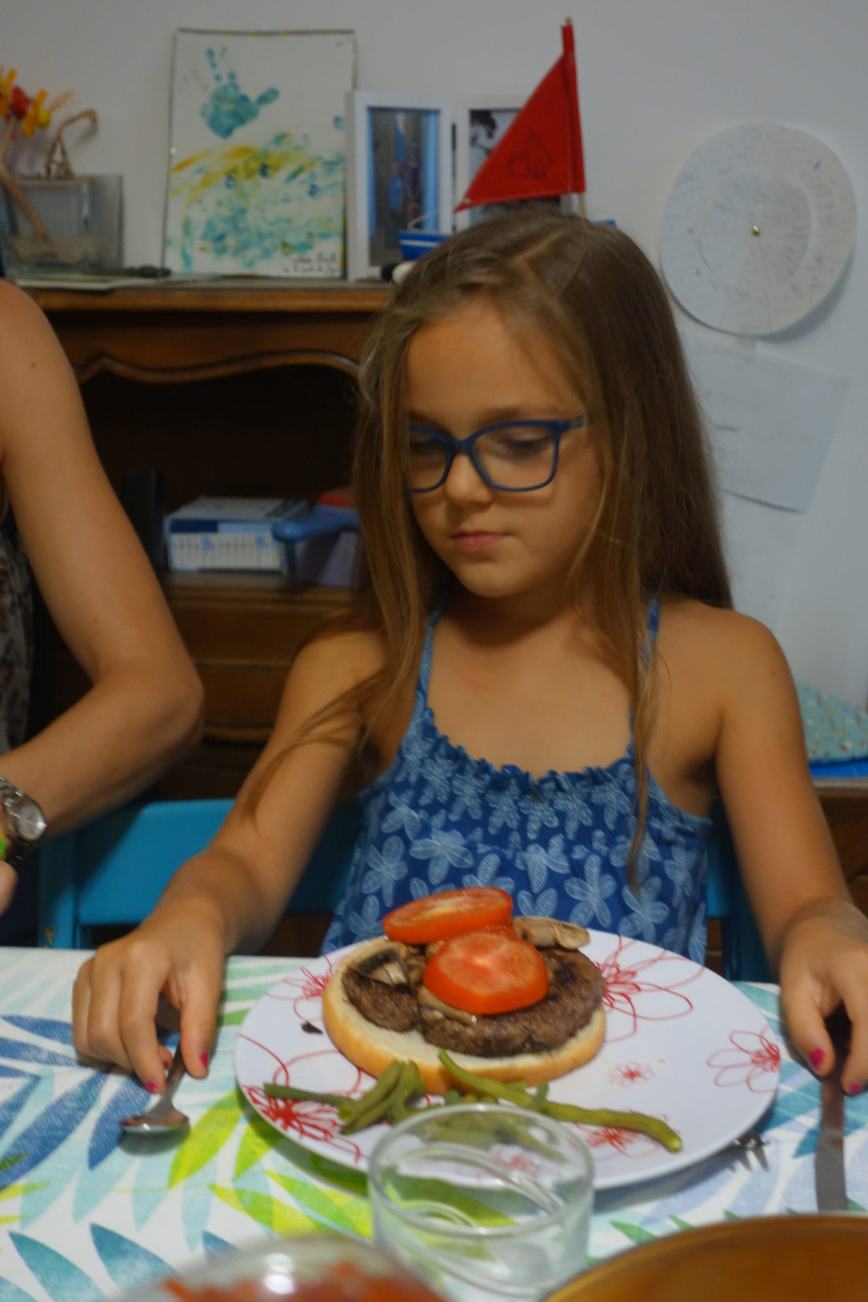 Et pour le dîner, Lucie a choisi le menu : hamburgers-frites-haricots verts.