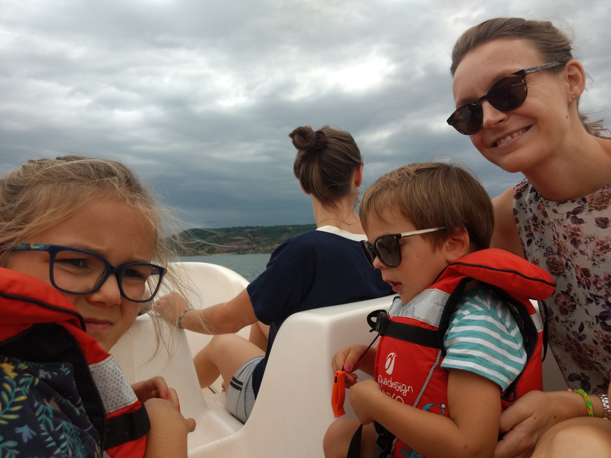 Au lac du Salagou, nous avons réussi à louer un pédalo 6 places (officiellement), dans lequel nous avons pu faire un beau tour. Lucie et Émile ont adoré !