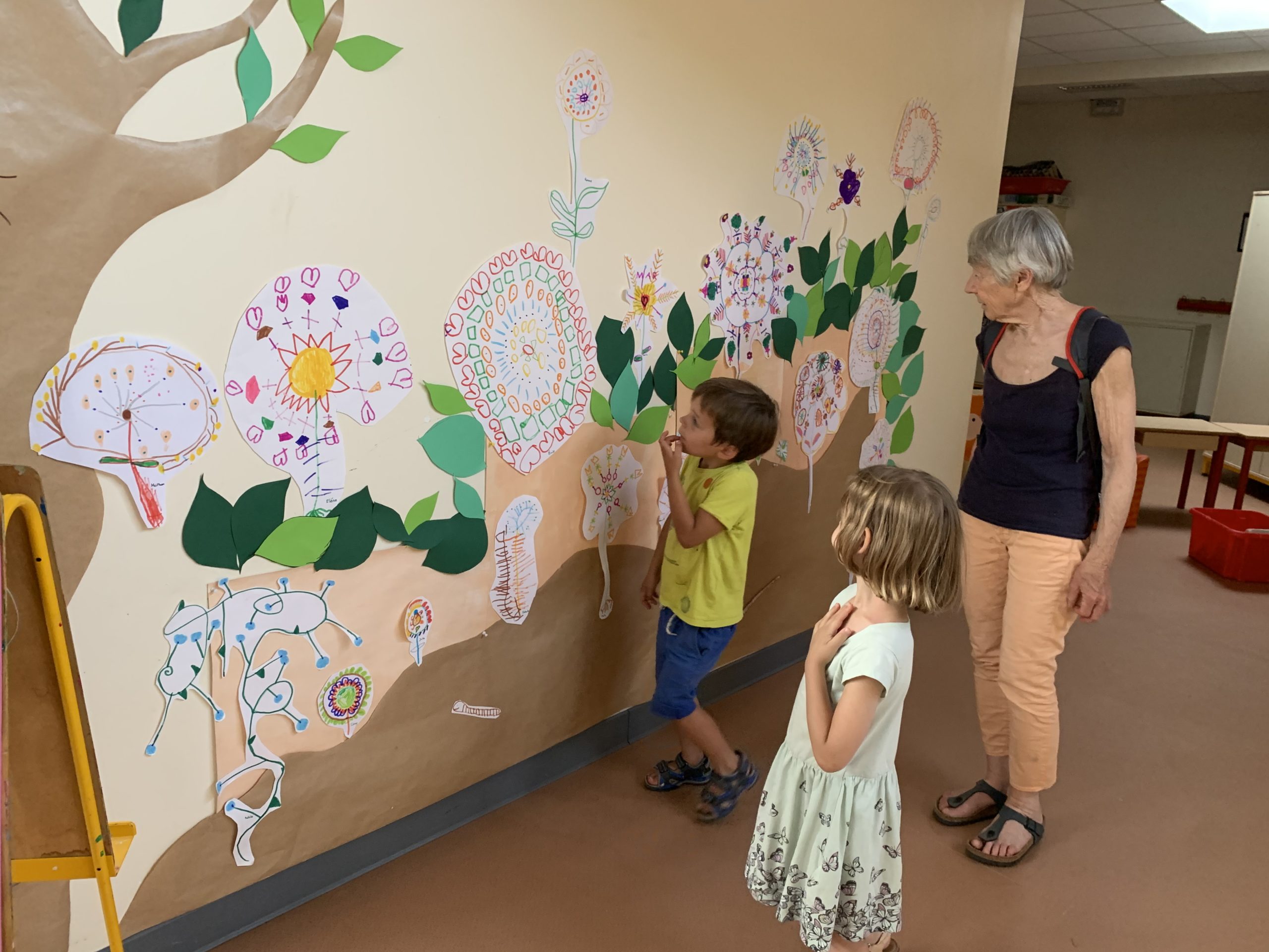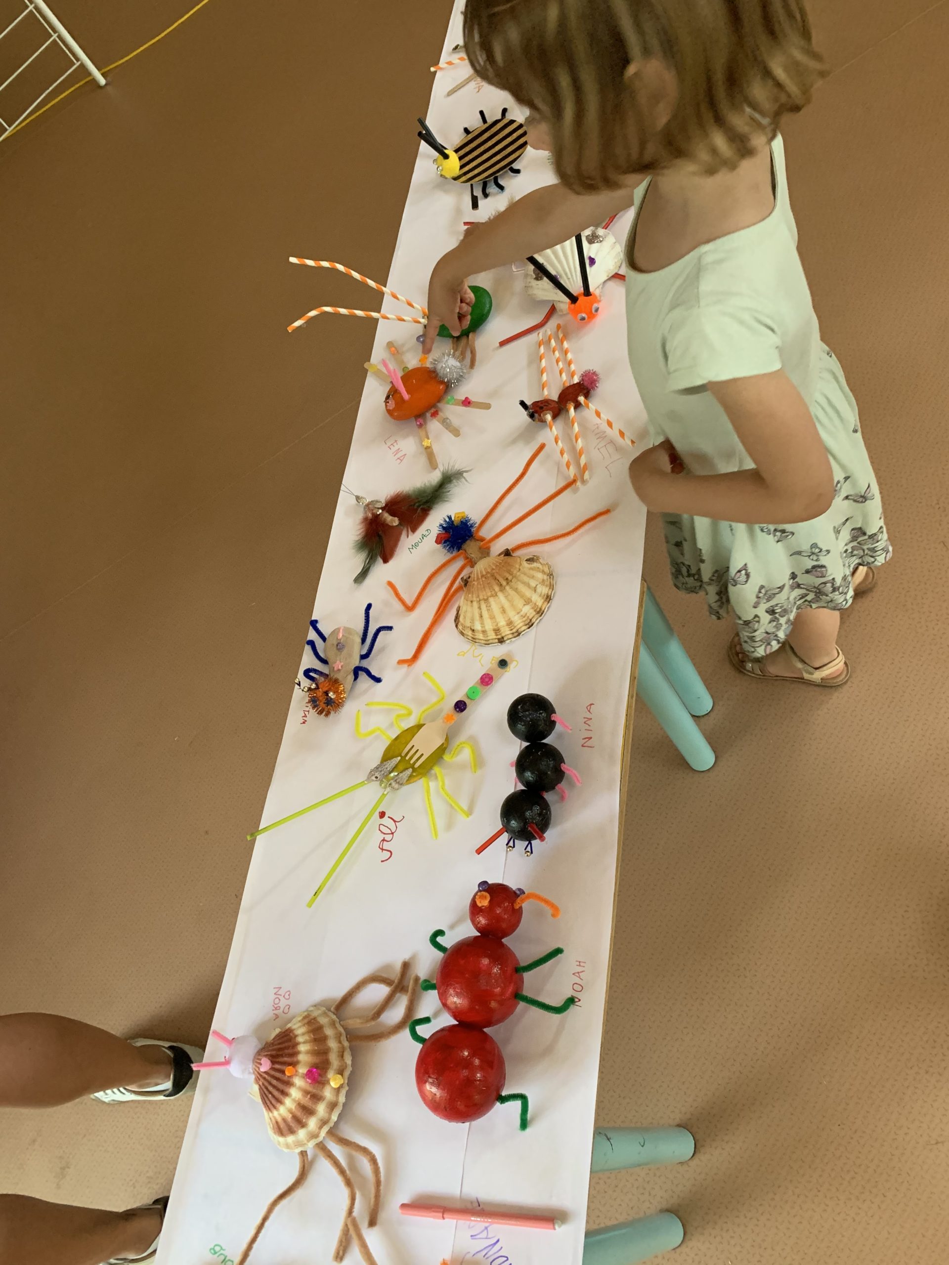 Dans la salle de motricité étaient exposés les oeuvres de toutes les classes sur le thème des insecte.