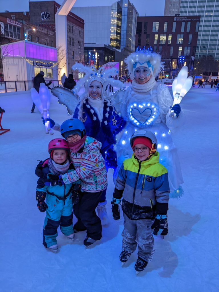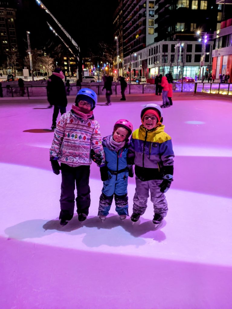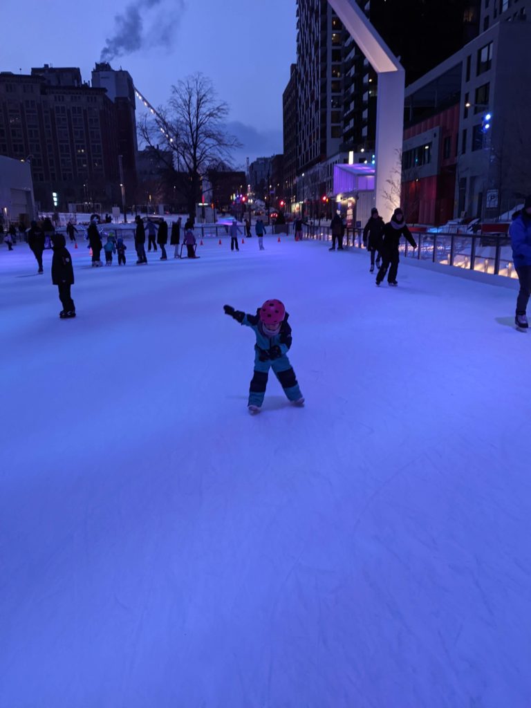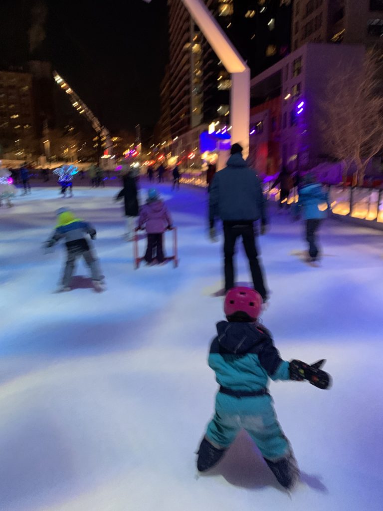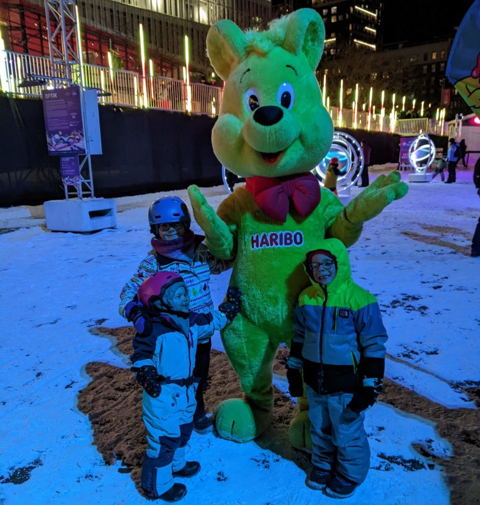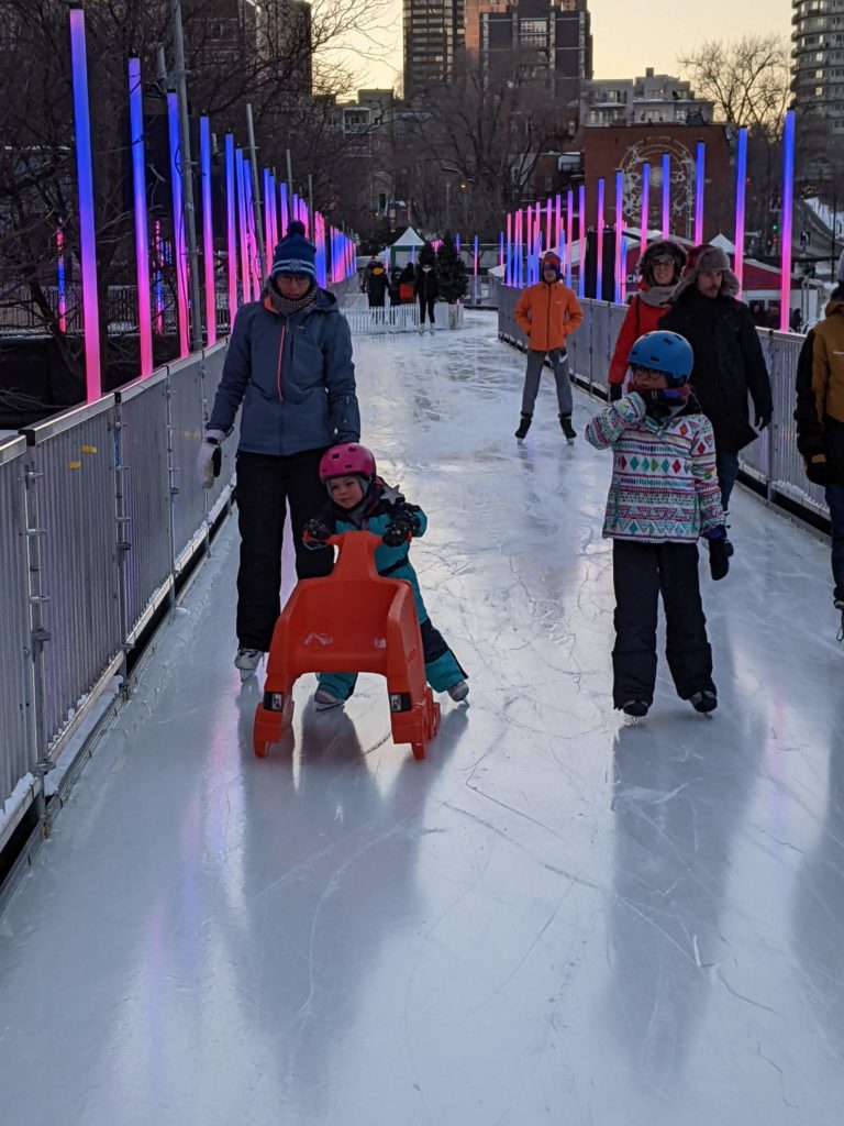 Vendredi soir, après la journée de garderie d’Odile, nous sommes allés faire du patin sur le sentier de patin de Montréal en lumières. Odile l’aime particulièrement car les supports de glisse pour enfants sont en accès libre. Les enfants ont testé toutes les combinaisons possibles 😉 Nous avons aussi mangé des queues de castor, et reçu des sachets de bonbons Haribo et fait un calin à l’ours.