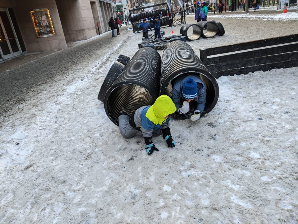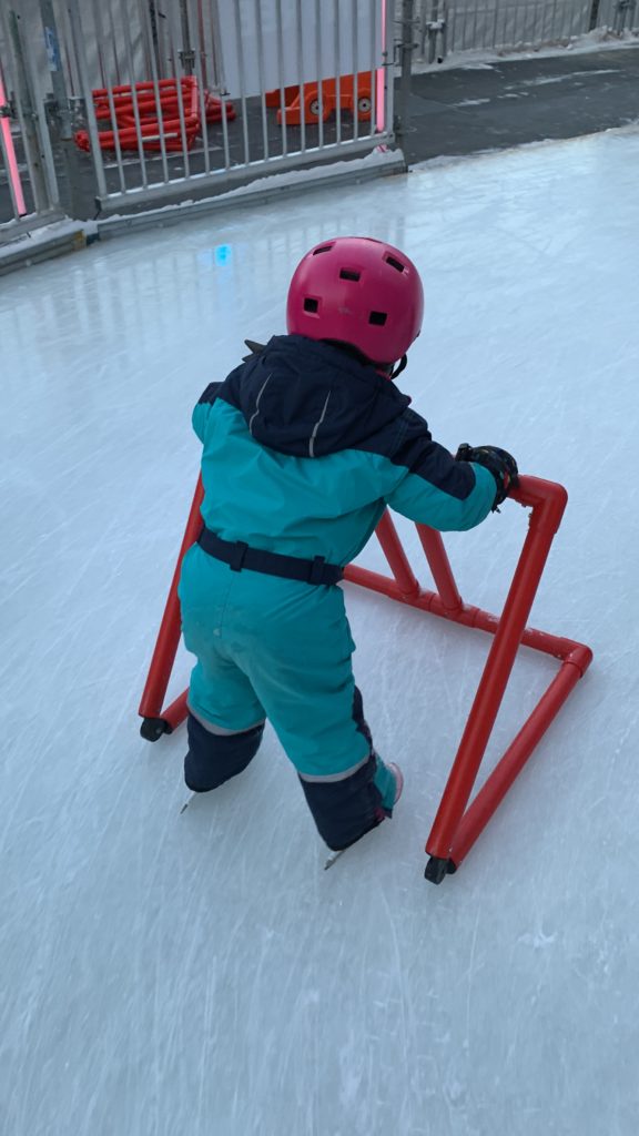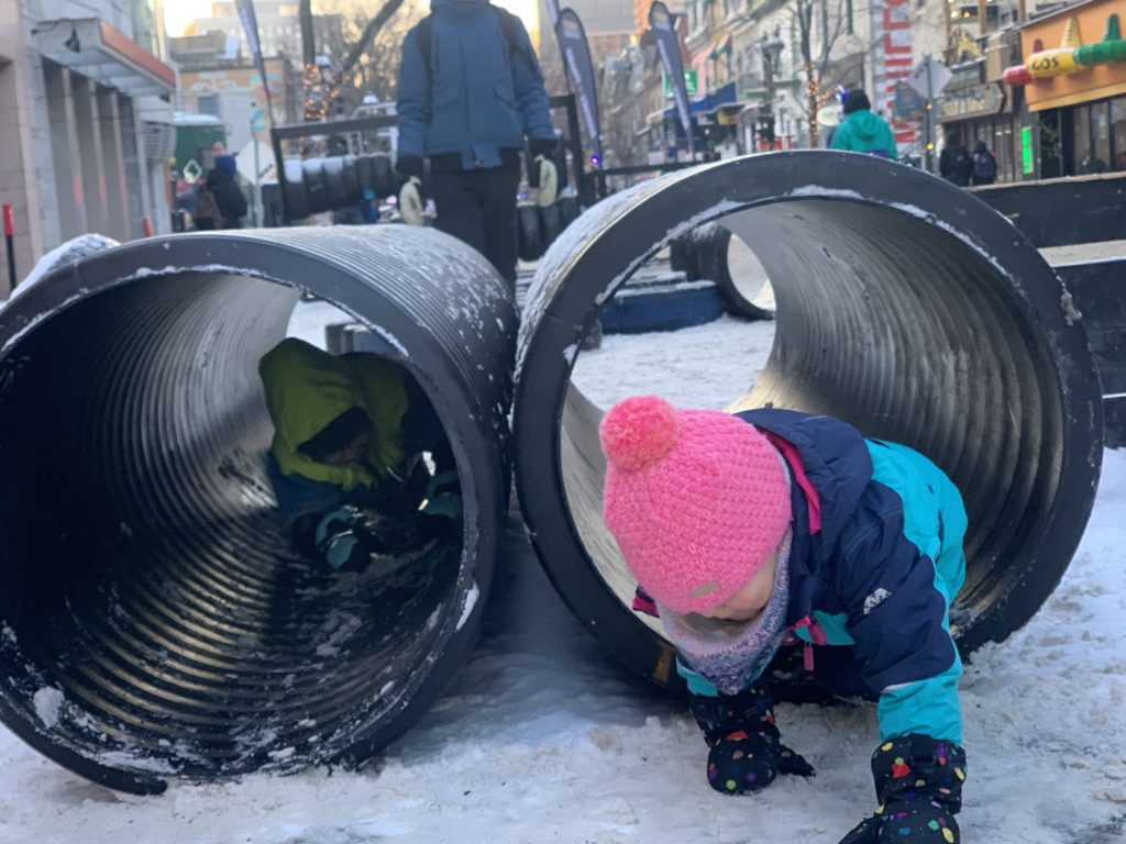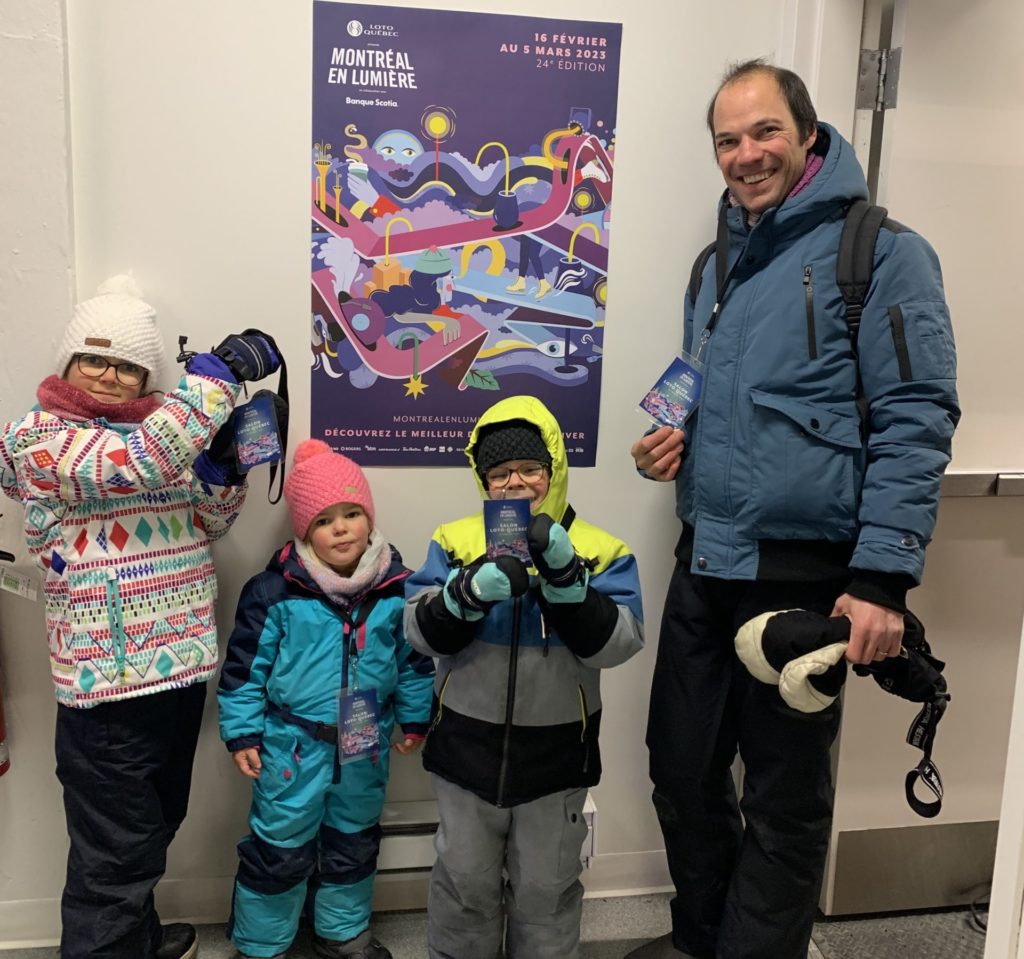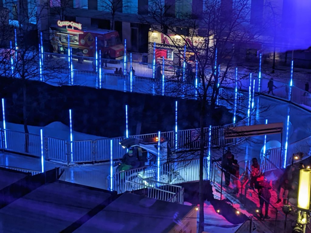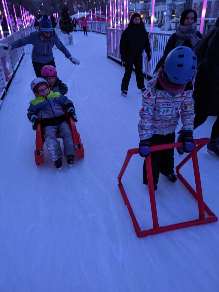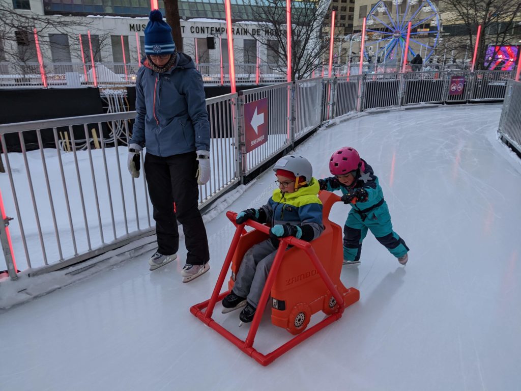 Vendredi soir, après la journée de garderie d’Odile, nous sommes allés faire du patin sur le sentier de patin de Montréal en lumières. Odile l’aime particulièrement car les supports de glisse pour enfants sont en accès libre. Les enfants ont testé toutes les combinaisons possibles 😉 Nous avons aussi mangé des queues de castor, et reçu des sachets de bonbons Haribo et fait un calin à l’ours.