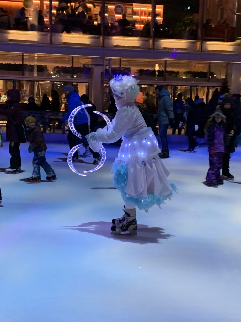 Nous avons enchaîné avec une séance de patin sur l’esplanade tranquille où patinaient également 2 jongleuses lumineuses. Les enfants prennent de plus en plus de plaisir à patiner, c’est très chouette.