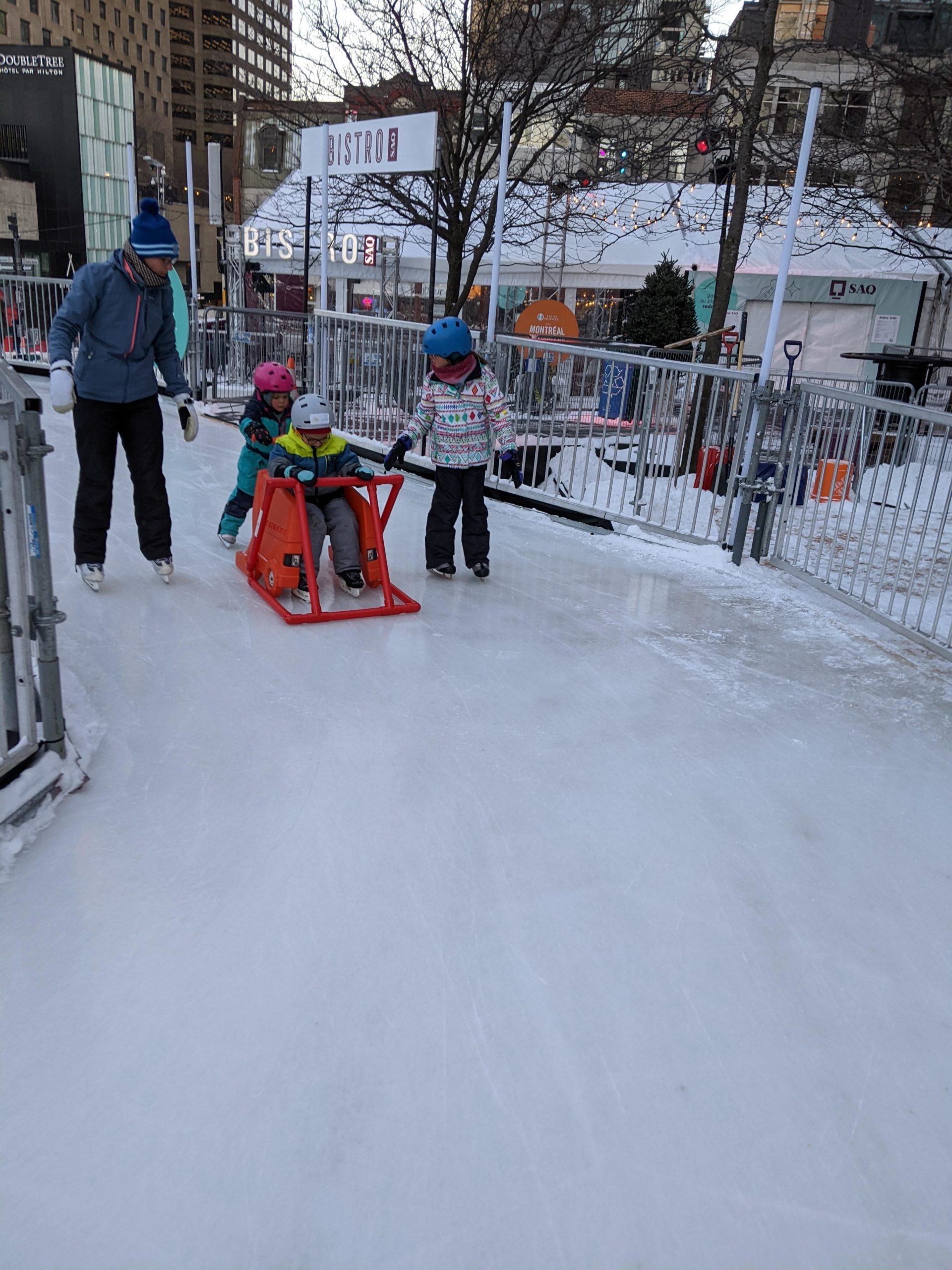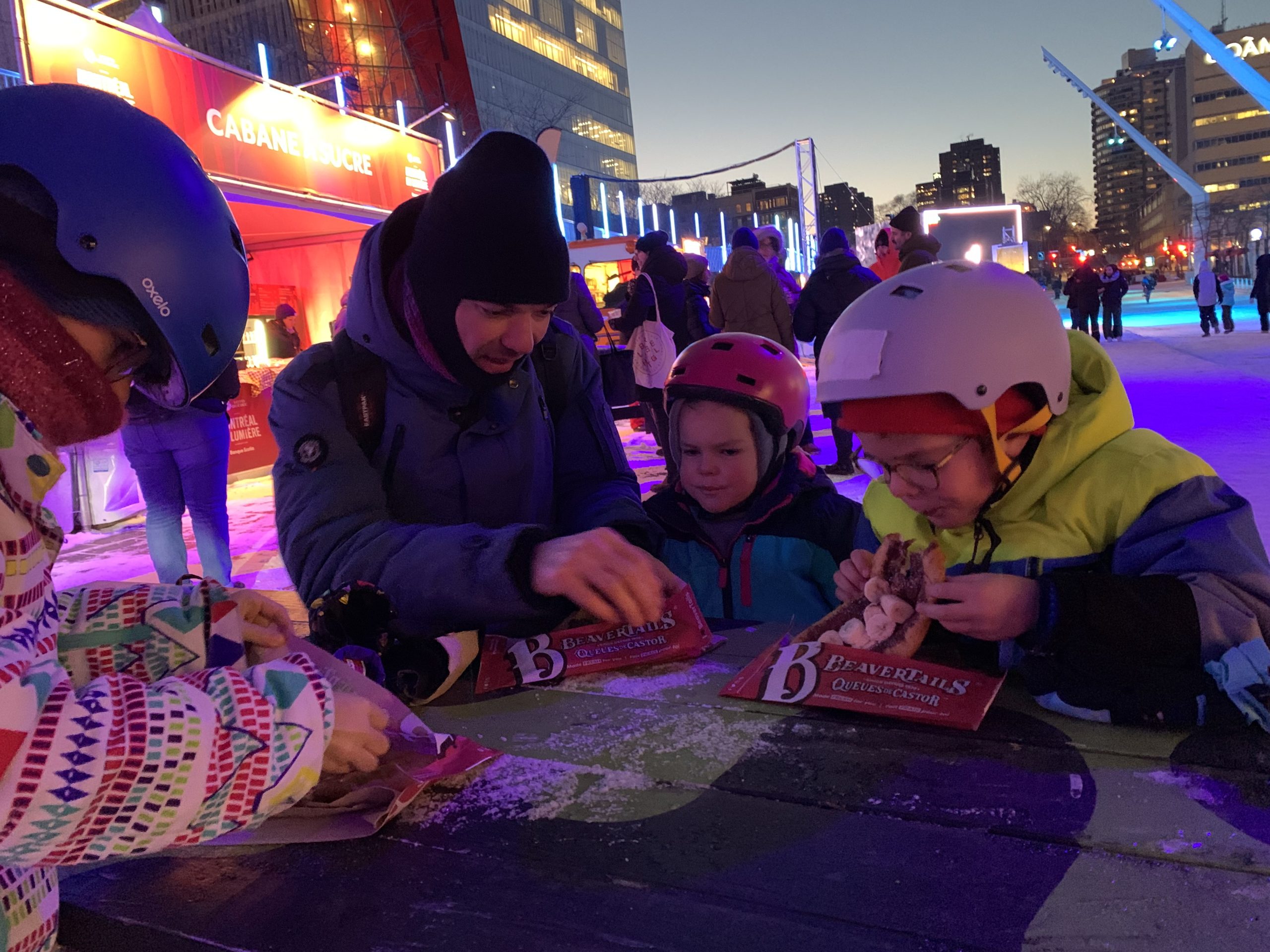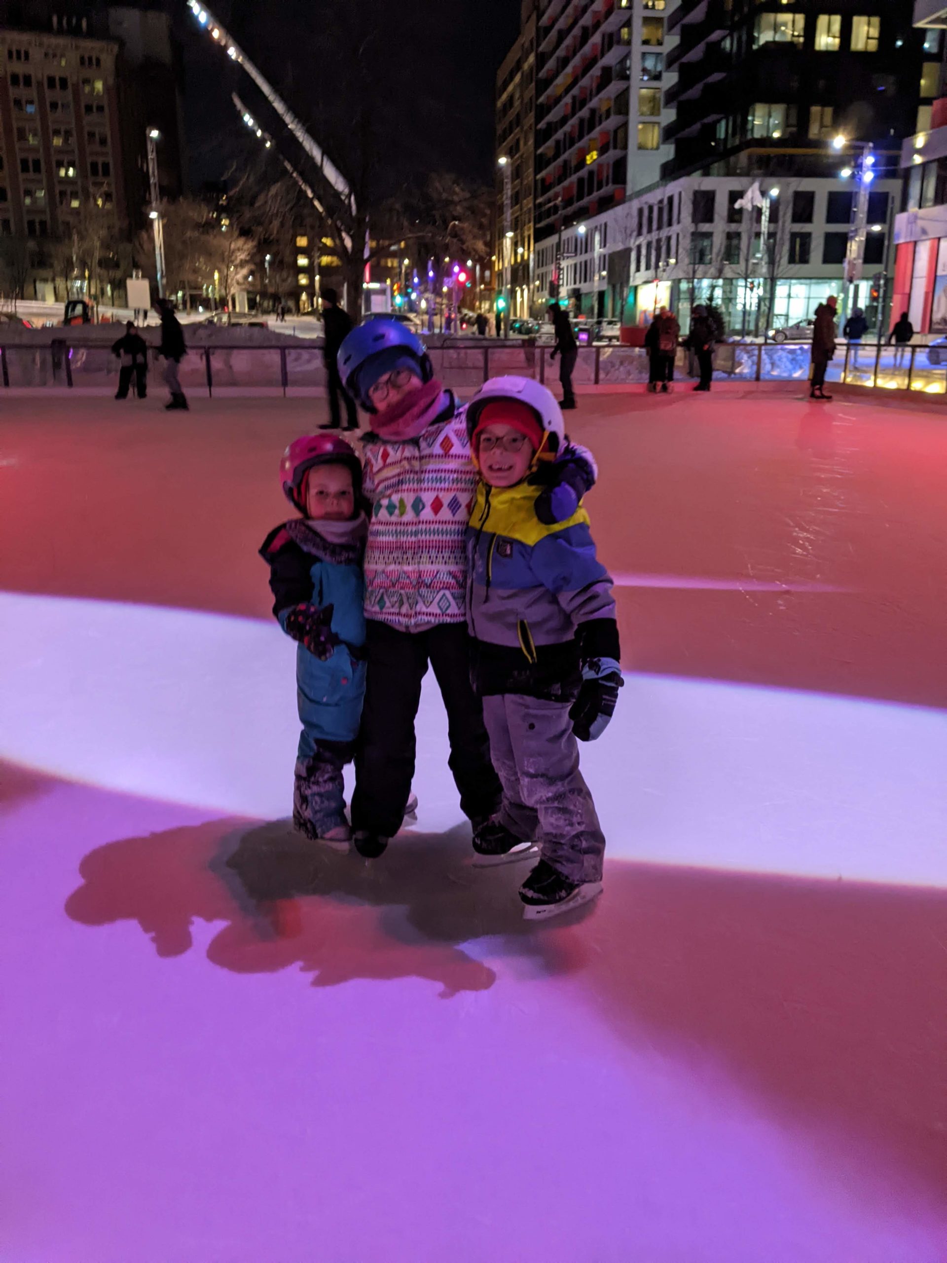 Vendredi soir, après la journée de garderie d’Odile, nous sommes allés faire du patin sur le sentier de patin de Montréal en lumières. Odile l’aime particulièrement car les supports de glisse pour enfants sont en accès libre. Les enfants ont testé toutes les combinaisons possibles 😉 Nous avons aussi mangé des queues de castor, et reçu des sachets de bonbons Haribo et fait un calin à l’ours.