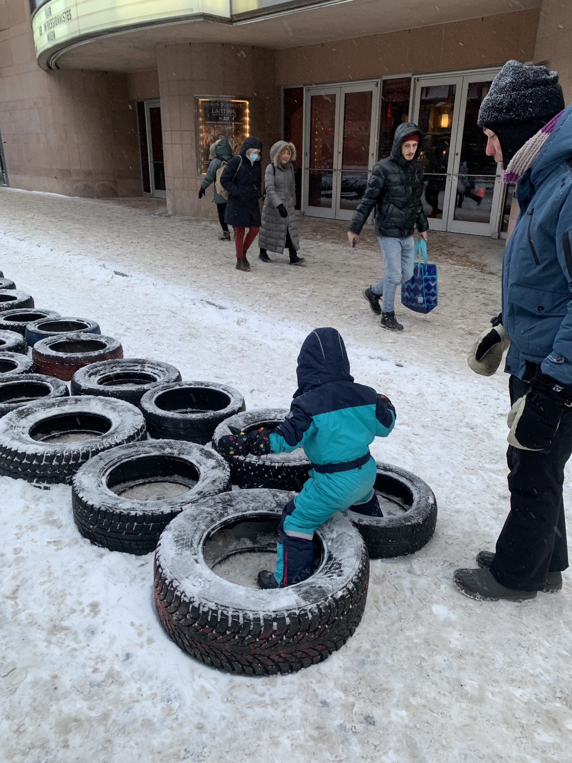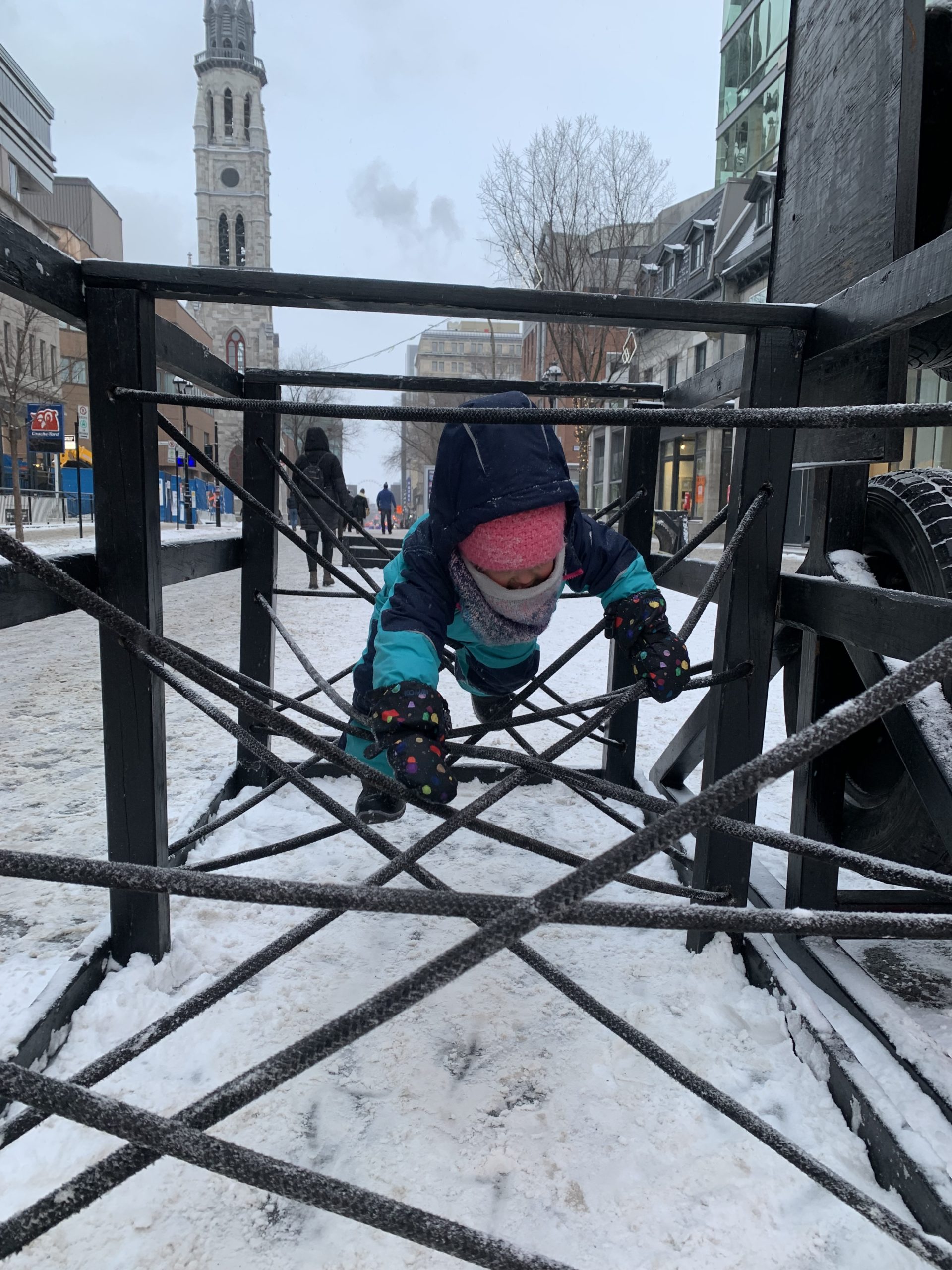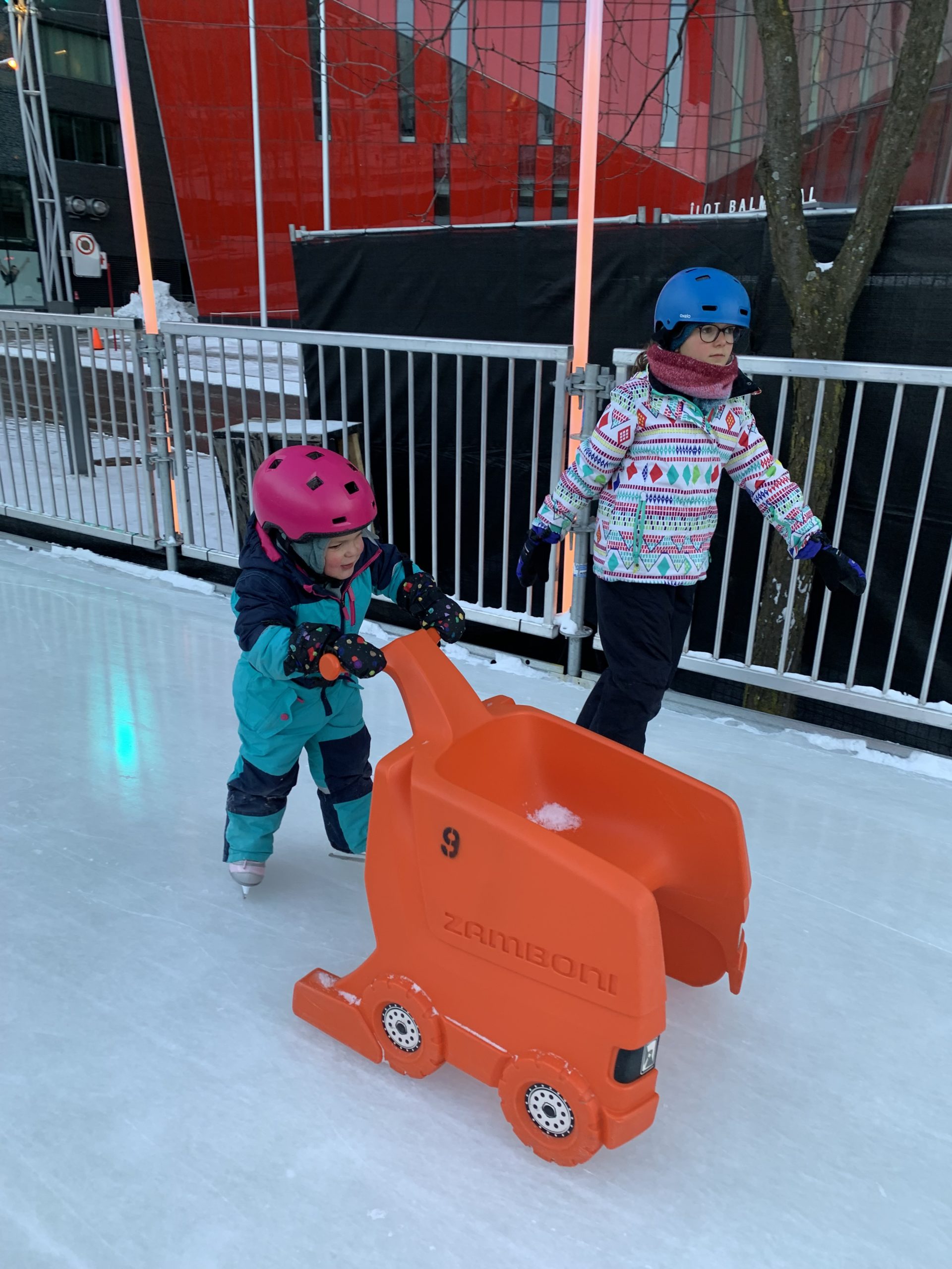 Vendredi soir, après la journée de garderie d’Odile, nous sommes allés faire du patin sur le sentier de patin de Montréal en lumières. Odile l’aime particulièrement car les supports de glisse pour enfants sont en accès libre. Les enfants ont testé toutes les combinaisons possibles 😉 Nous avons aussi mangé des queues de castor, et reçu des sachets de bonbons Haribo et fait un calin à l’ours.